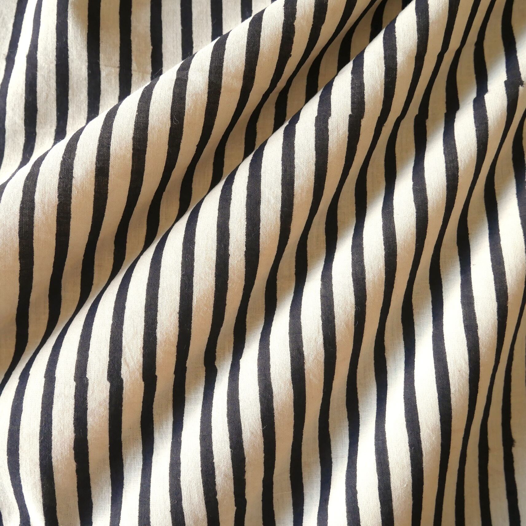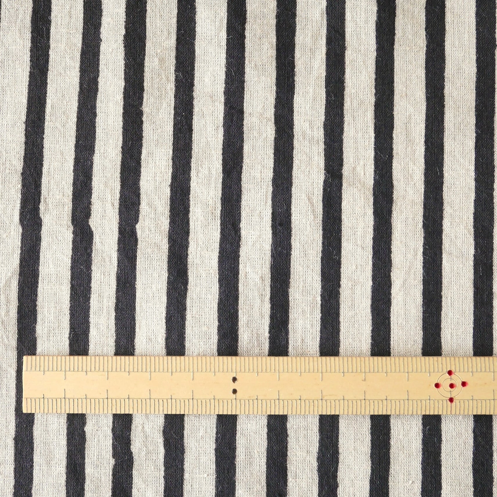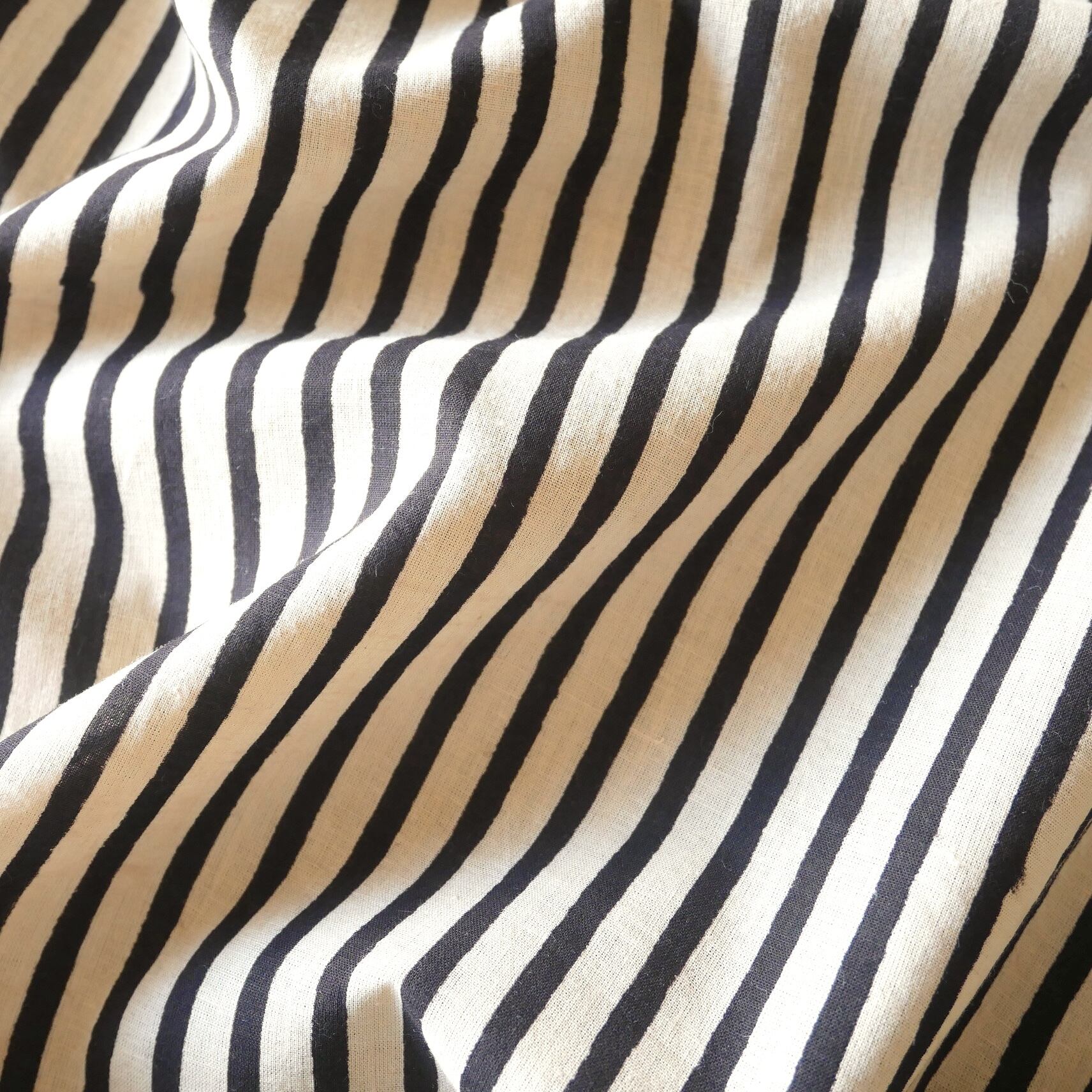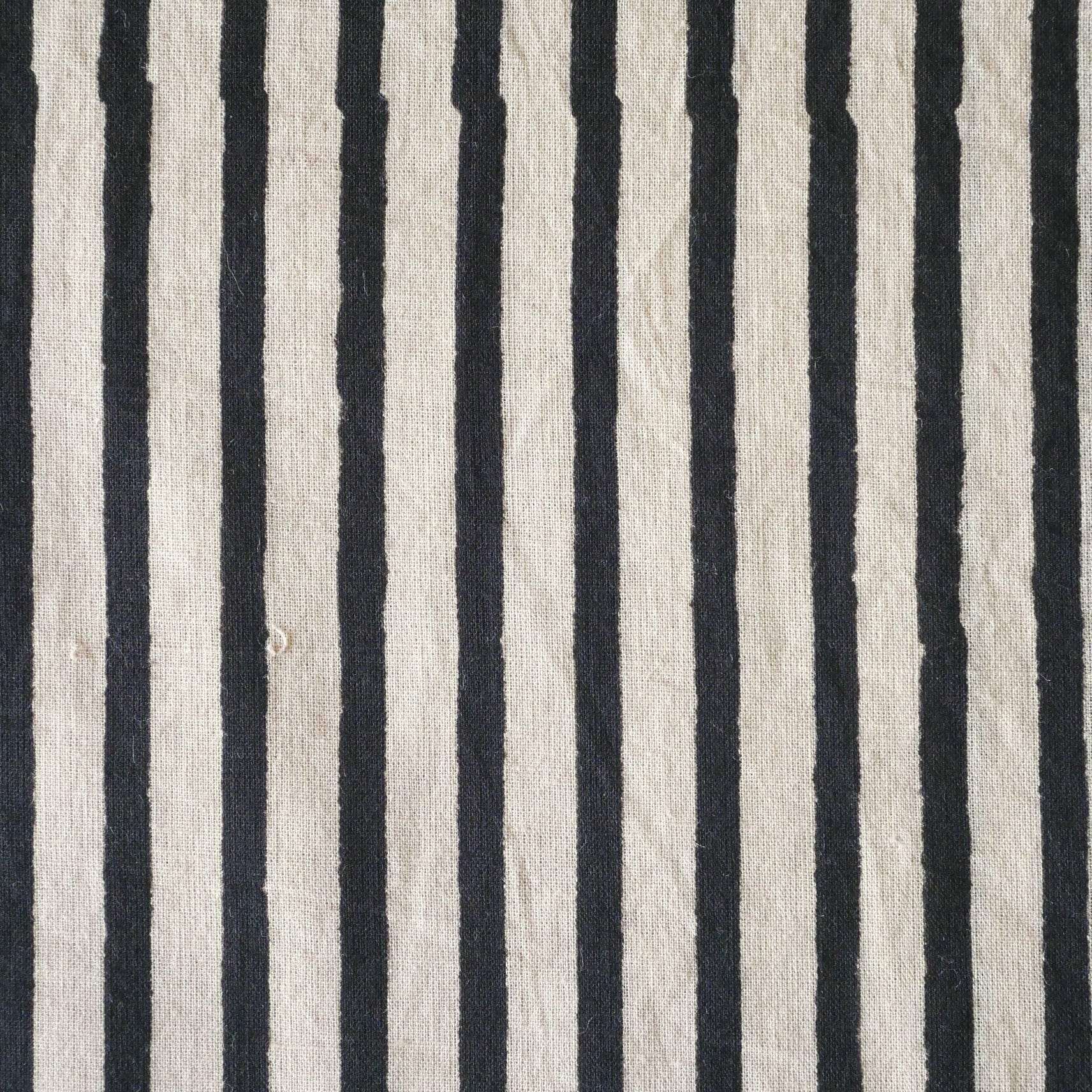 生成りに近いナチュラルなベースに、深みのあるブラックのストライプがすっきりと並んだインド・バグル地方のハンドブロックプリント生地です。