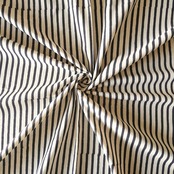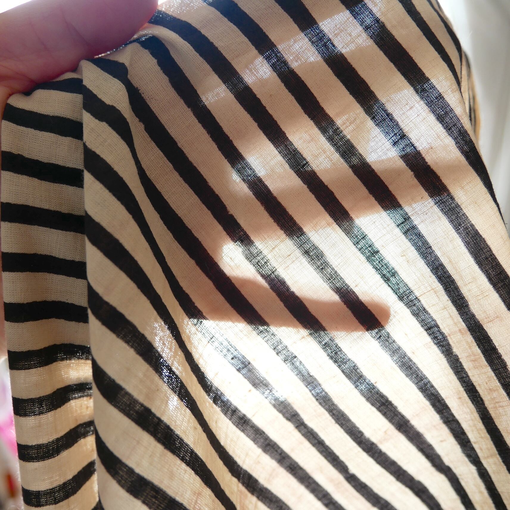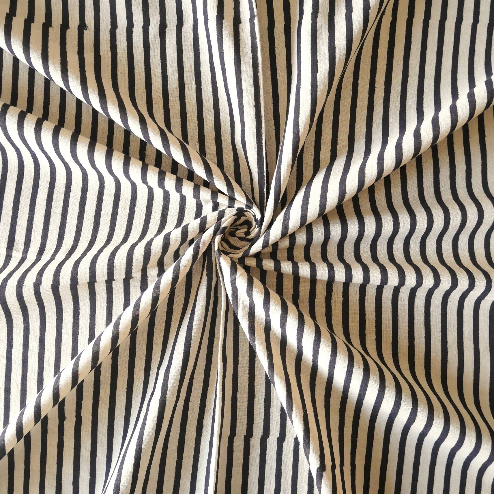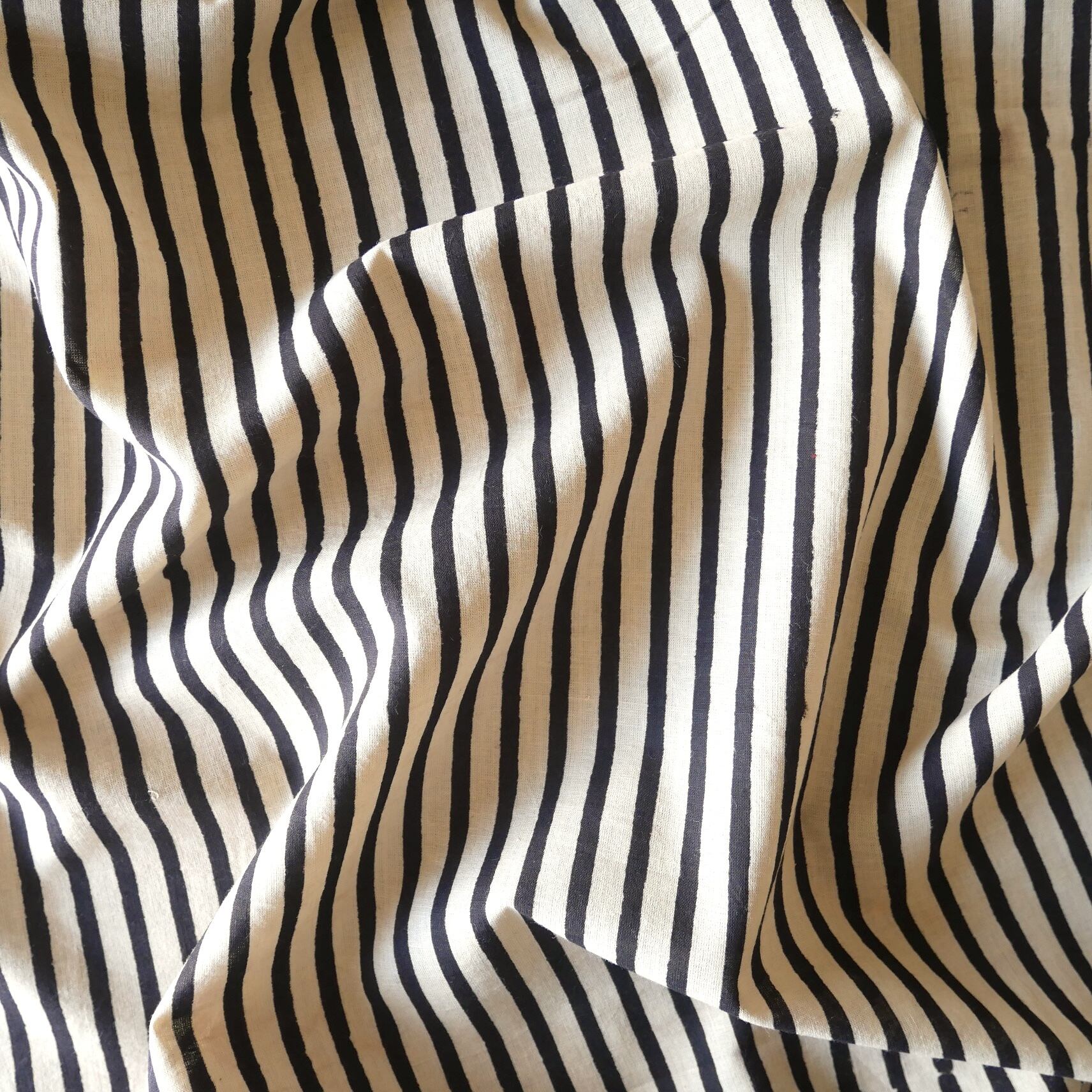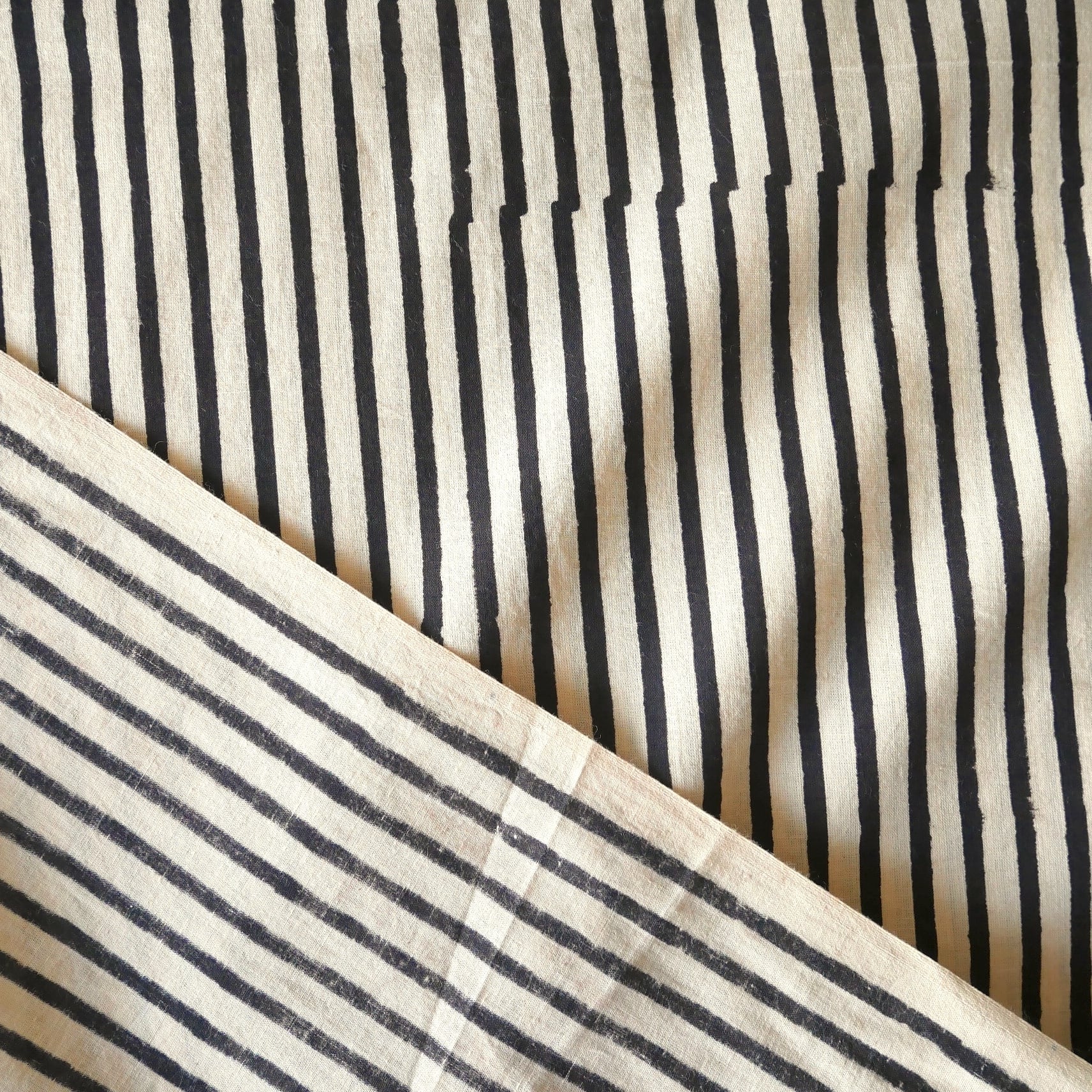 生成りに近いナチュラルなベースに、深みのあるブラックのストライプがすっきりと並んだインド・バグル地方のハンドブロックプリント生地です。