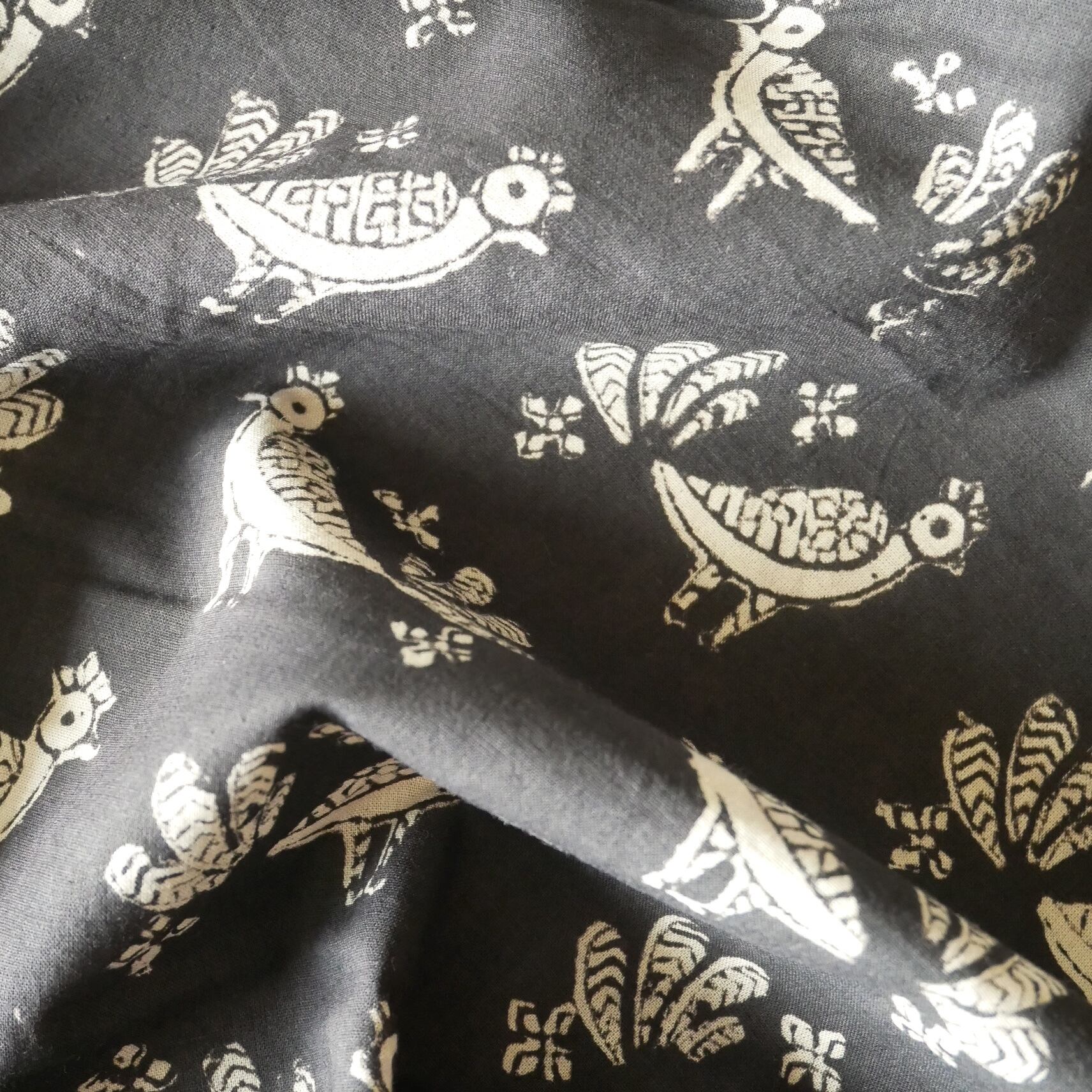 深みのあるブラックベースに、孔雀のようにも見える小鳥モチーフが並んだ可愛らしいブロックプリント生地です。