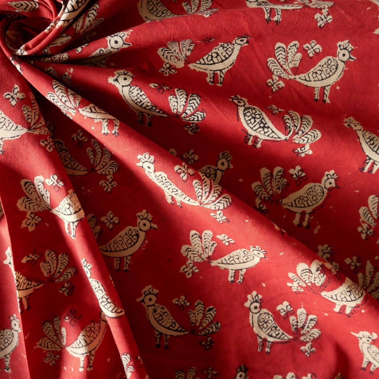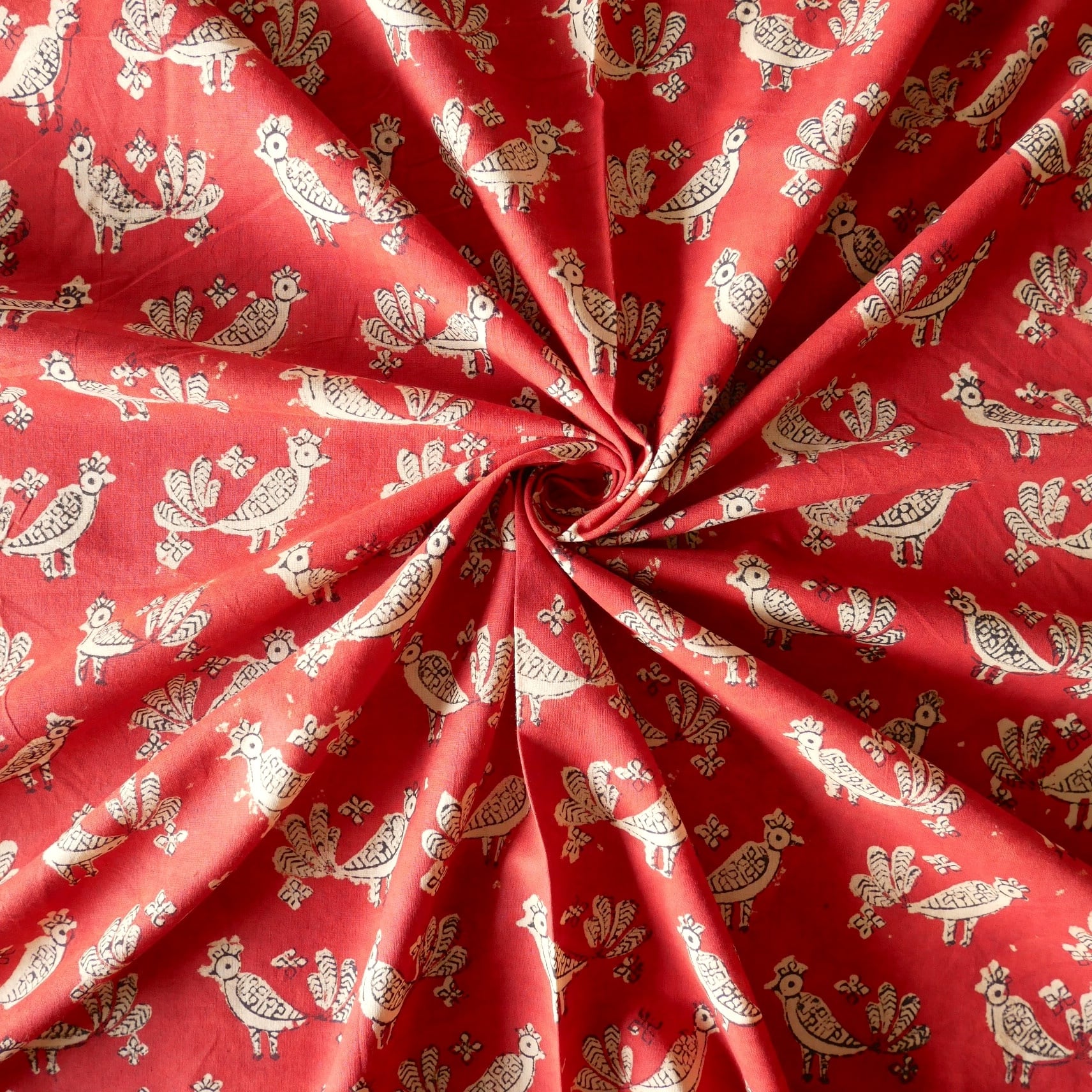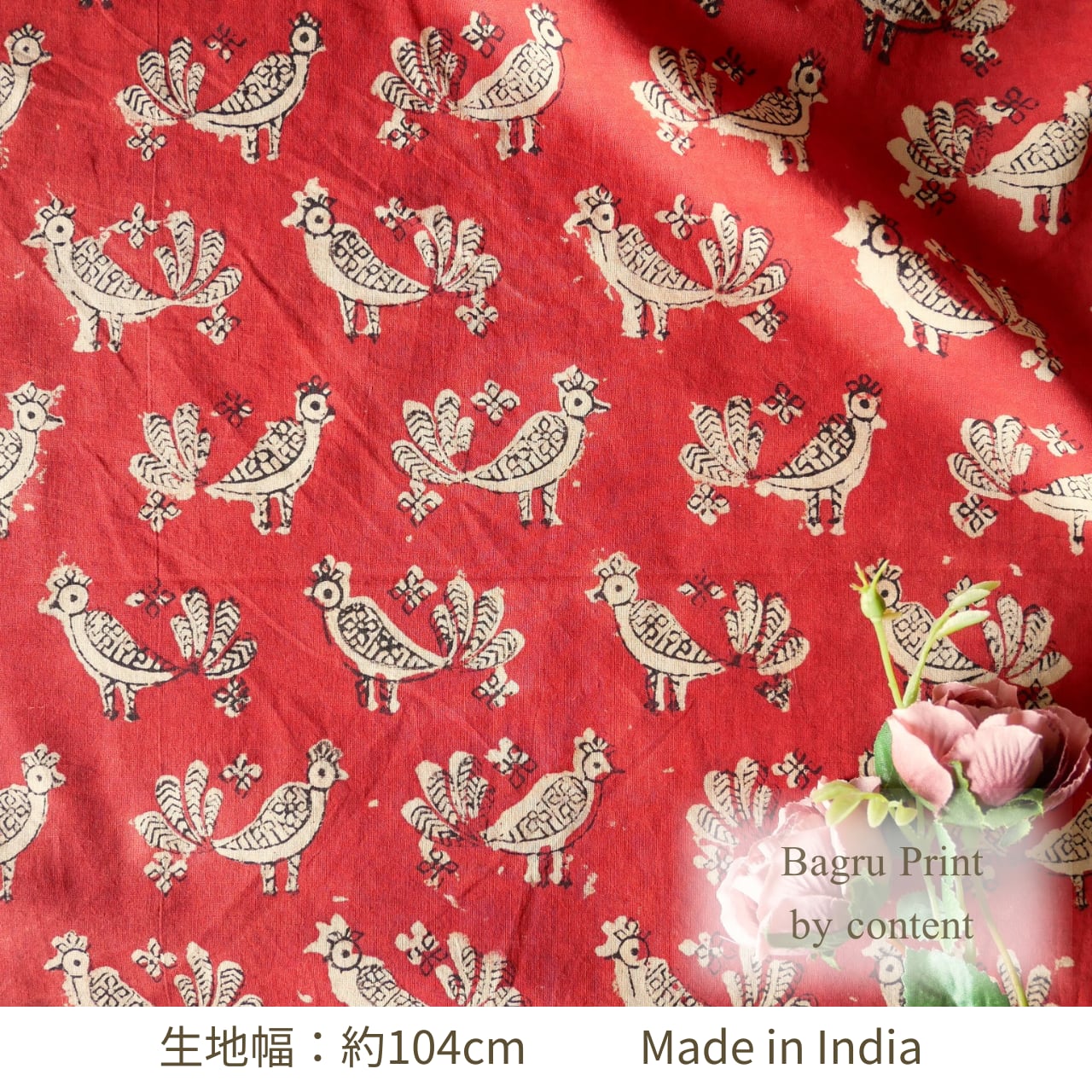 ハンドブロックプリント生地 インド更紗 綿生地 Bagru レッドベース×小鳥柄 薄手コットン JE-251008