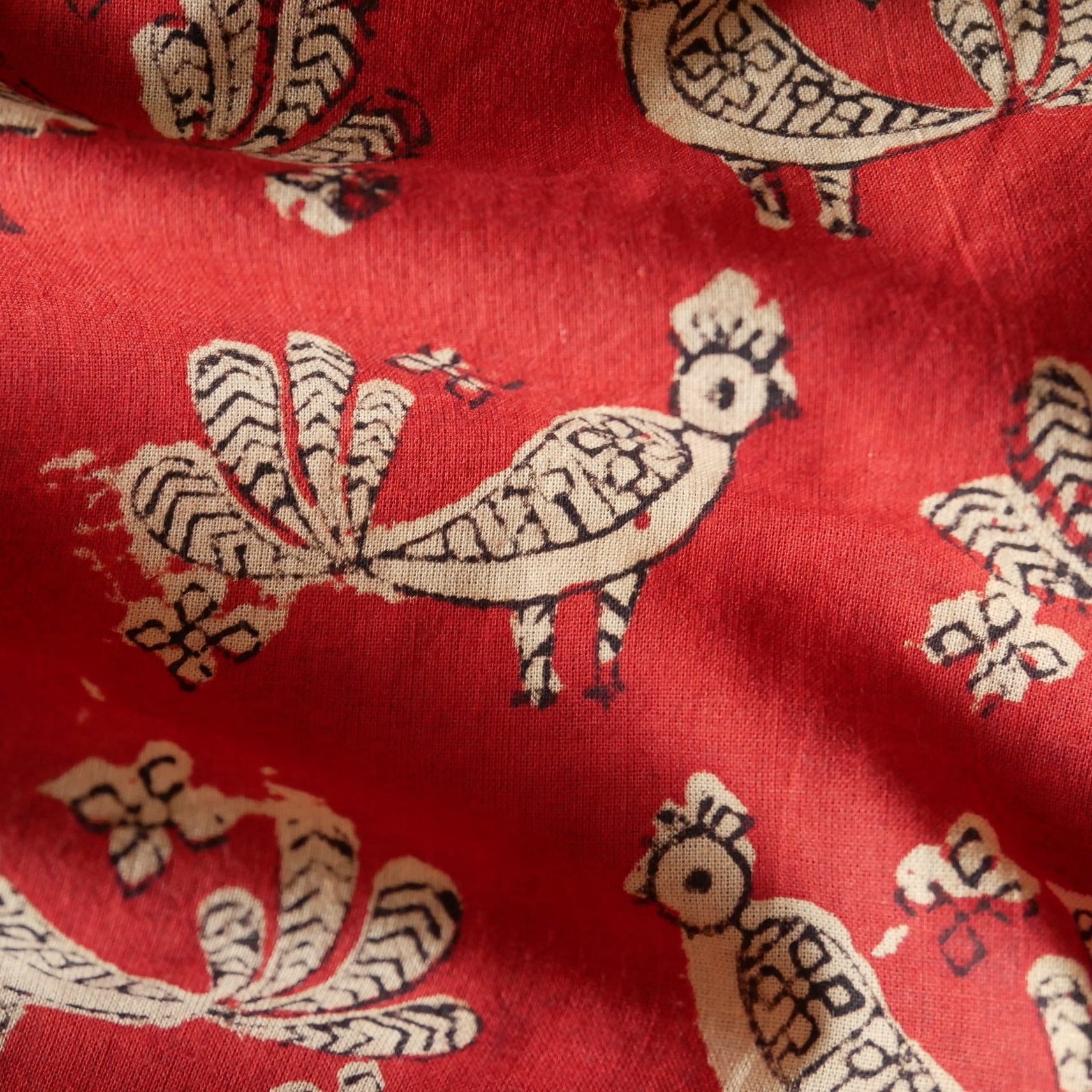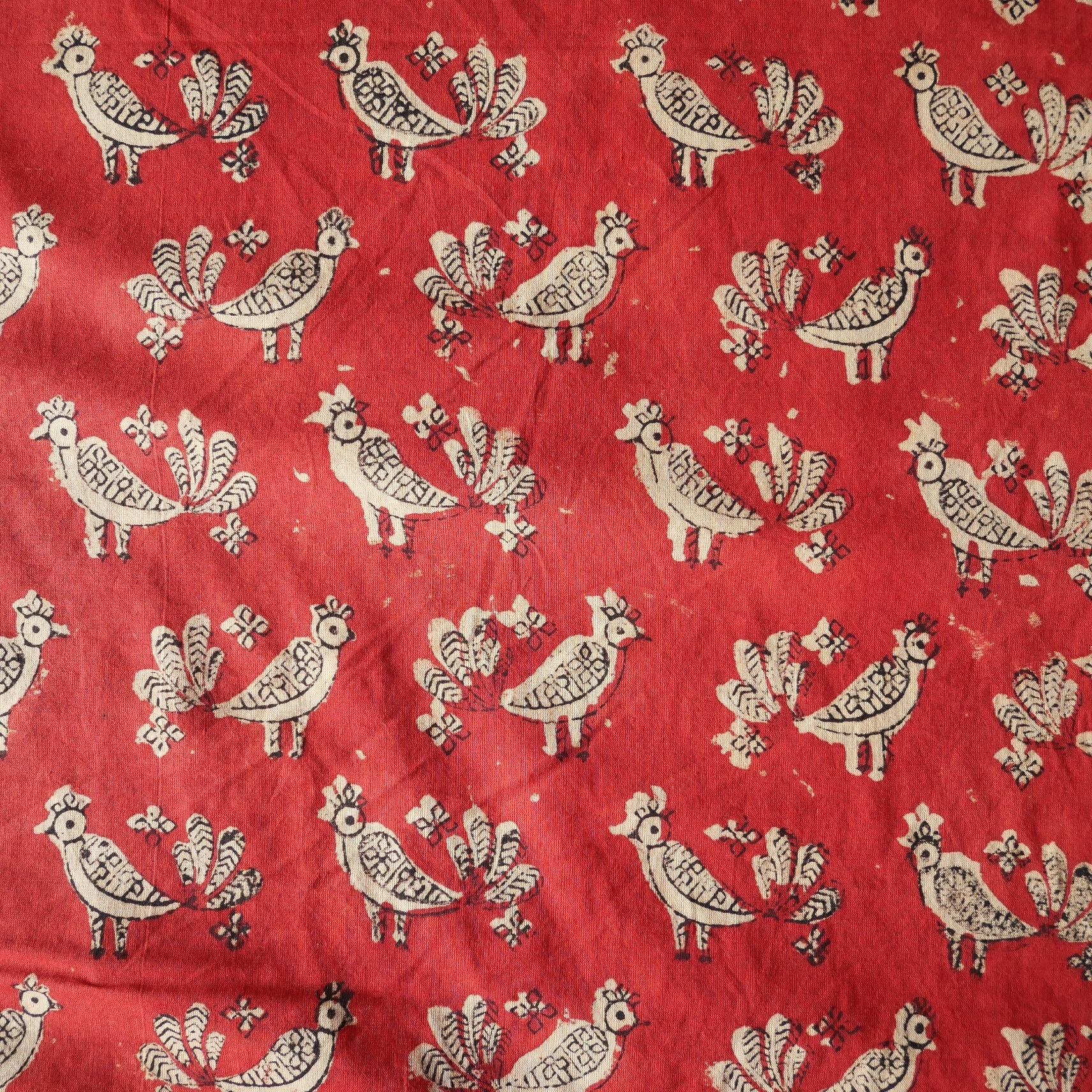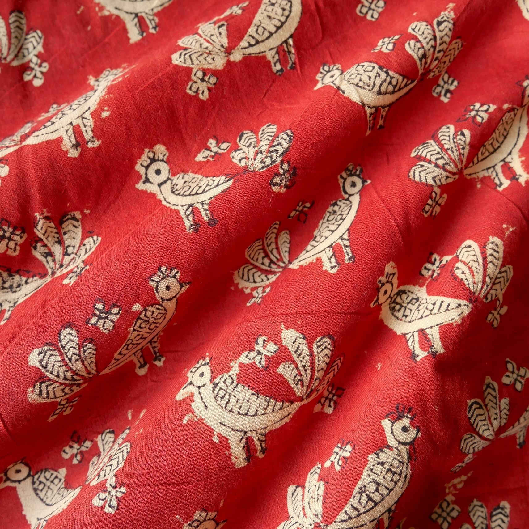 ハンドブロックプリント生地 インド更紗 綿生地 Bagru レッドベース×小鳥柄 薄手コットン JE-251008