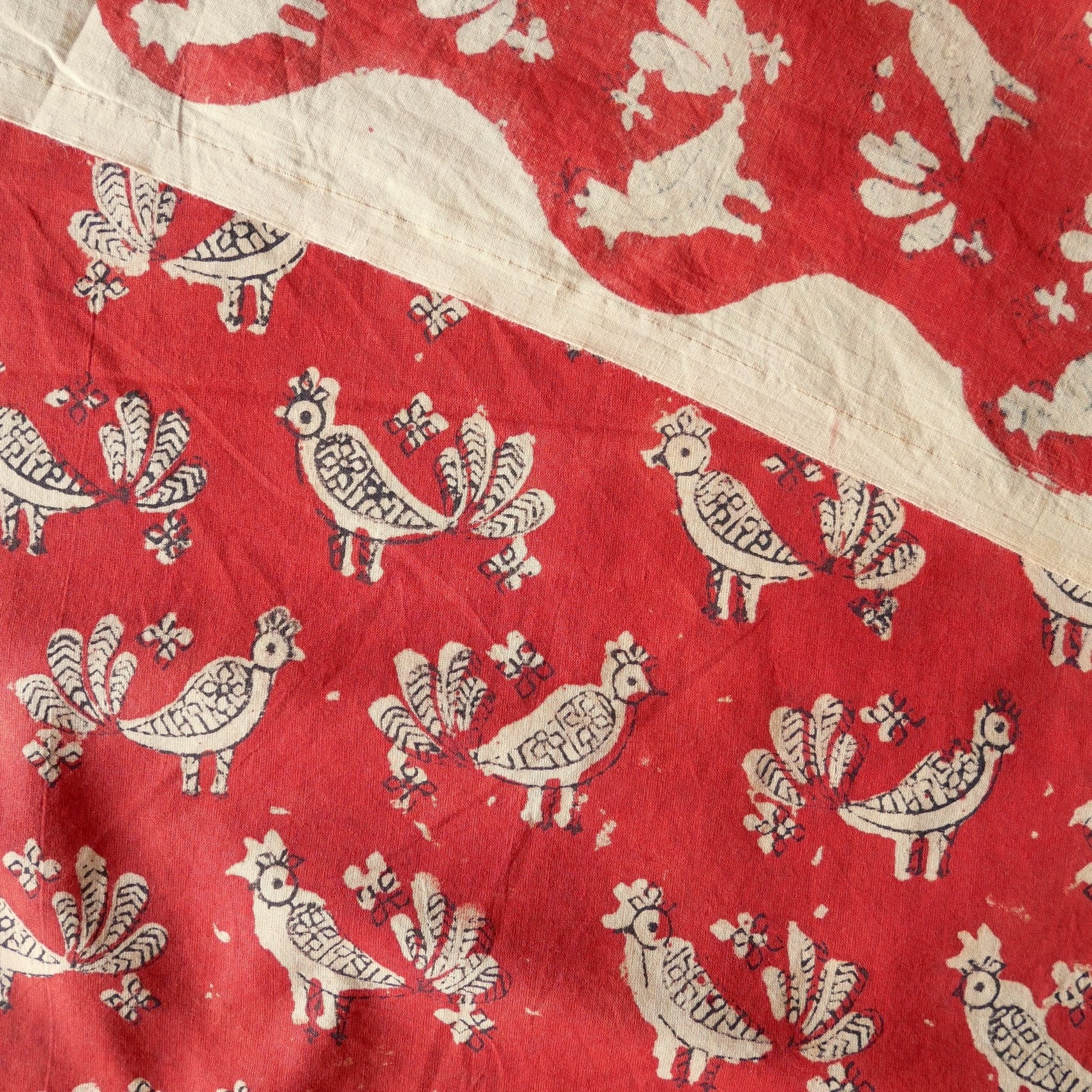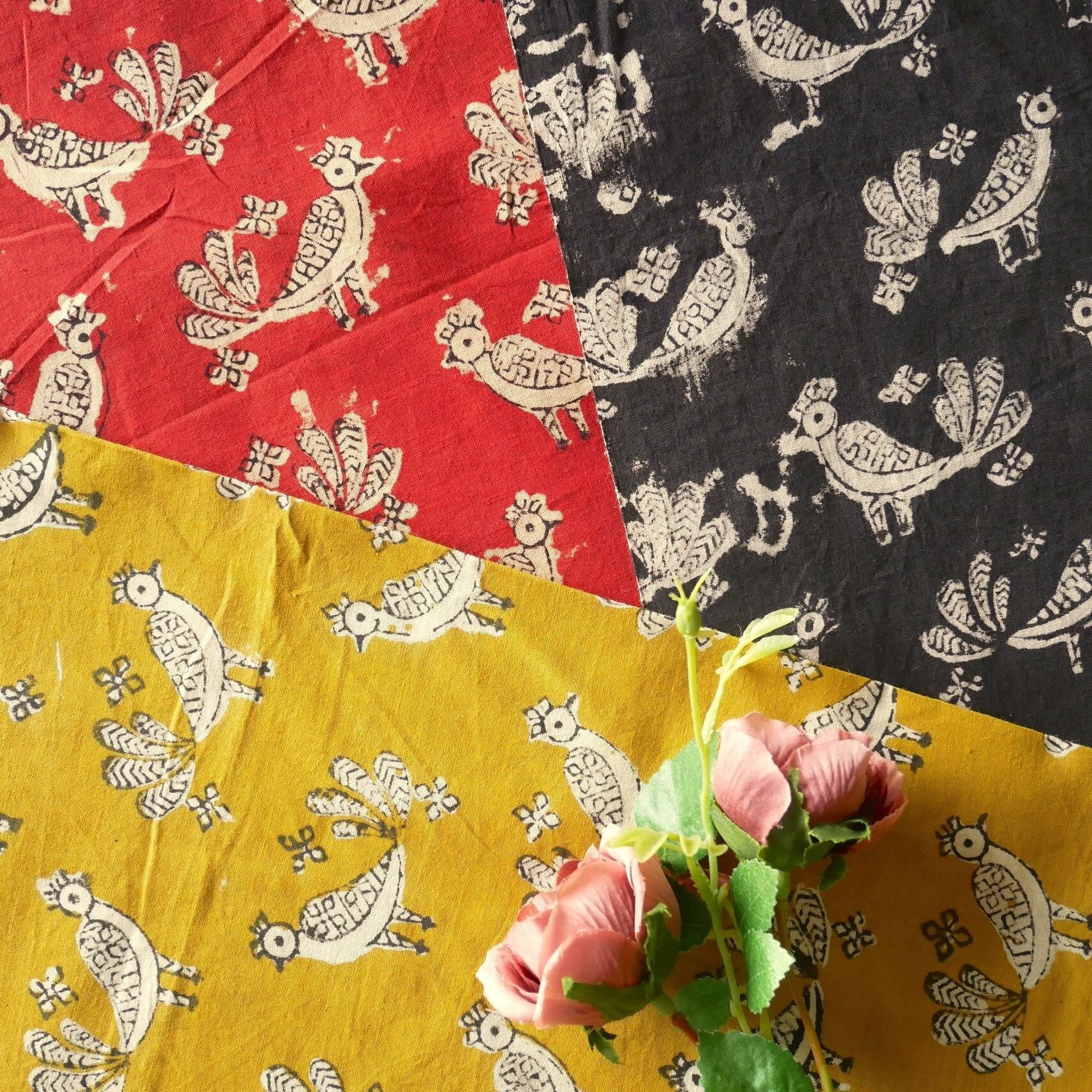 ◾️華やかな赤に映える小鳥モチーフのハンドブロックプリント生地