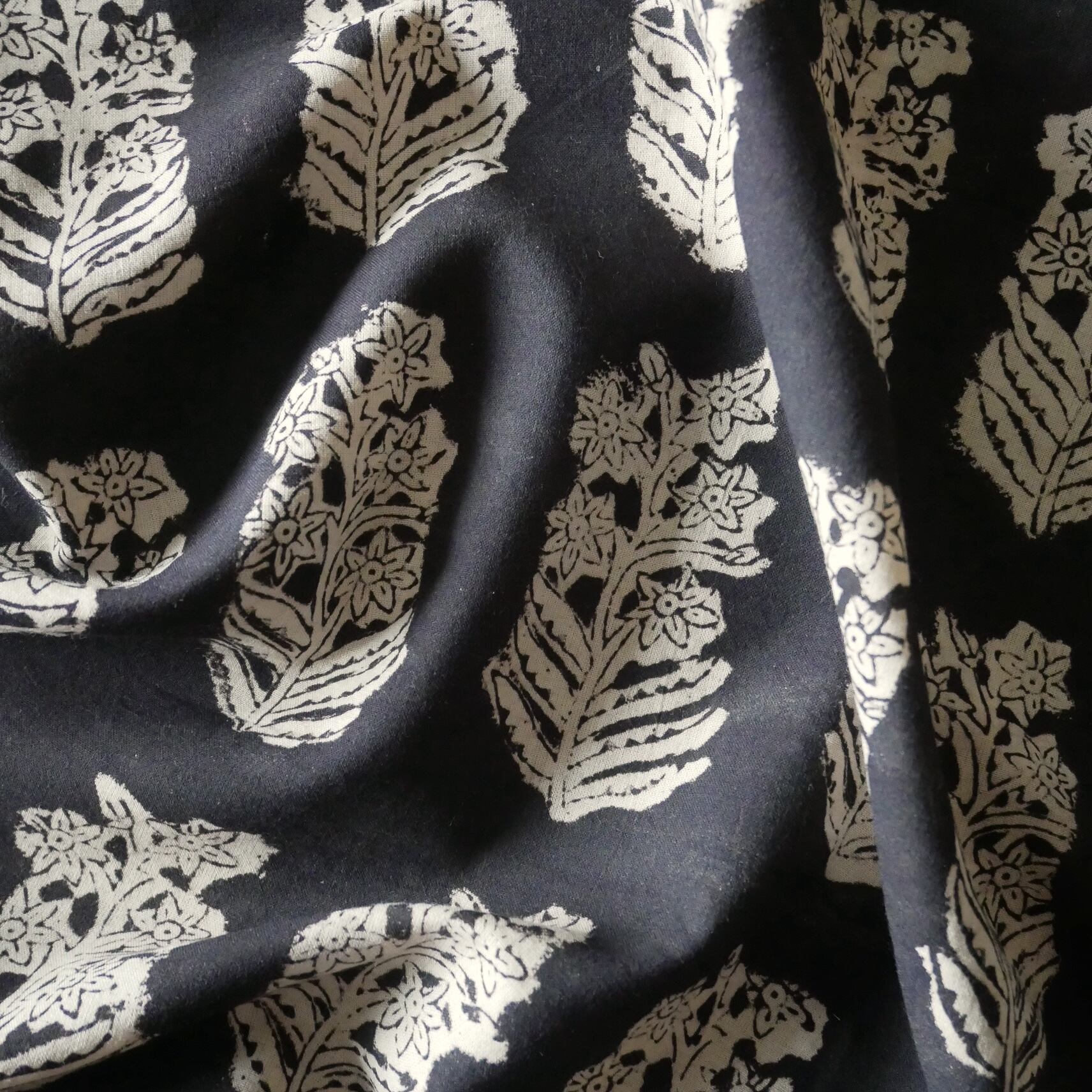 ◾️深みのある黒に映える、伸びやかに咲く花々。個性と上品さをあわせ持つ、Bagru(バグルー)のハンドブロックプリント生地。