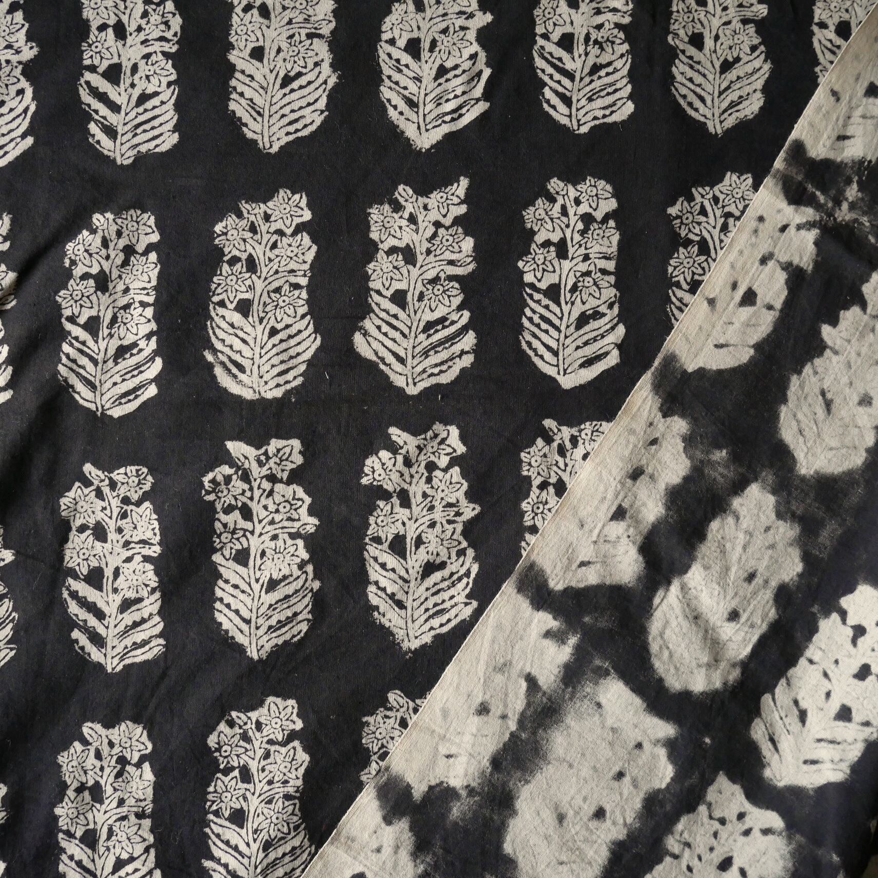 落ち着いたブラックをベースに、やや大きめの花模様が縦に並ぶ、Bagru(バグルー)地方の伝統的なハンドブロックプリント生地です。