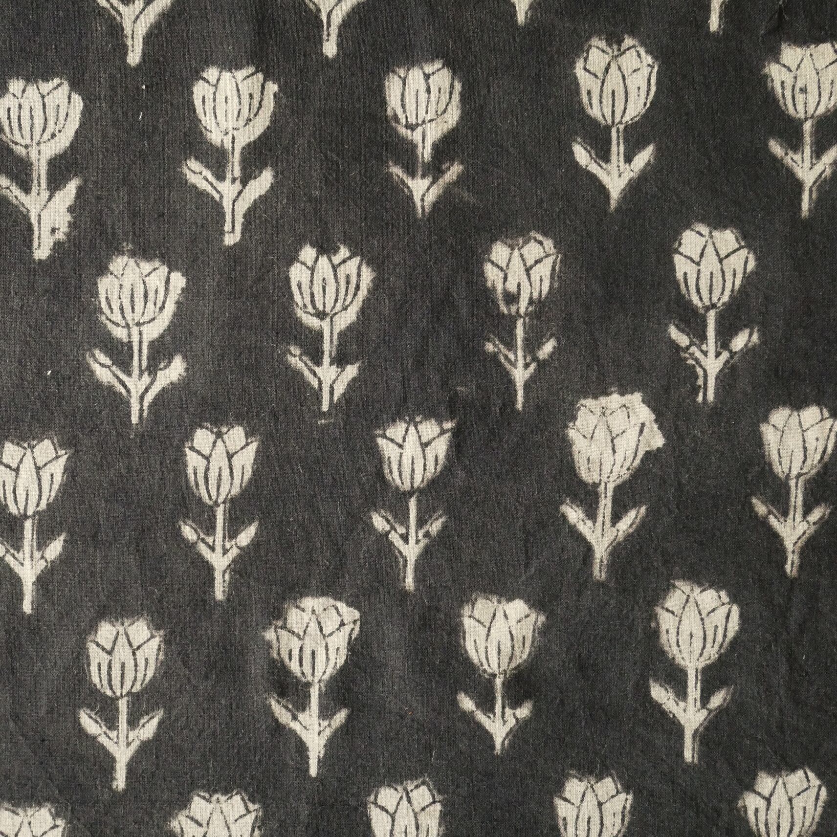 ハンドブロックプリント生地 インド更紗 綿生地 Bagru ブラックベース×チューリップモチーフ 薄手コットン JE-251010
