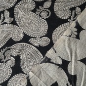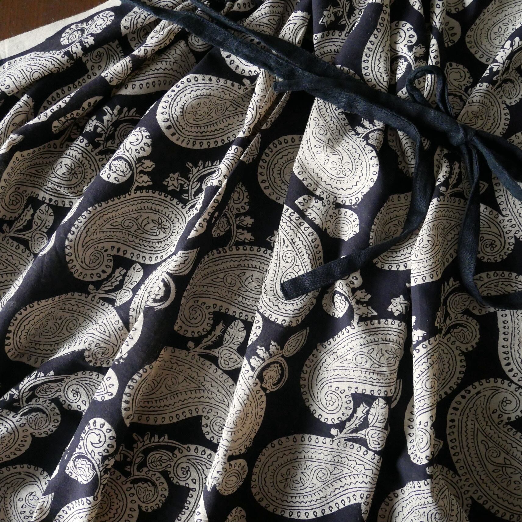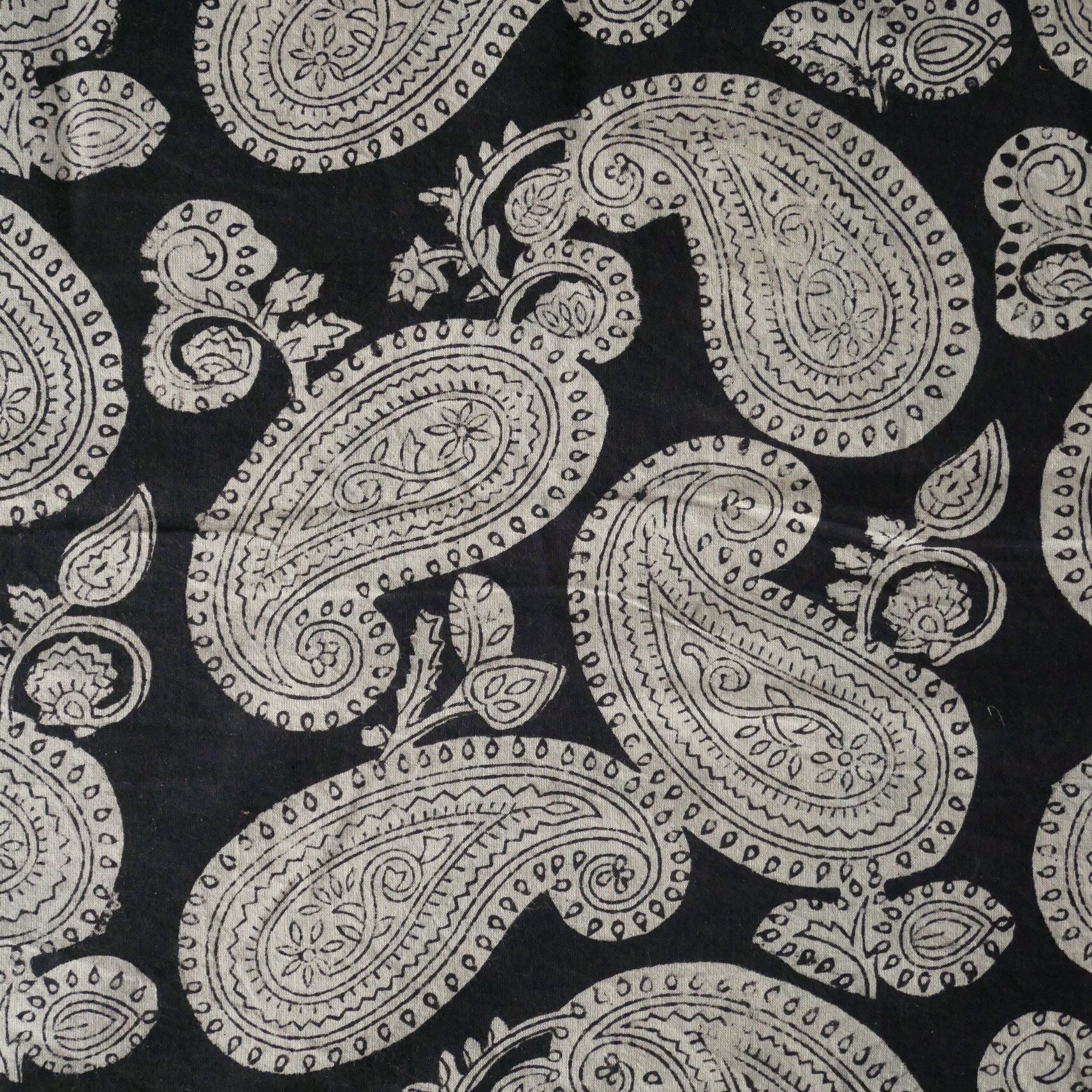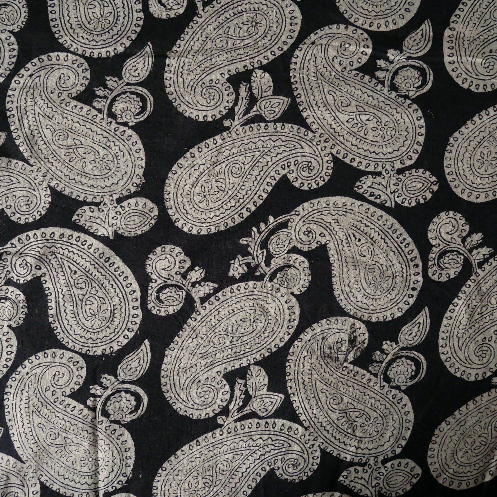 落ち着いたブラックをベースに、大ぶりのペイズリーモチーフが並ぶ、Bagru(バグルー)地方の伝統的なハンドブロックプリント生地です。