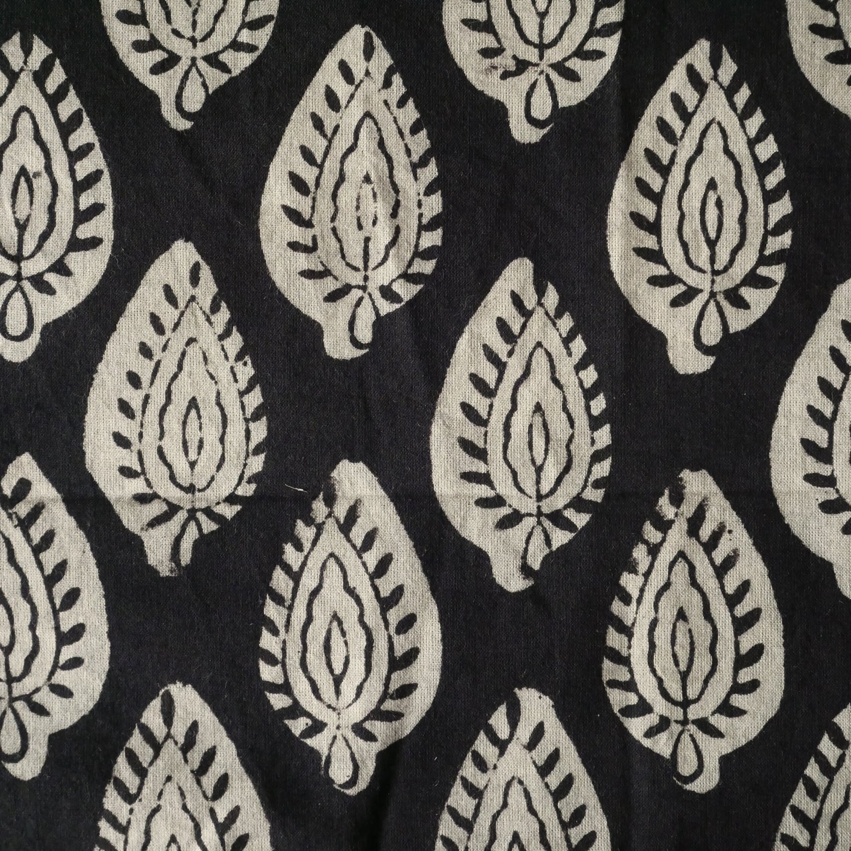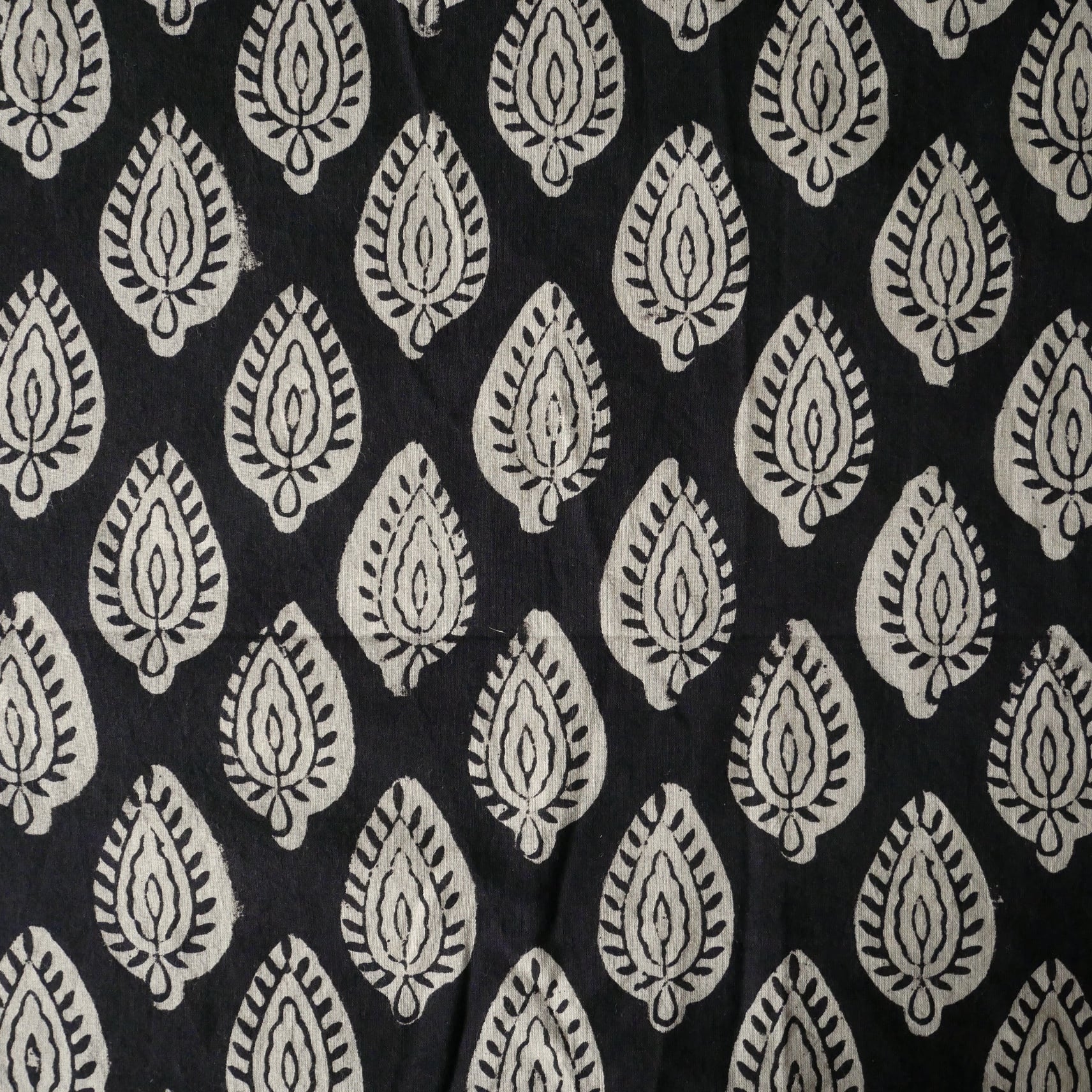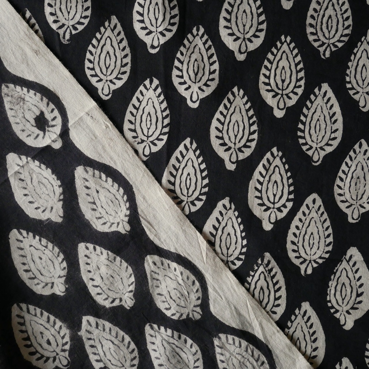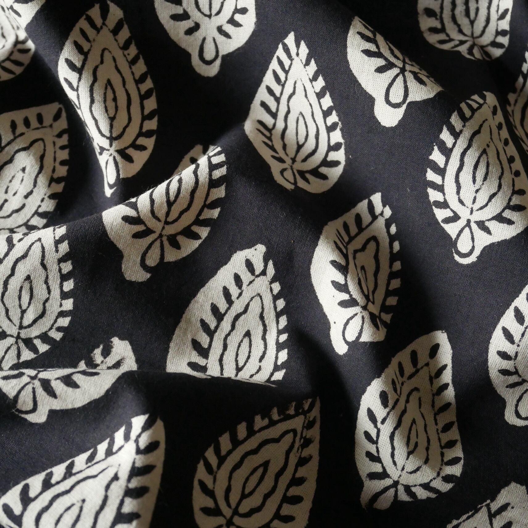 ◾️深みのある黒、静かで力強いリーフ模様。シンプルさの中に美しさが息づく、Bagru(バグルー)のハンドブロックプリント生地。