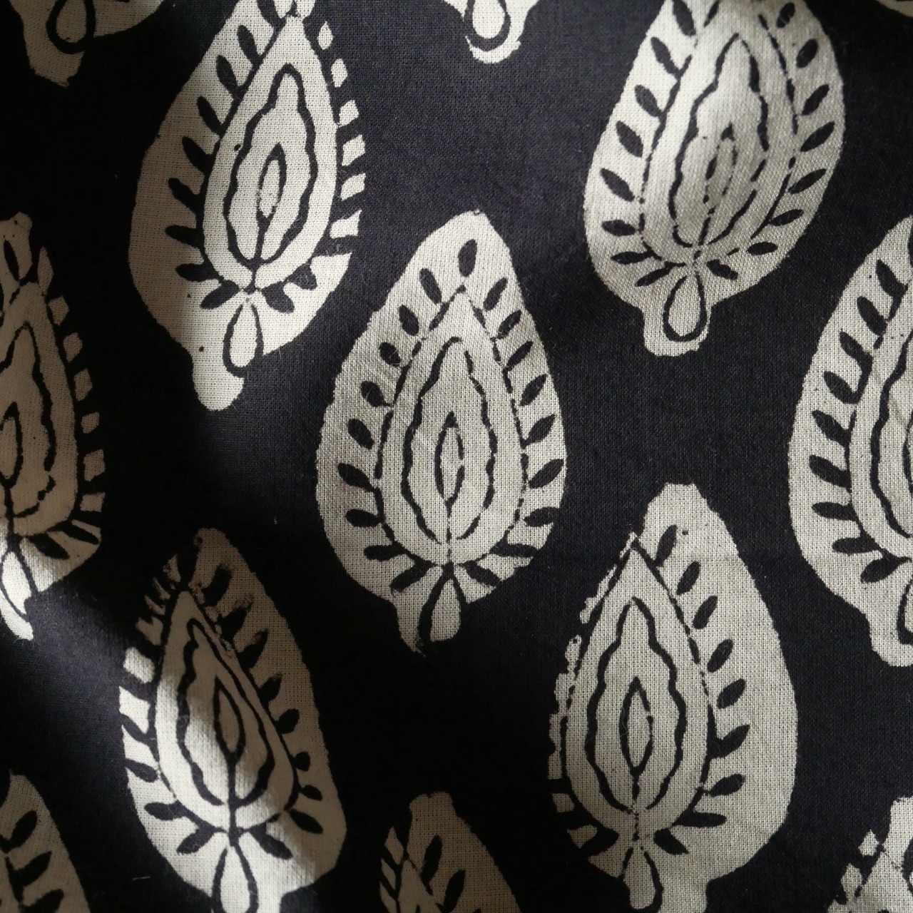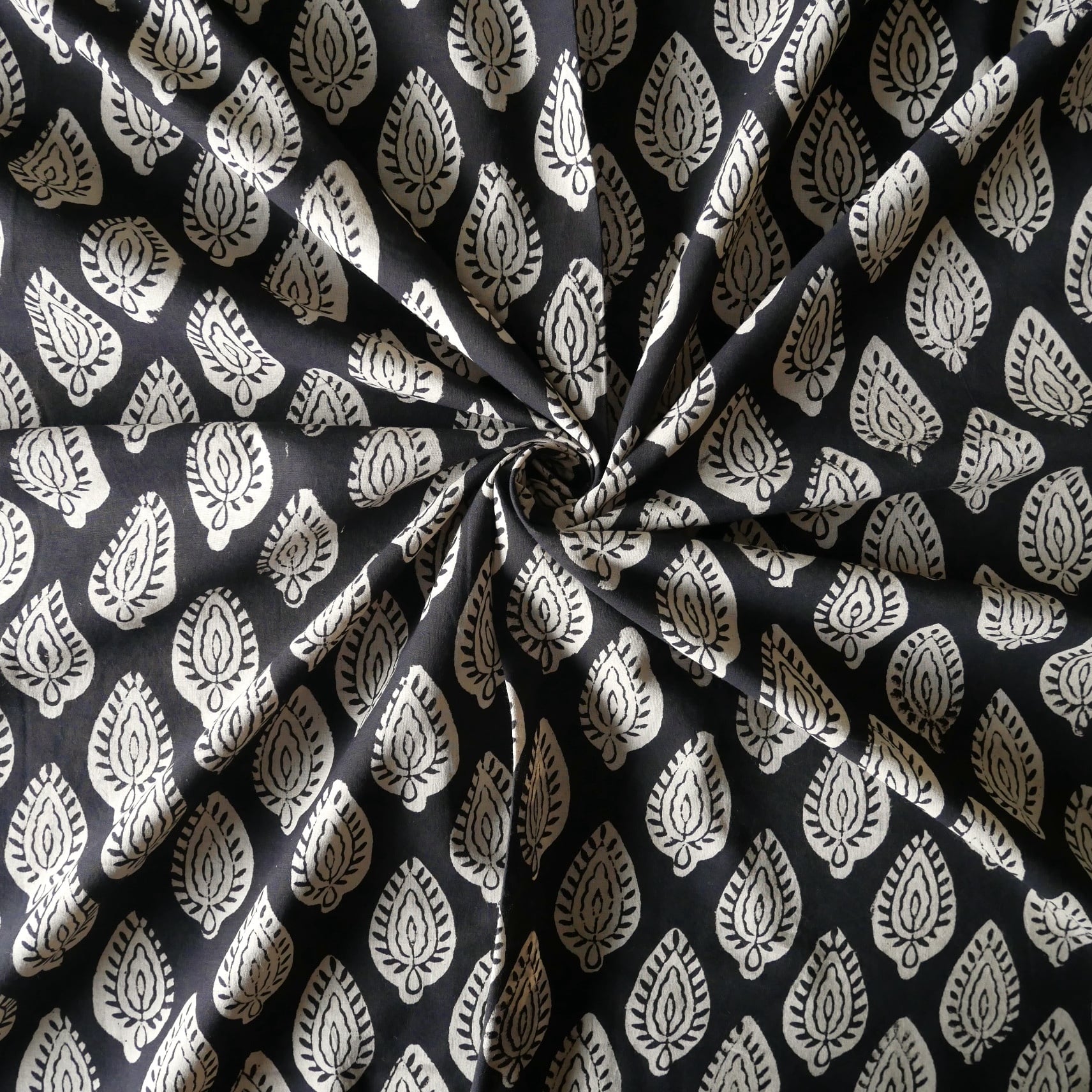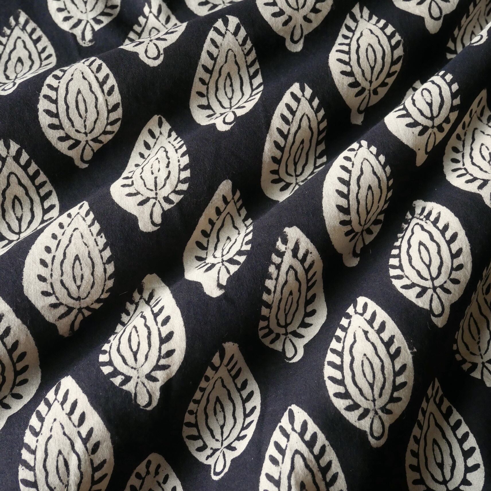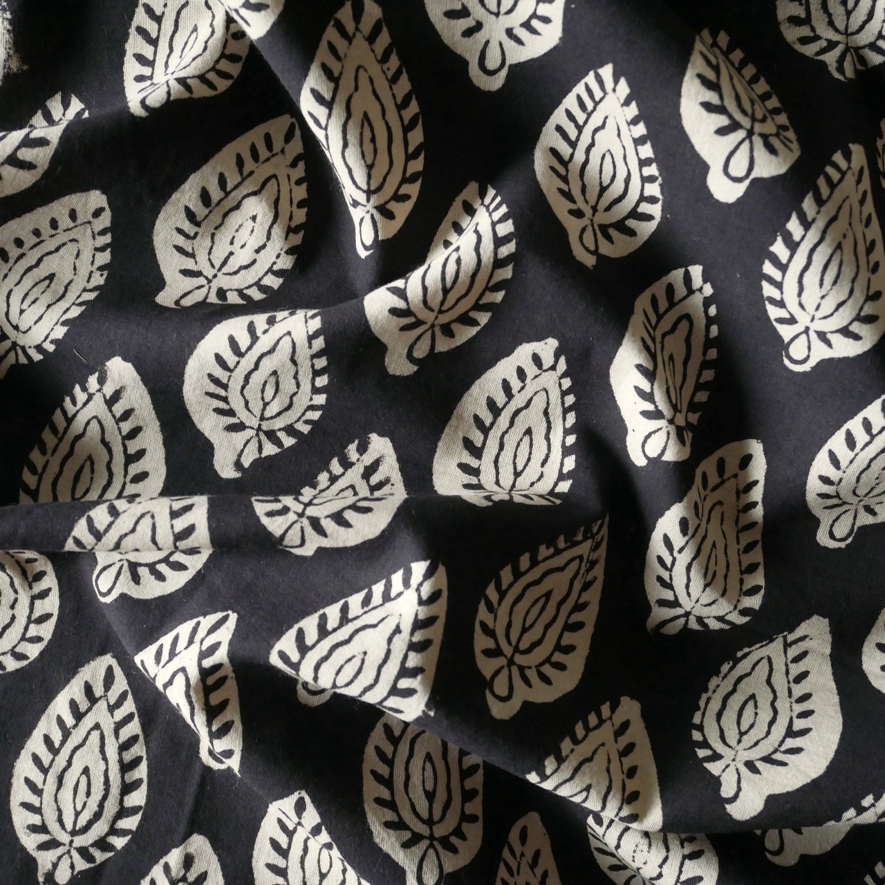 ◾️深みのある黒、静かで力強いリーフ模様。シンプルさの中に美しさが息づく、Bagru(バグルー)のハンドブロックプリント生地。