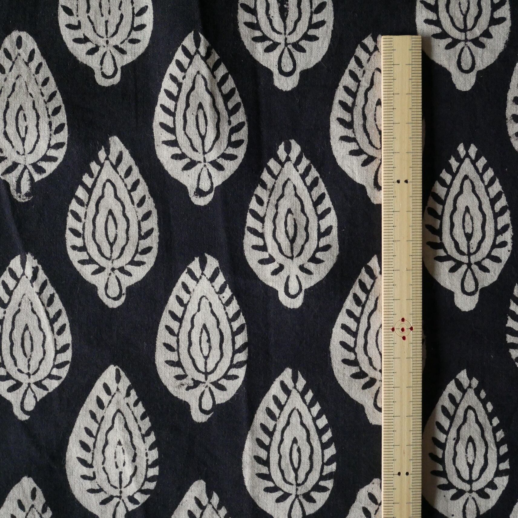 落ち着いたブラックをベースに、整然と並ぶリーフ(葉)モチーフが印象的な、Bagru(バグルー)地方の伝統的なハンドブロックプリント生地です。