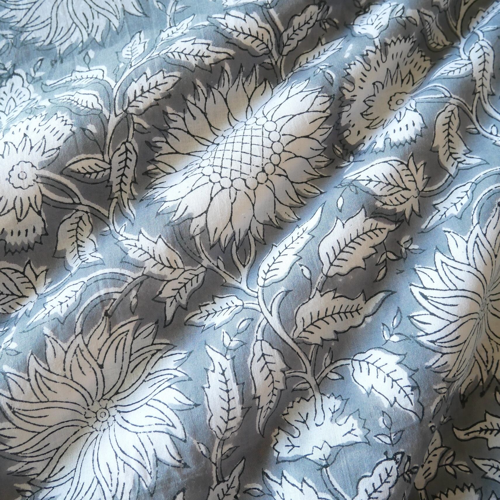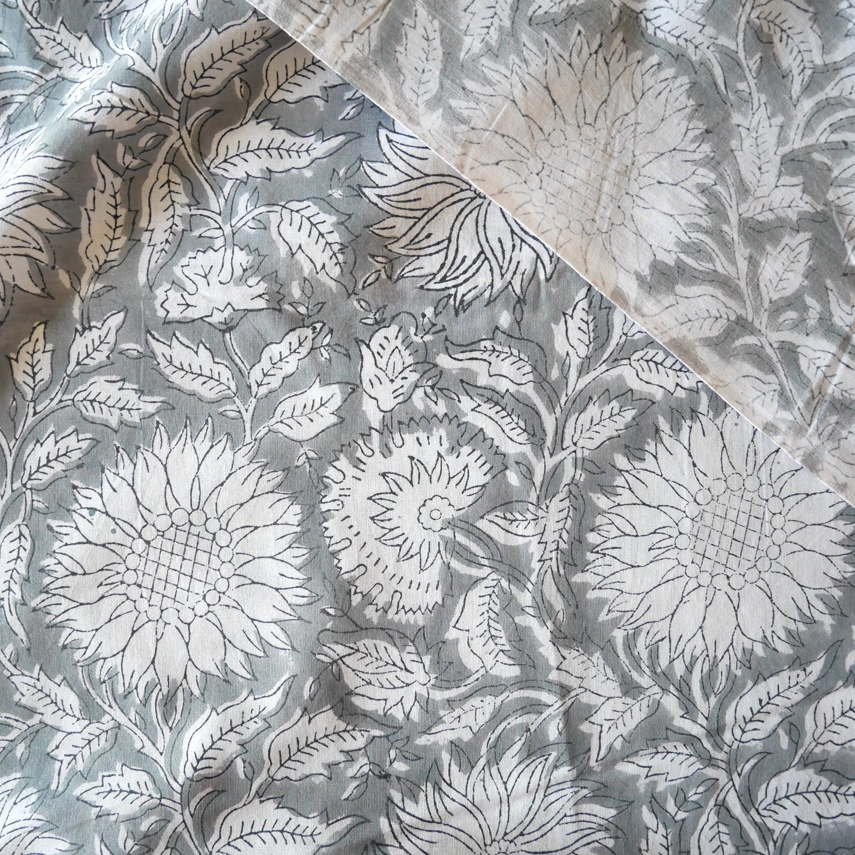 穏やかなグレーベースに、白抜きで描かれたボタニカルフラワーがやさしく浮かぶブロックプリント生地です。