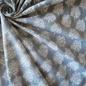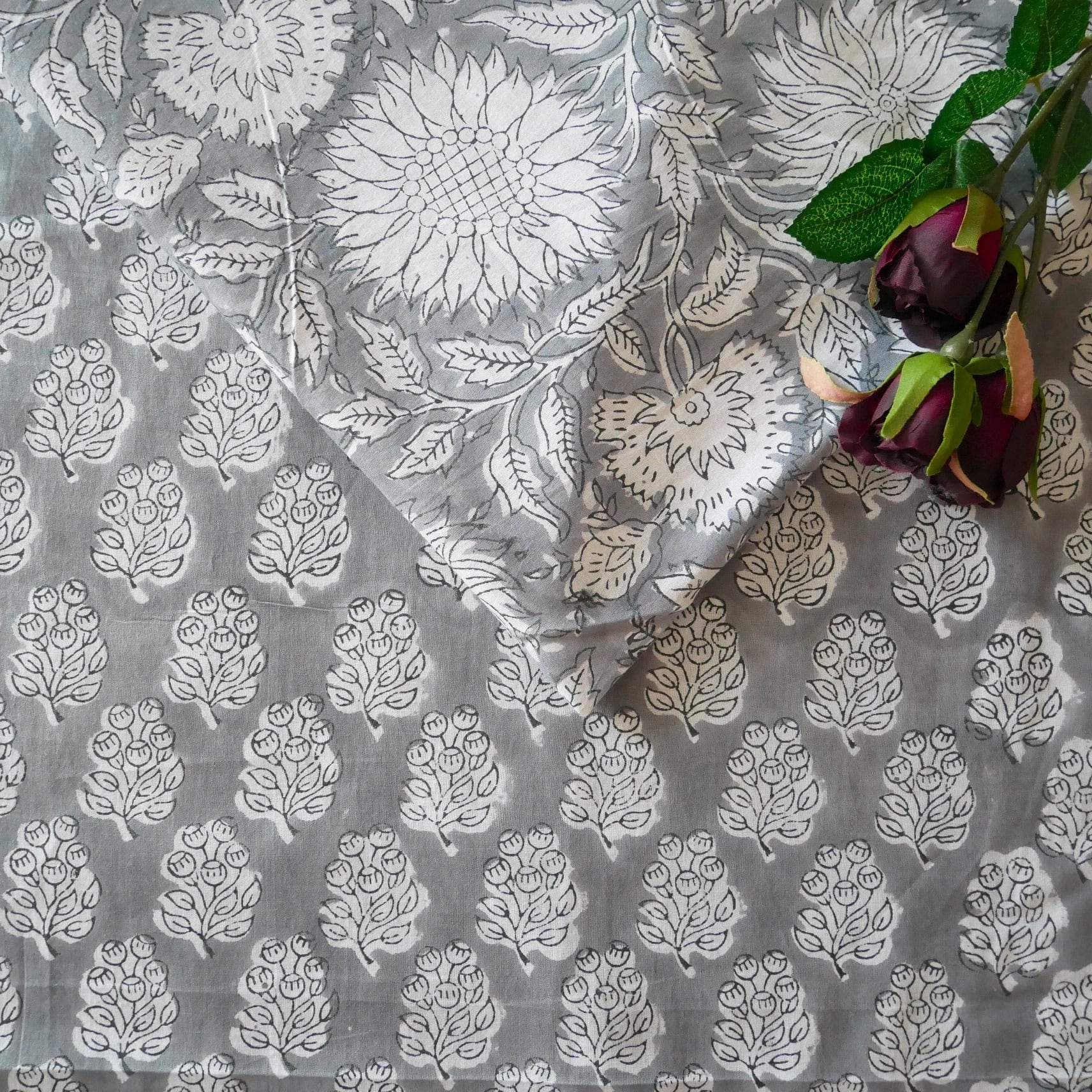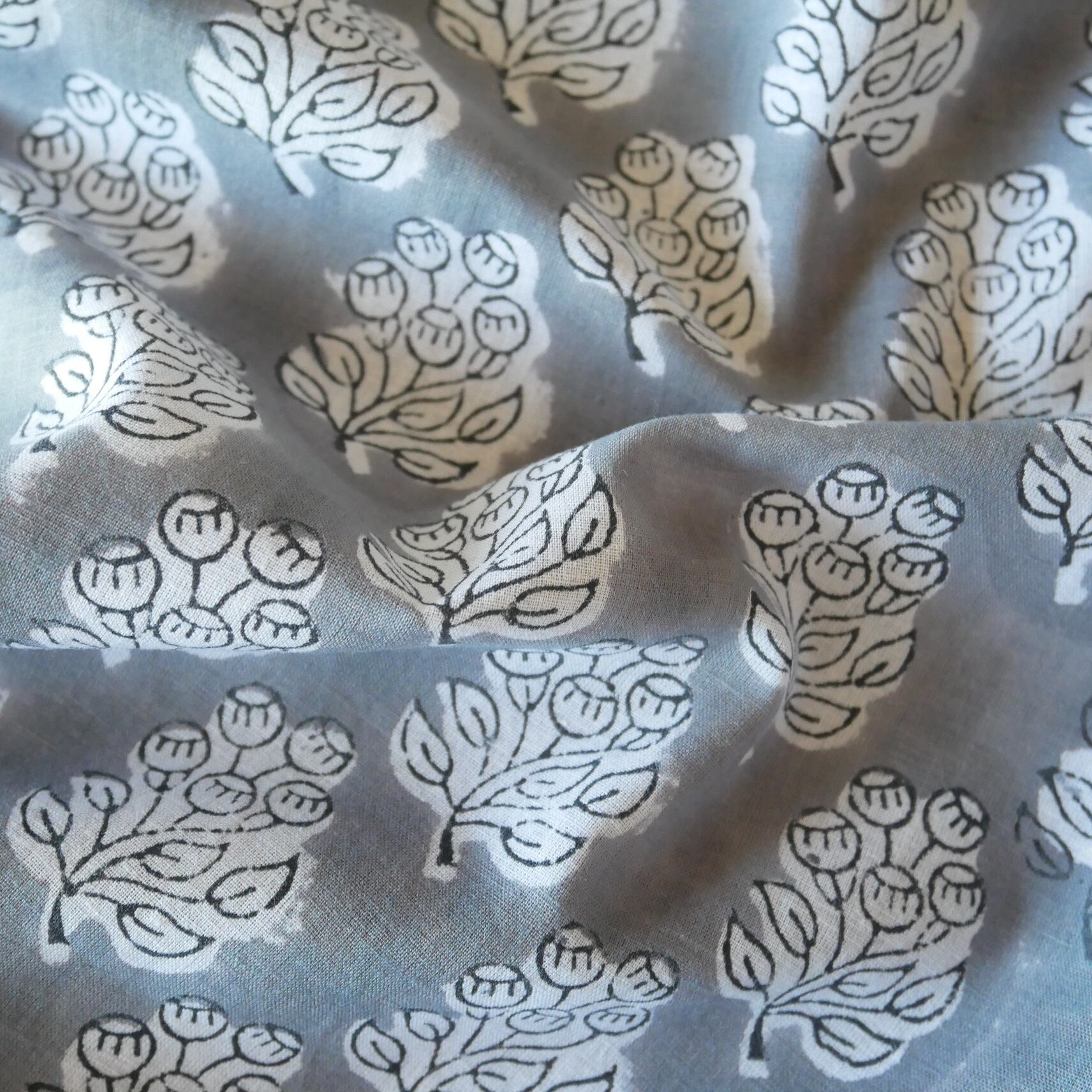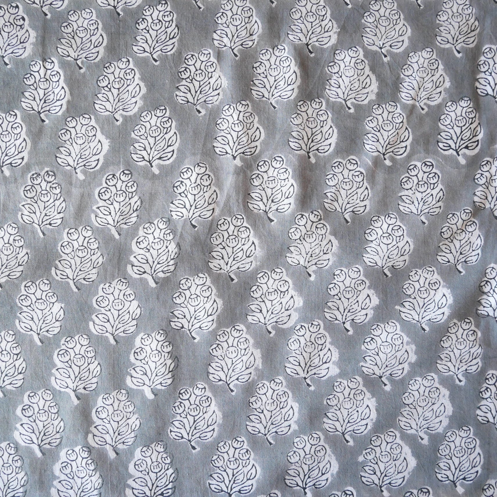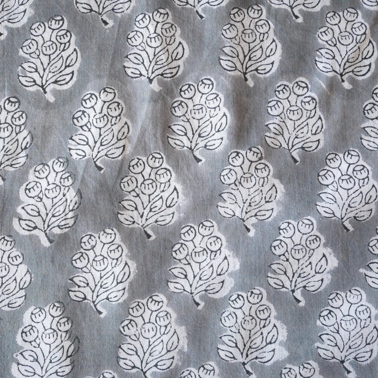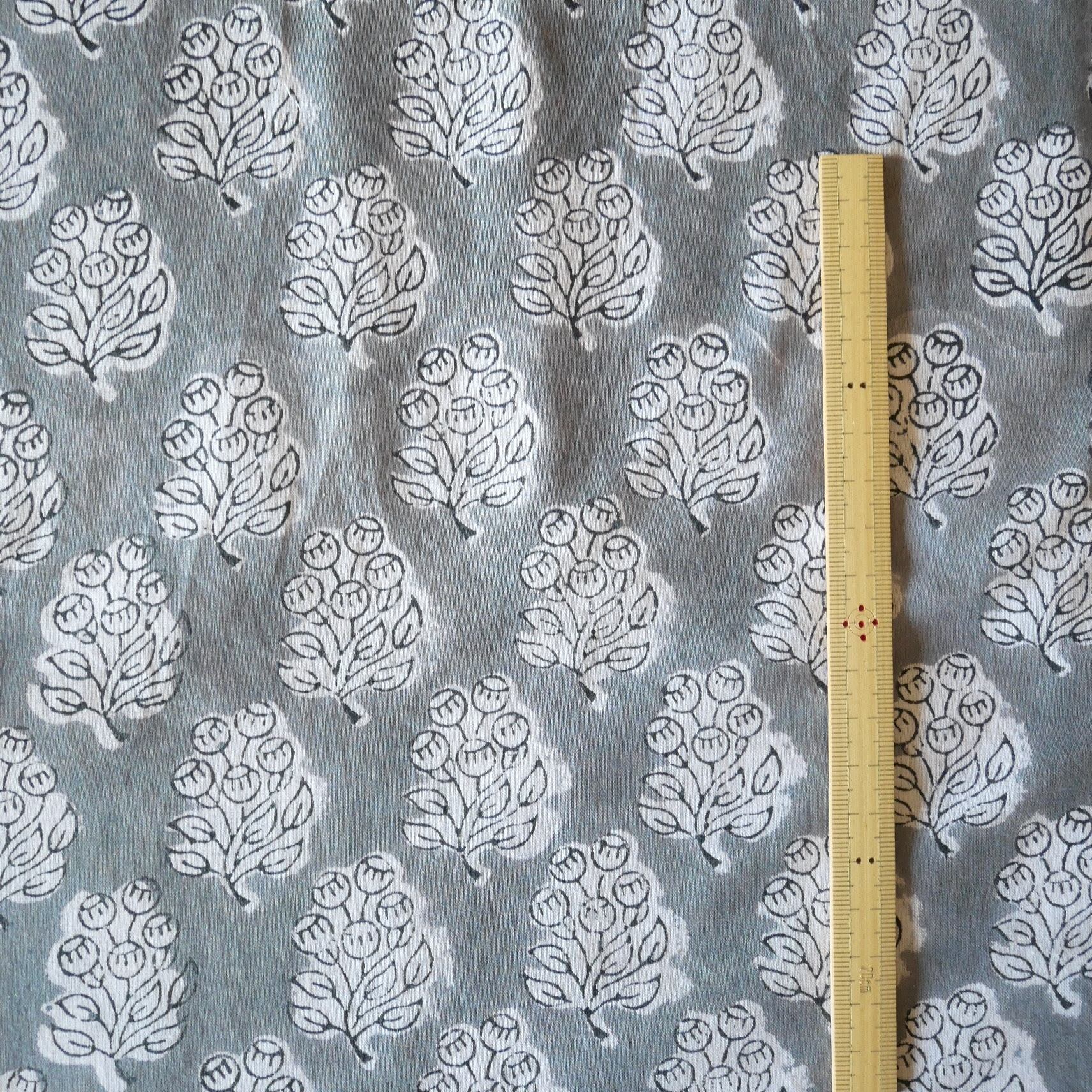 穏やかなグレーベースに、白抜きで描かれた小花模様が並ぶブロックプリント生地です。