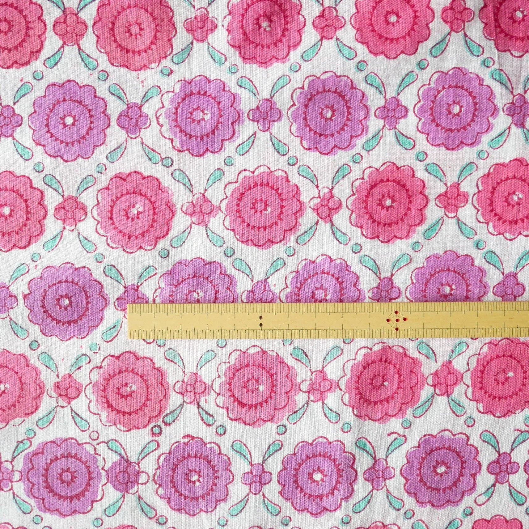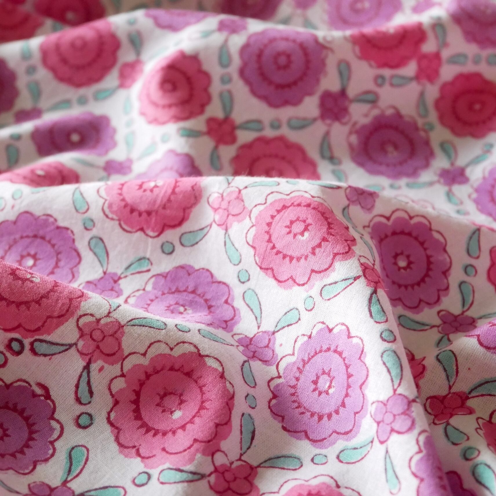 ◾️やさしいピンクやラベンダーの花々を、ターコイズのフレームが囲む一枚。インドのハンドブロックプリント生地