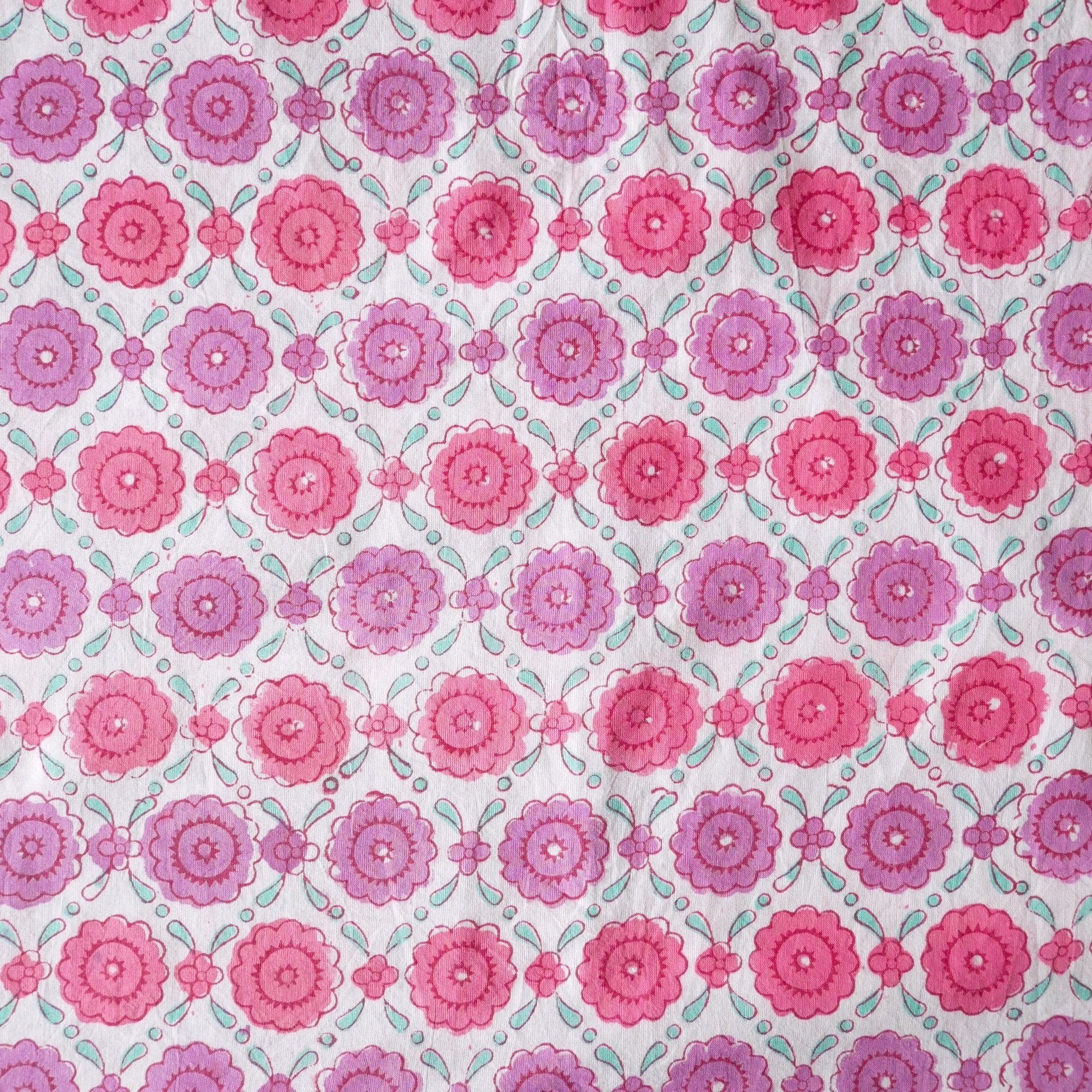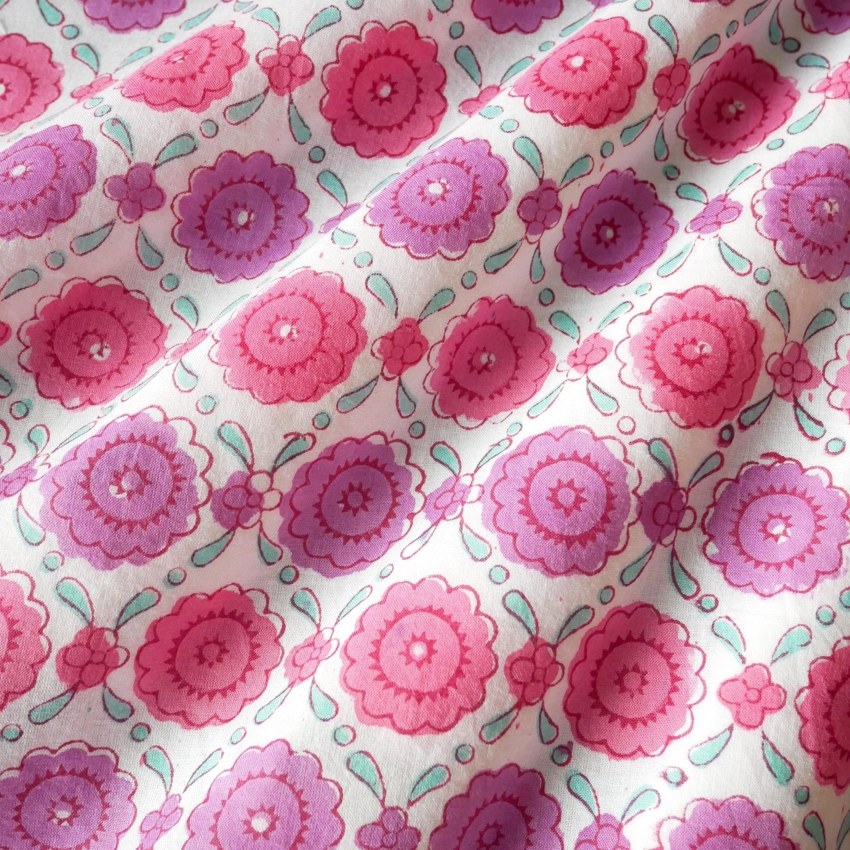 ホワイトベースに、ピンクとラベンダーで描かれた花々が並ぶブロックプリント生地。