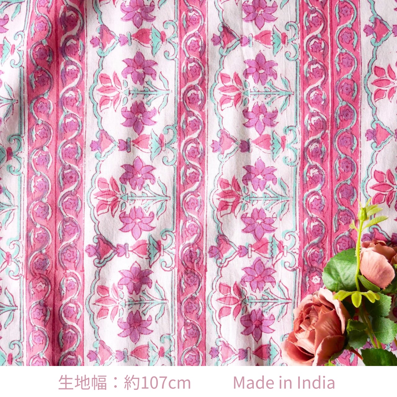 ハンドブロックプリント生地 インド更紗 綿生地 ホワイトベース×ピンク&ラベンダーストライプ Pink Harmony 薄手コットン GP-251102