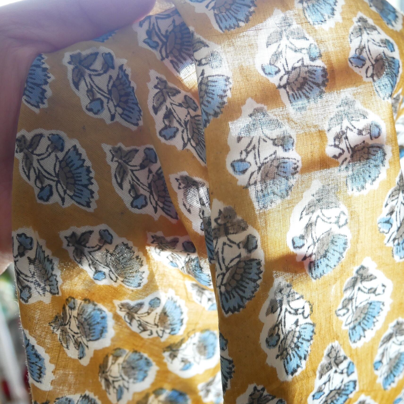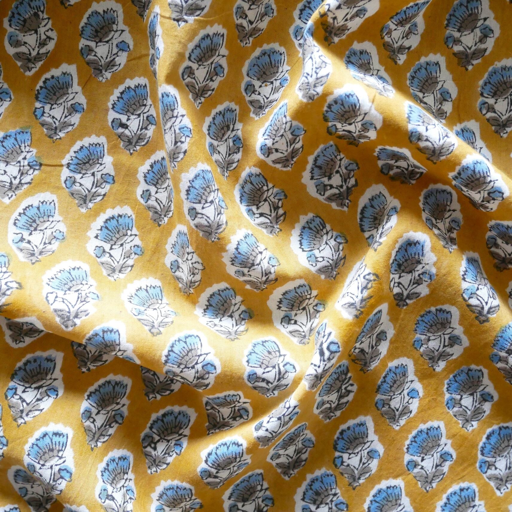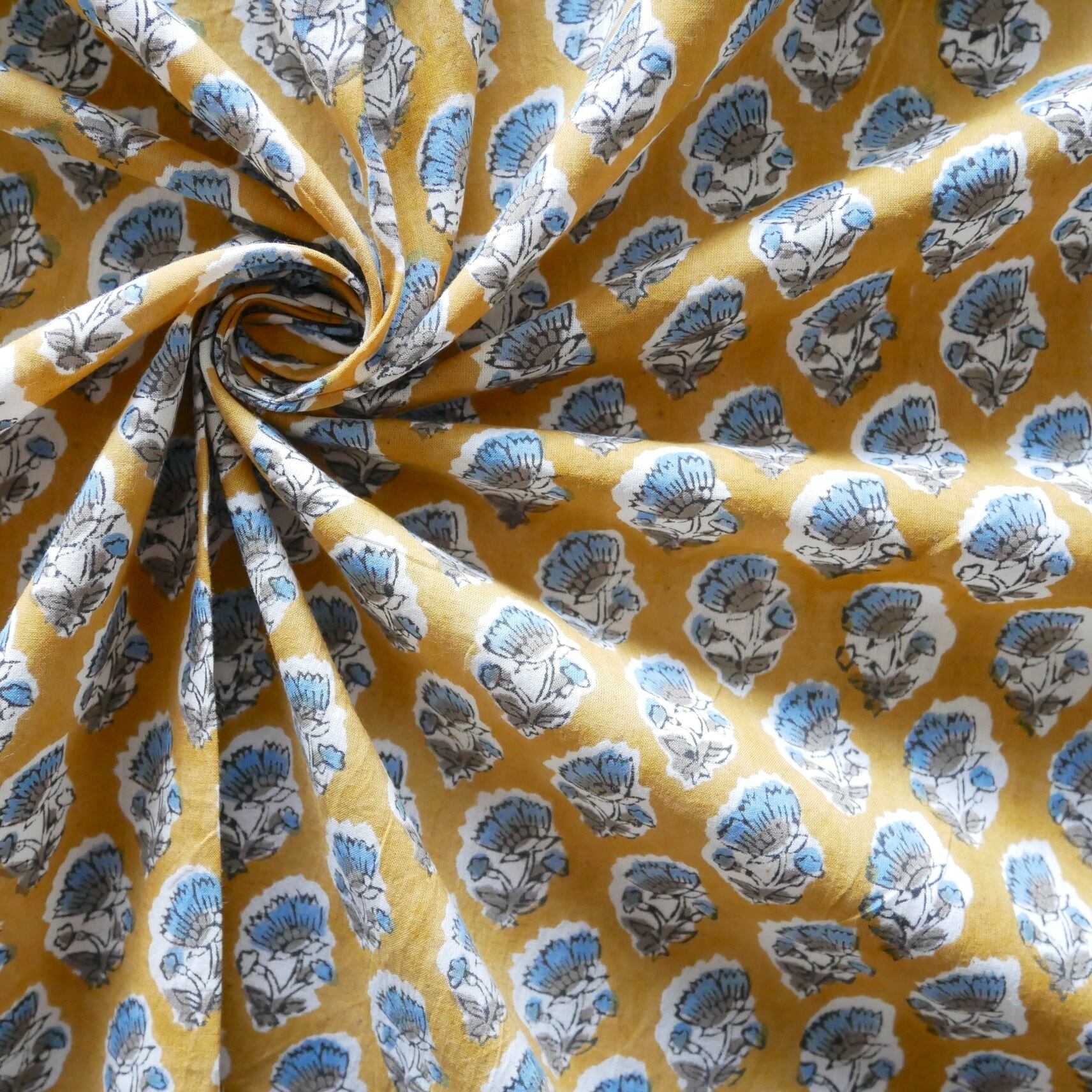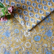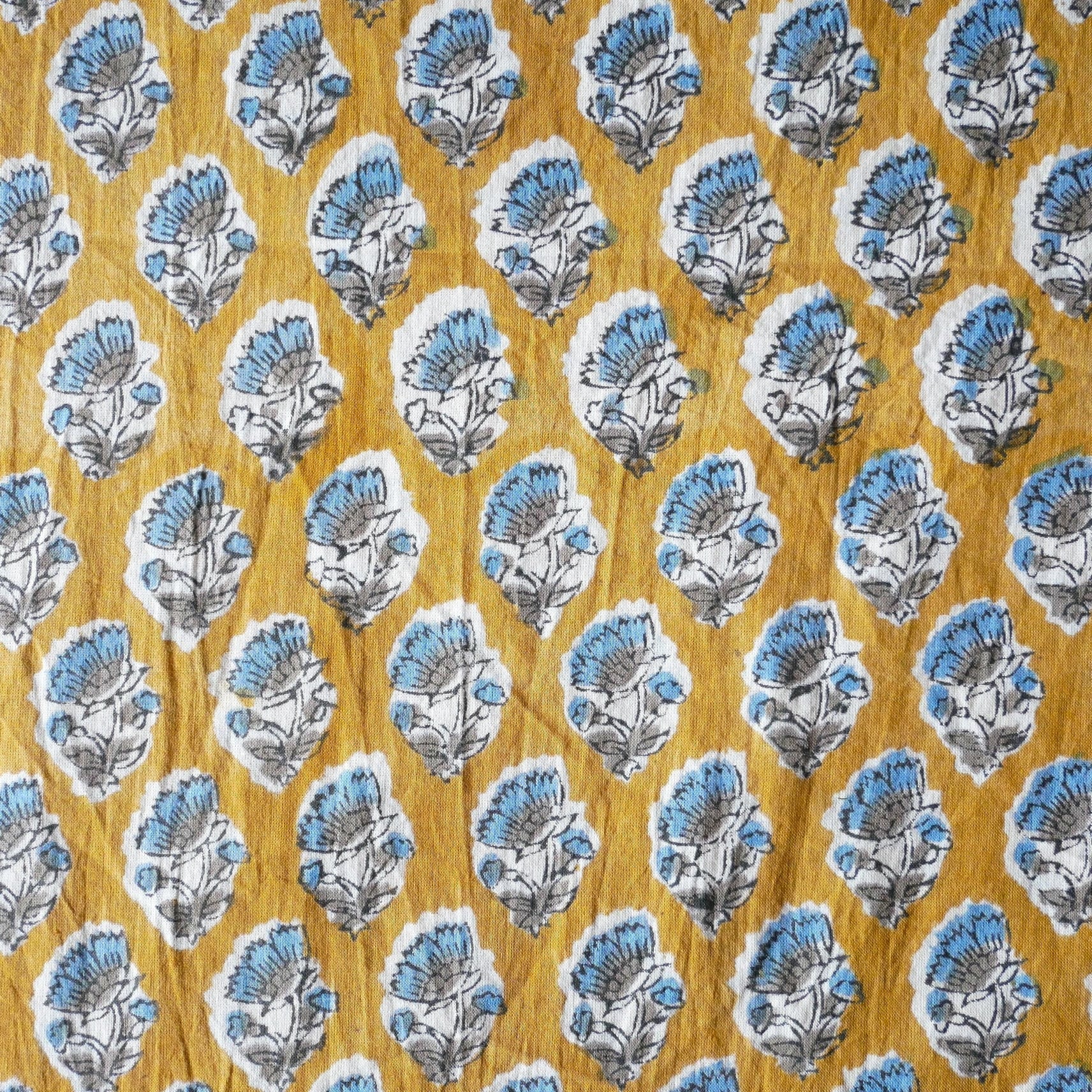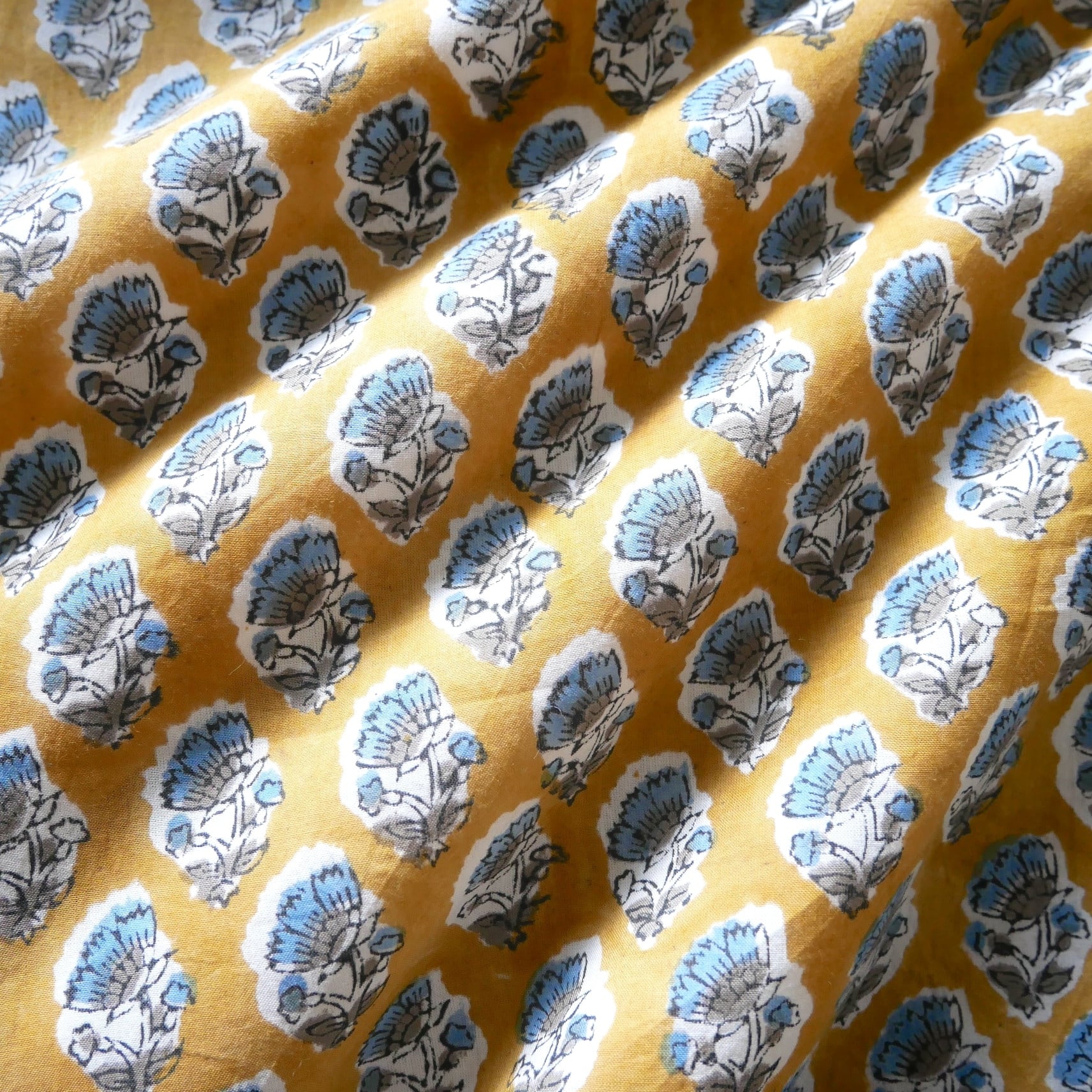 ハンドブロックプリント生地 インド更紗 綿生地 マスタードベース×ブルーフラワー 薄手コットン JE-251105