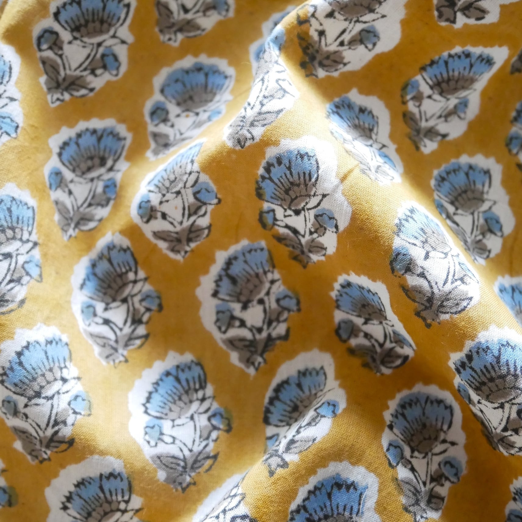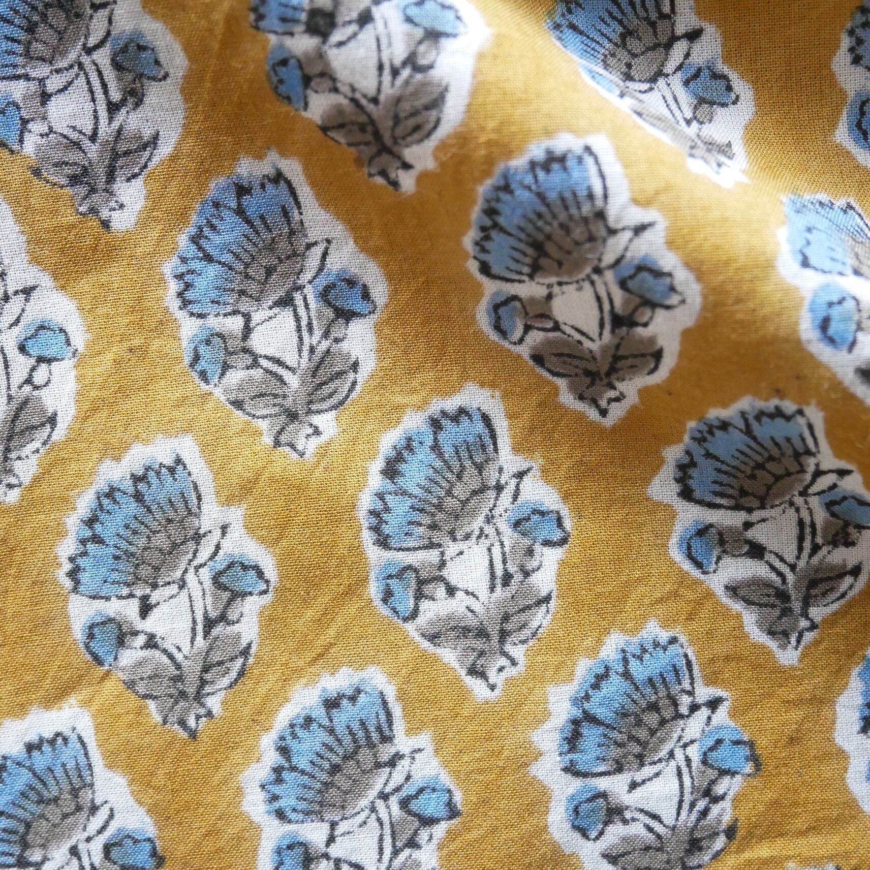 深みのあるマスタードベースに、くすんだブルーの小花が並んだSanganer(サンガネール)のハンドブロックプリント生地です。