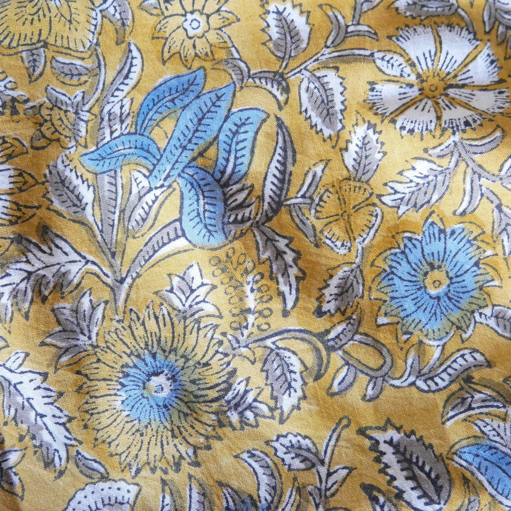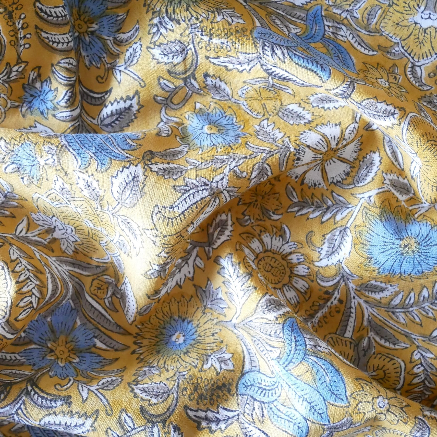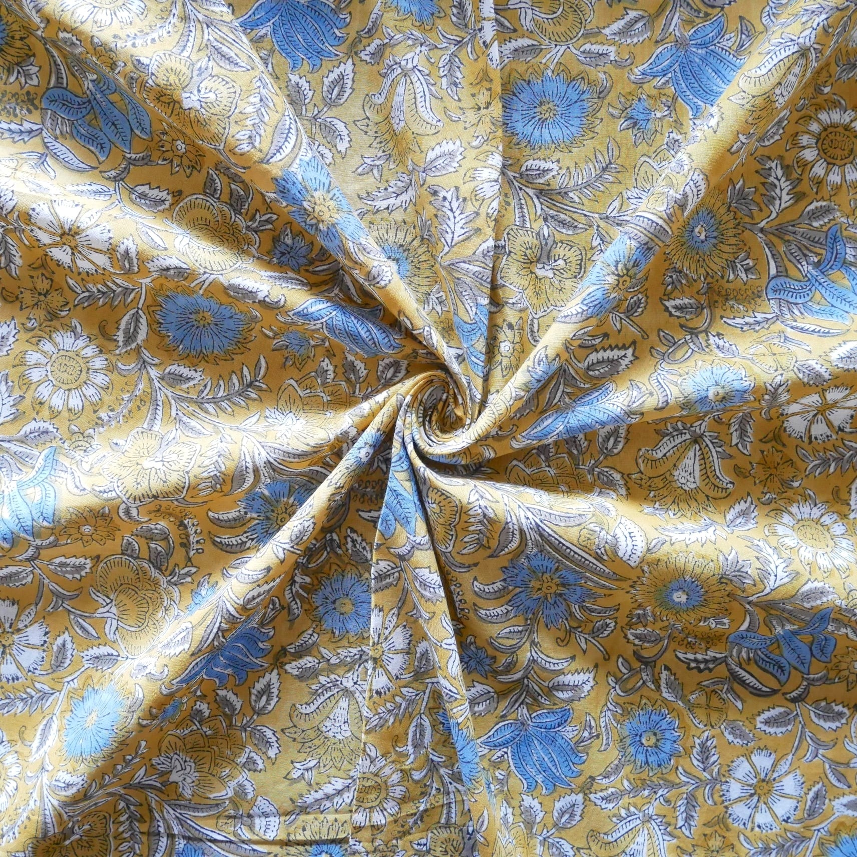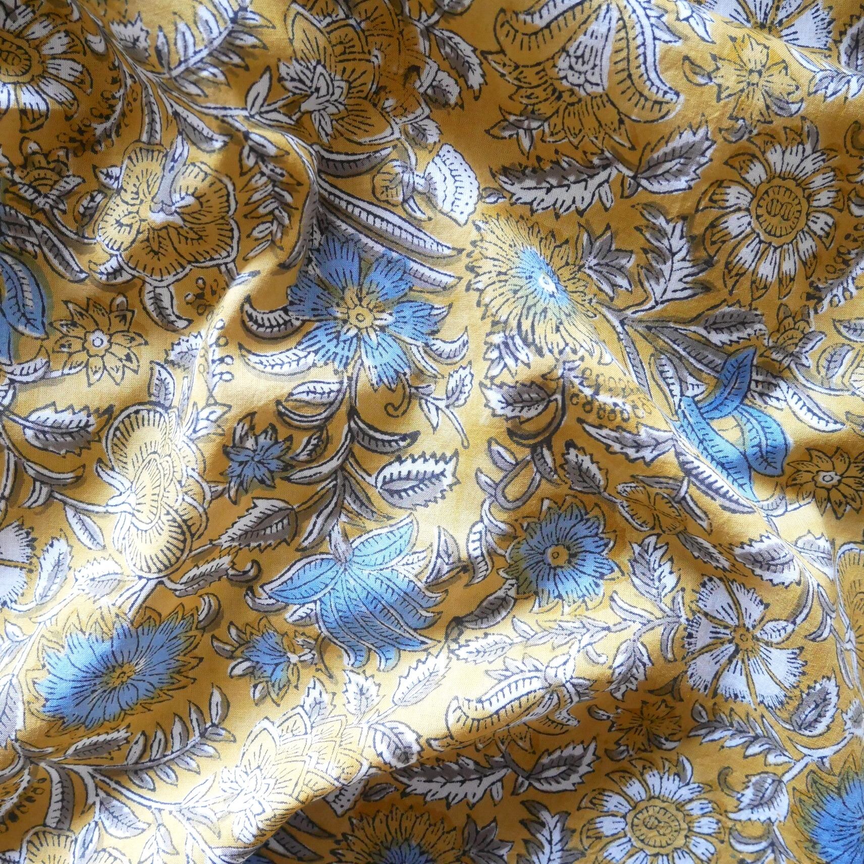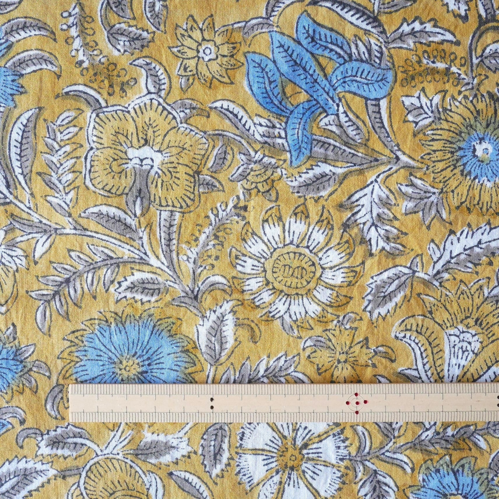 ◾️マスタード×ブルーのボタニカル柄が広がる、華やかで上品なインドのハンドブロックプリント生地