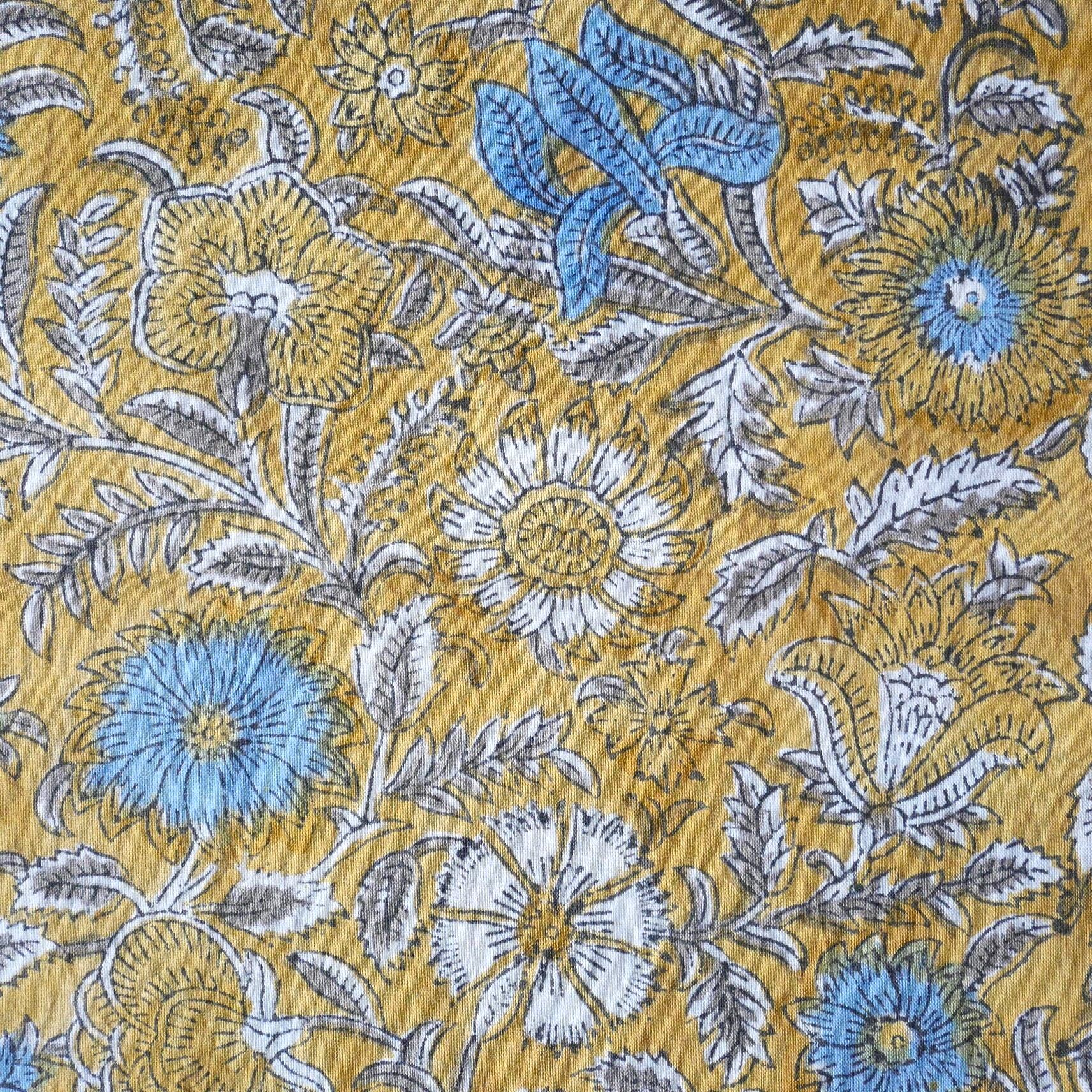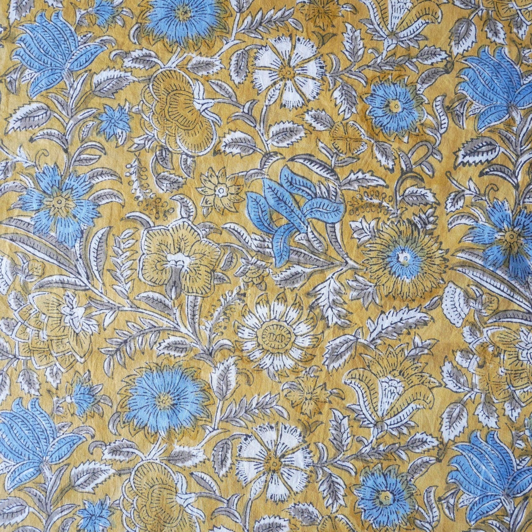 深みのあるマスタードベースに、爽やかなブルーの花々と葉模様が描かれたSanganer(サンガネール)のハンドブロックプリント生地です。
