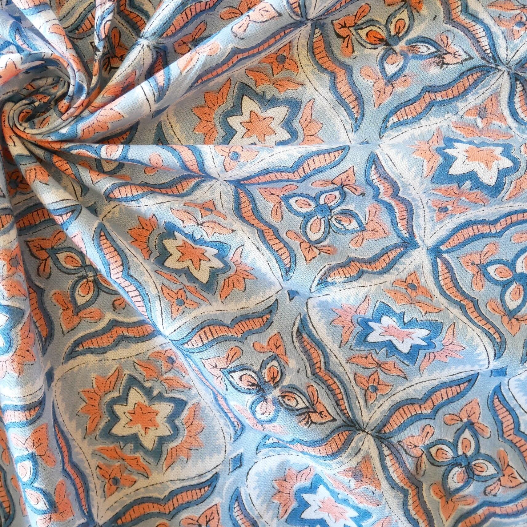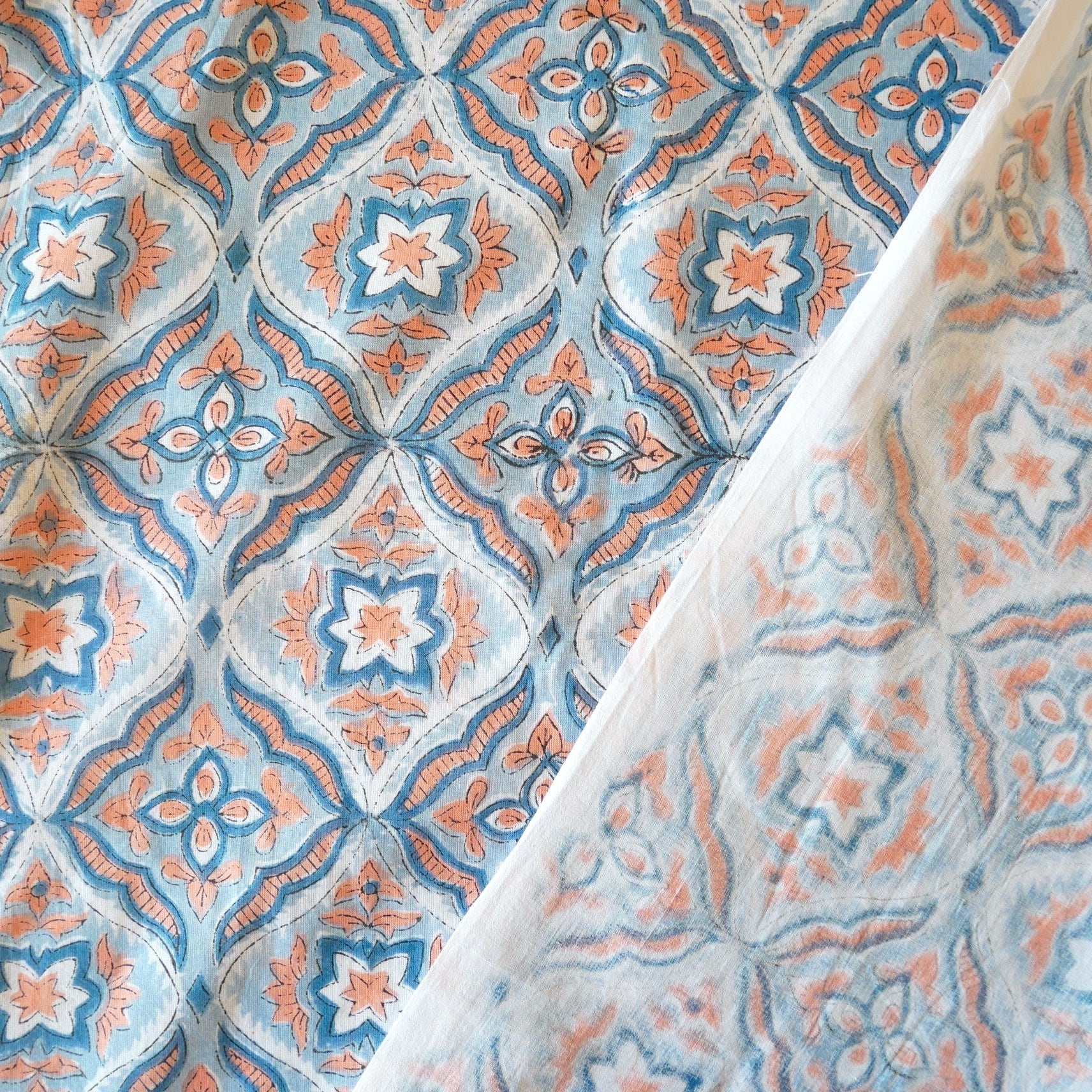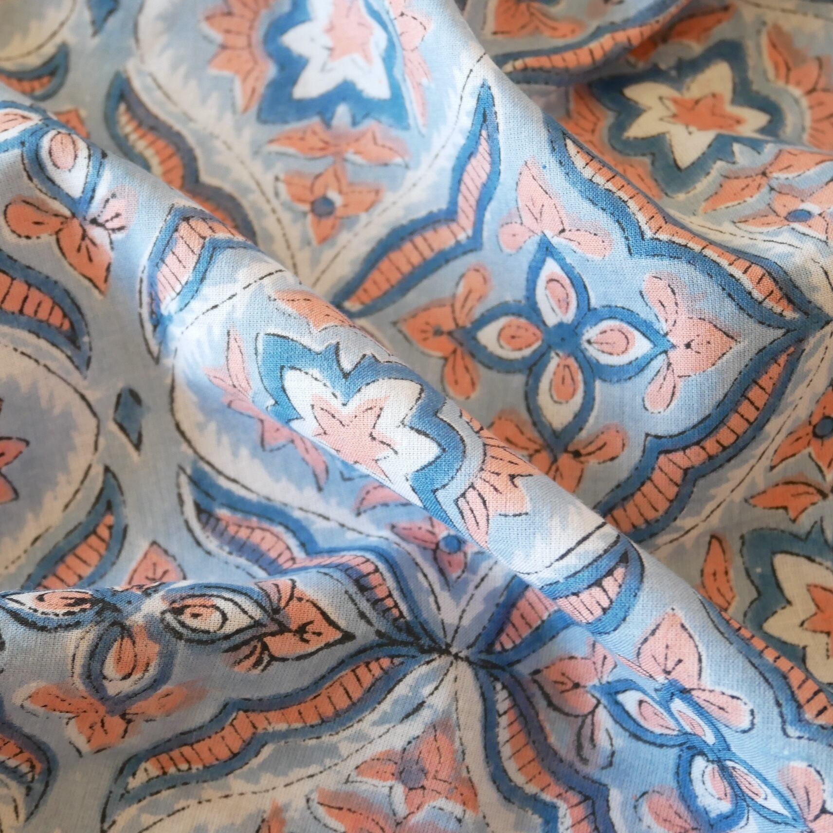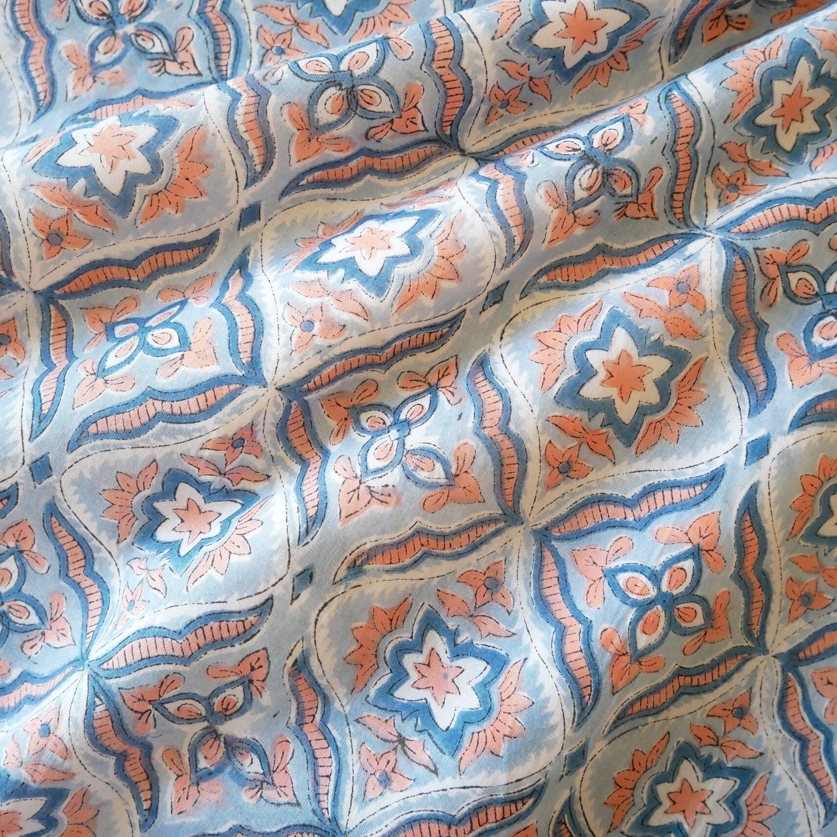 ◾️ライトブルー×コーラルが織りなす、やさしく爽やかなハンドブロックプリント生地