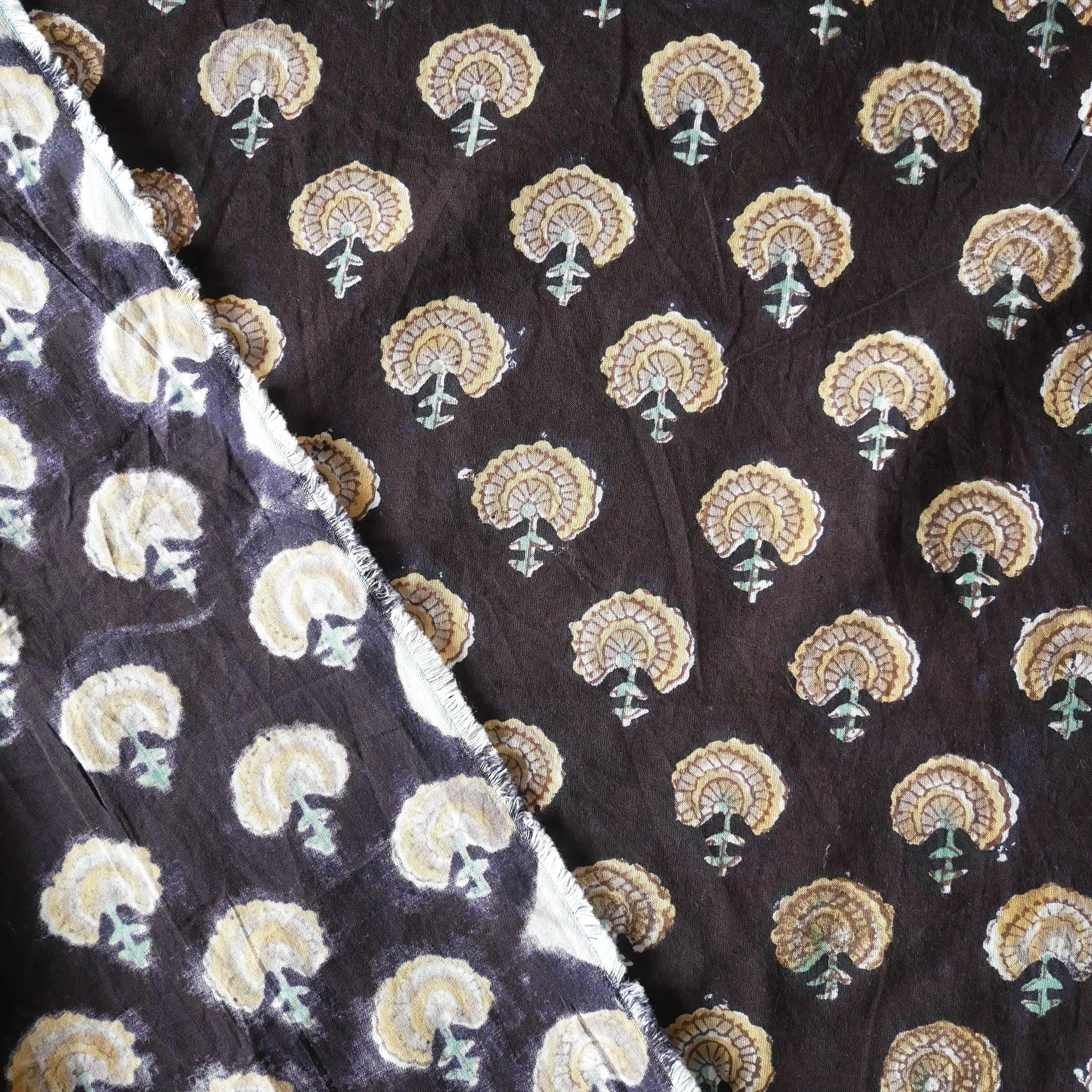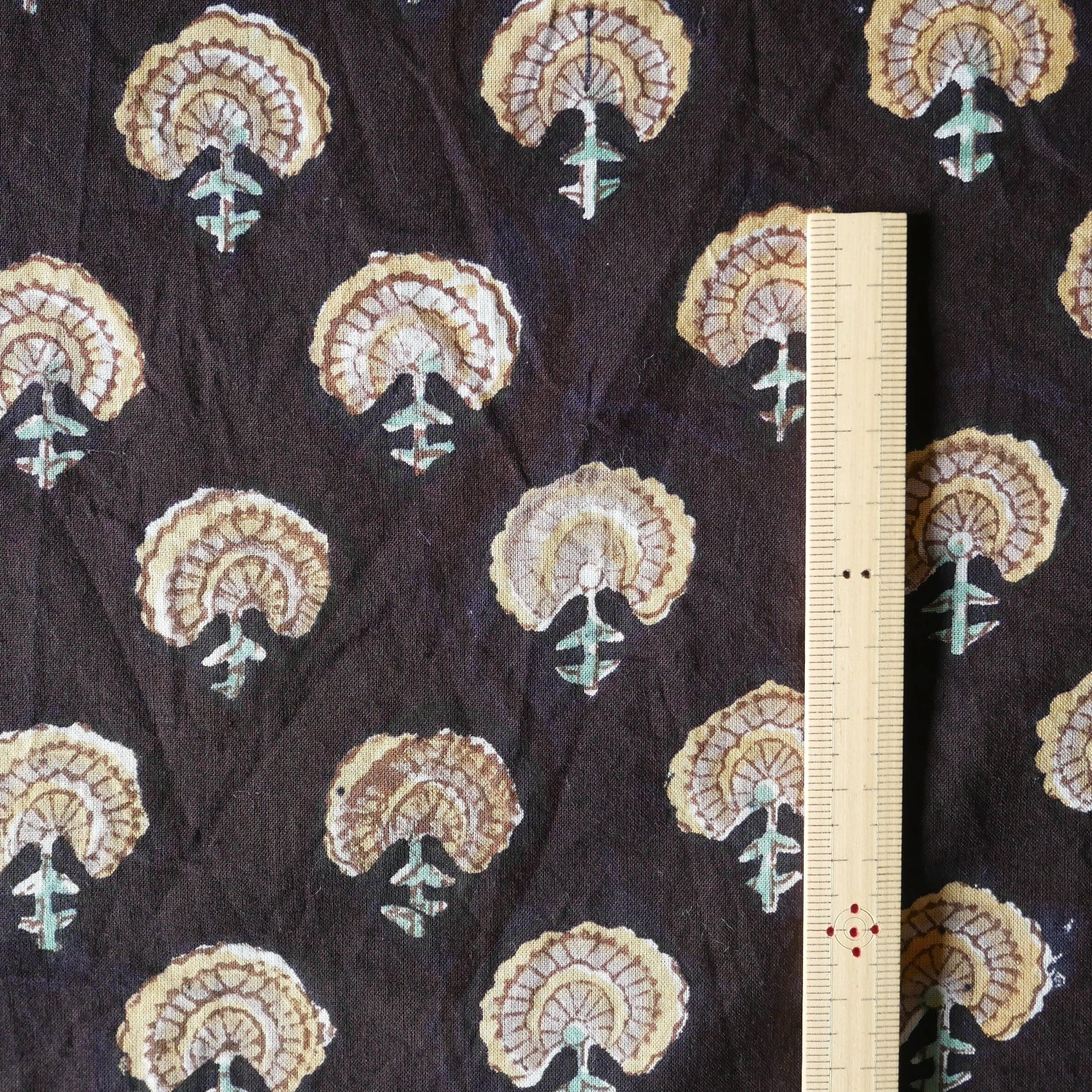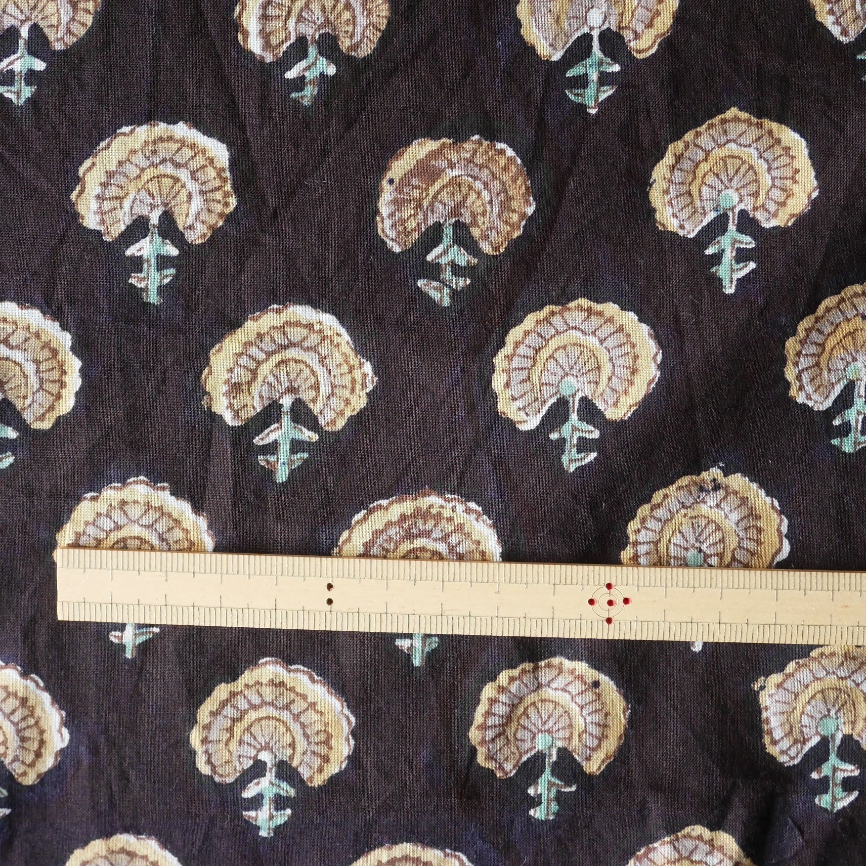 インドの伝統的なハンドブロックプリントで丁寧に染められた、ブラックベースの薄手コットン生地です。