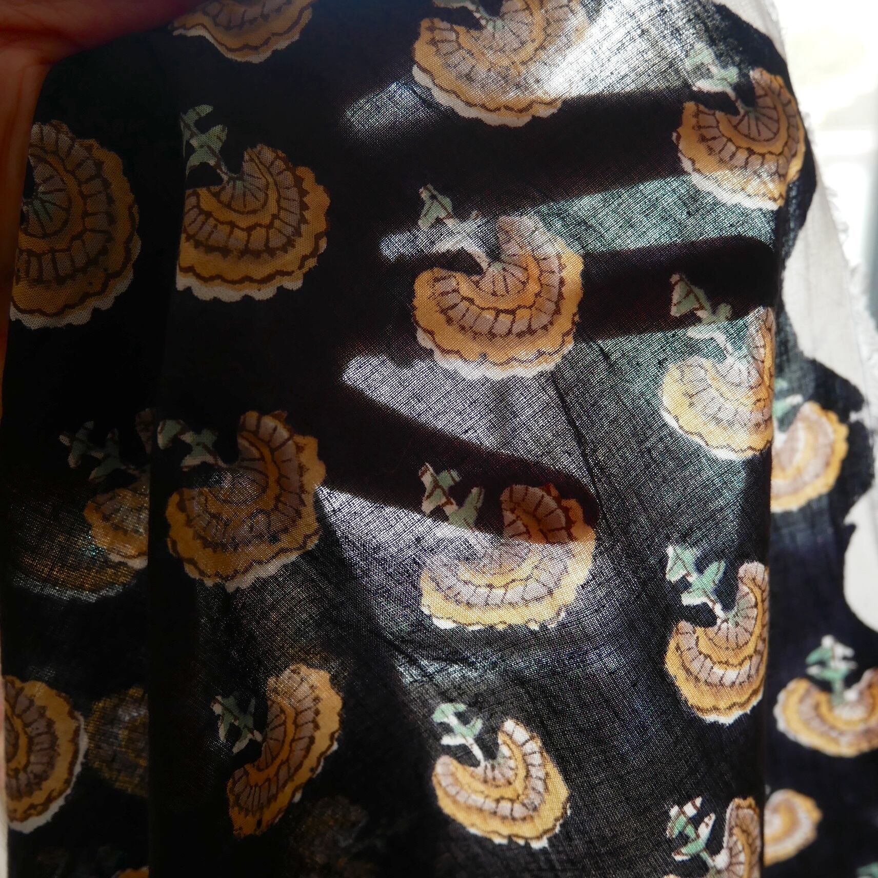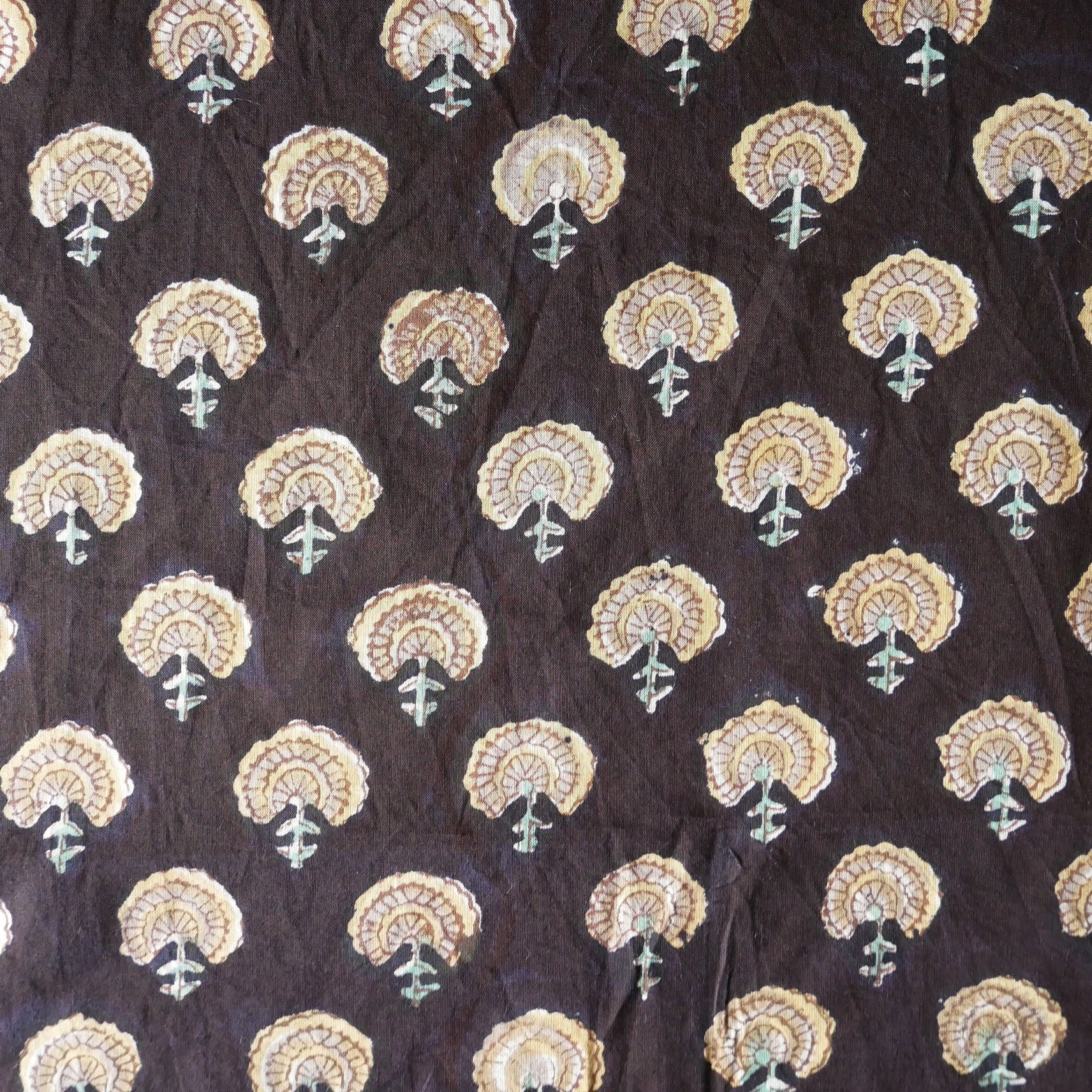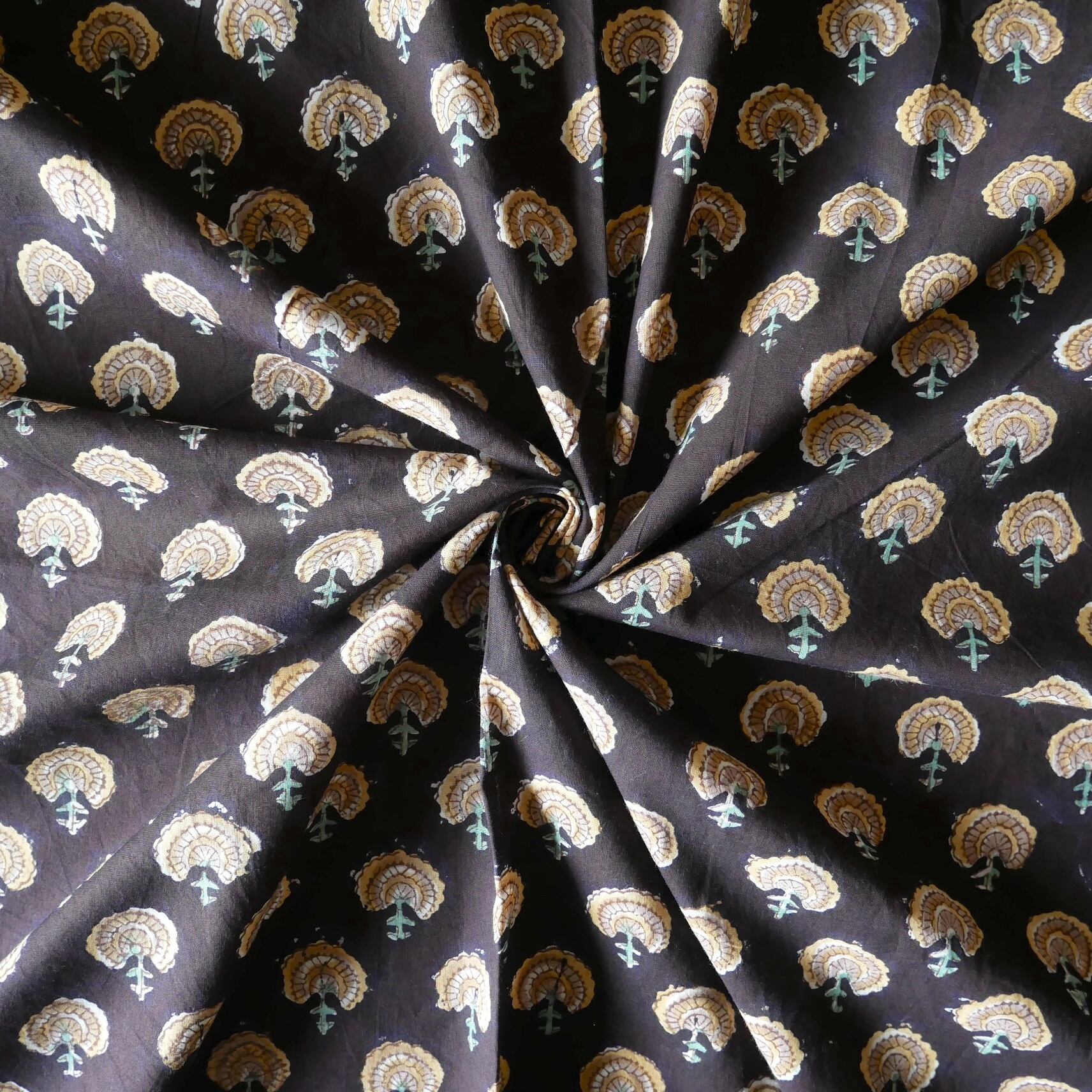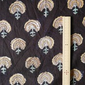 インドの伝統的なハンドブロックプリントで丁寧に染められた、ブラックベースの薄手コットン生地です。
