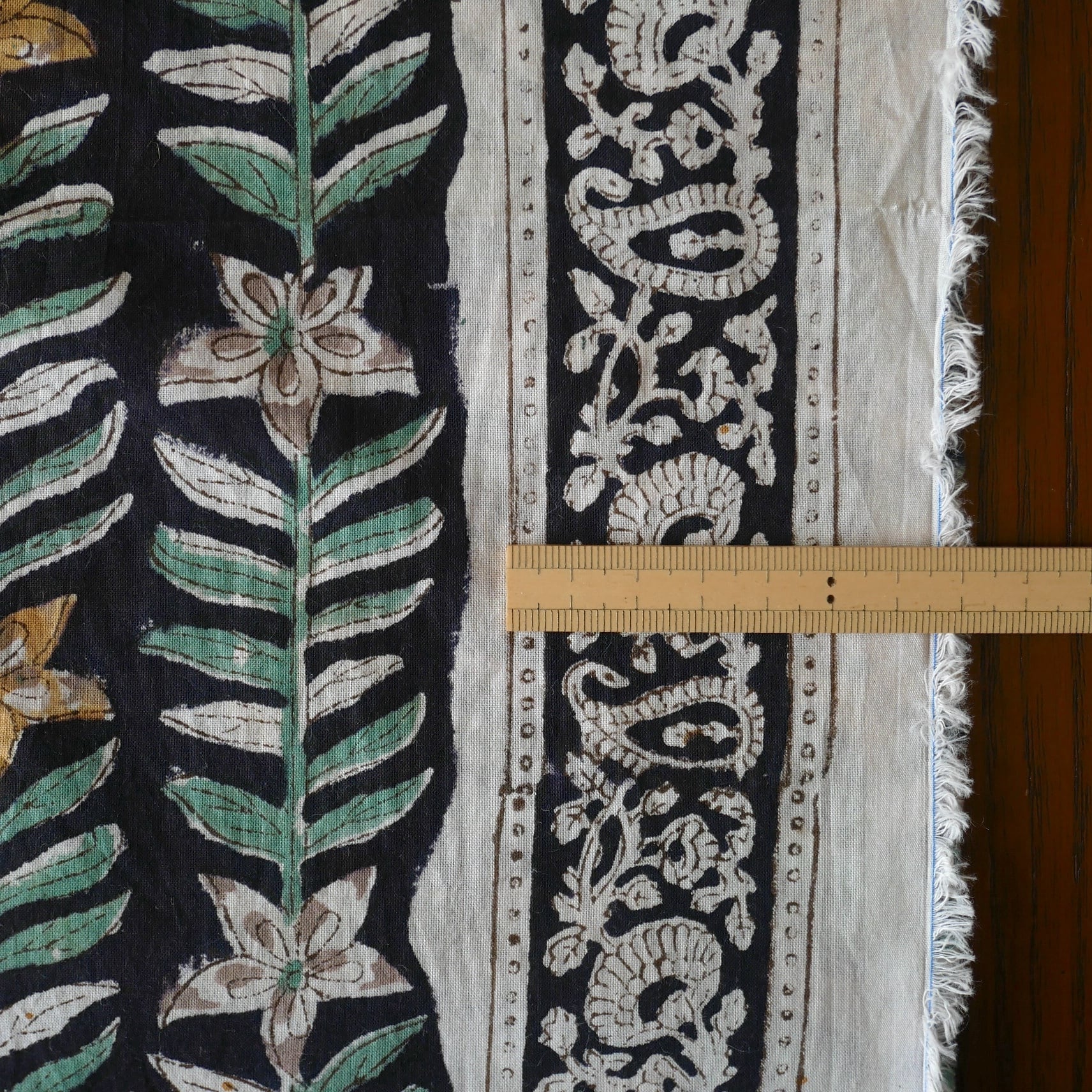 ハンドブロックプリント生地 インド更紗 綿生地 ブラックベース×ベイクドカラーのボタニカル柄 片耳ボーダー 薄手コットン JE-251114