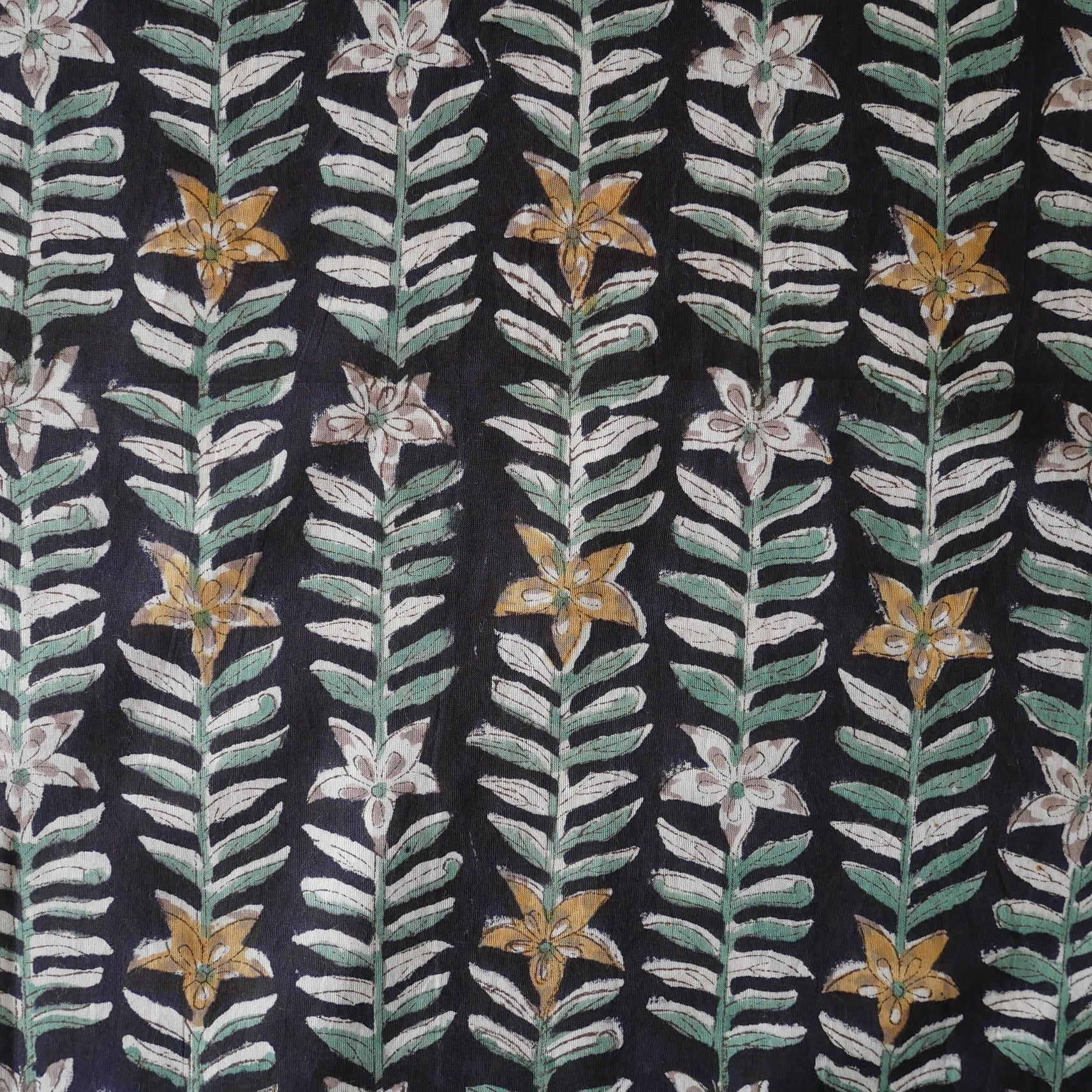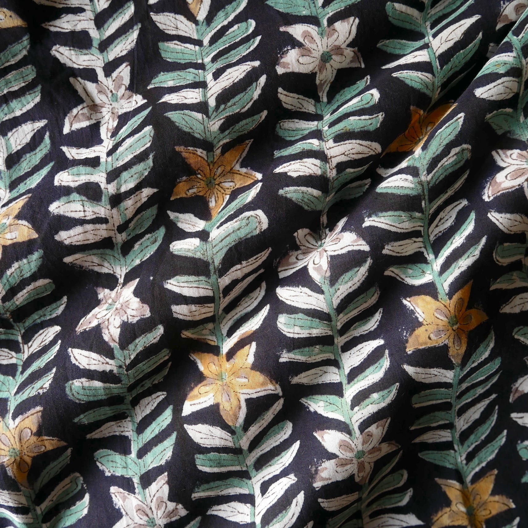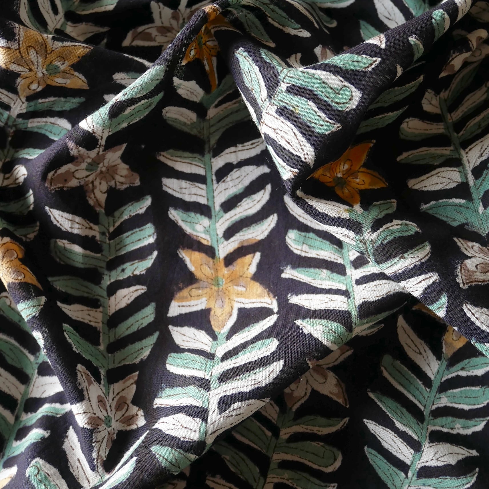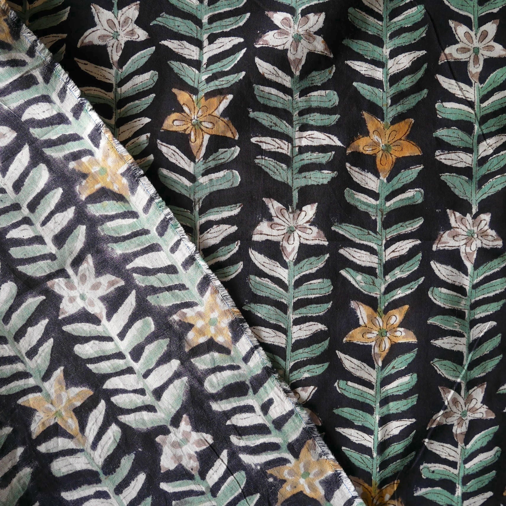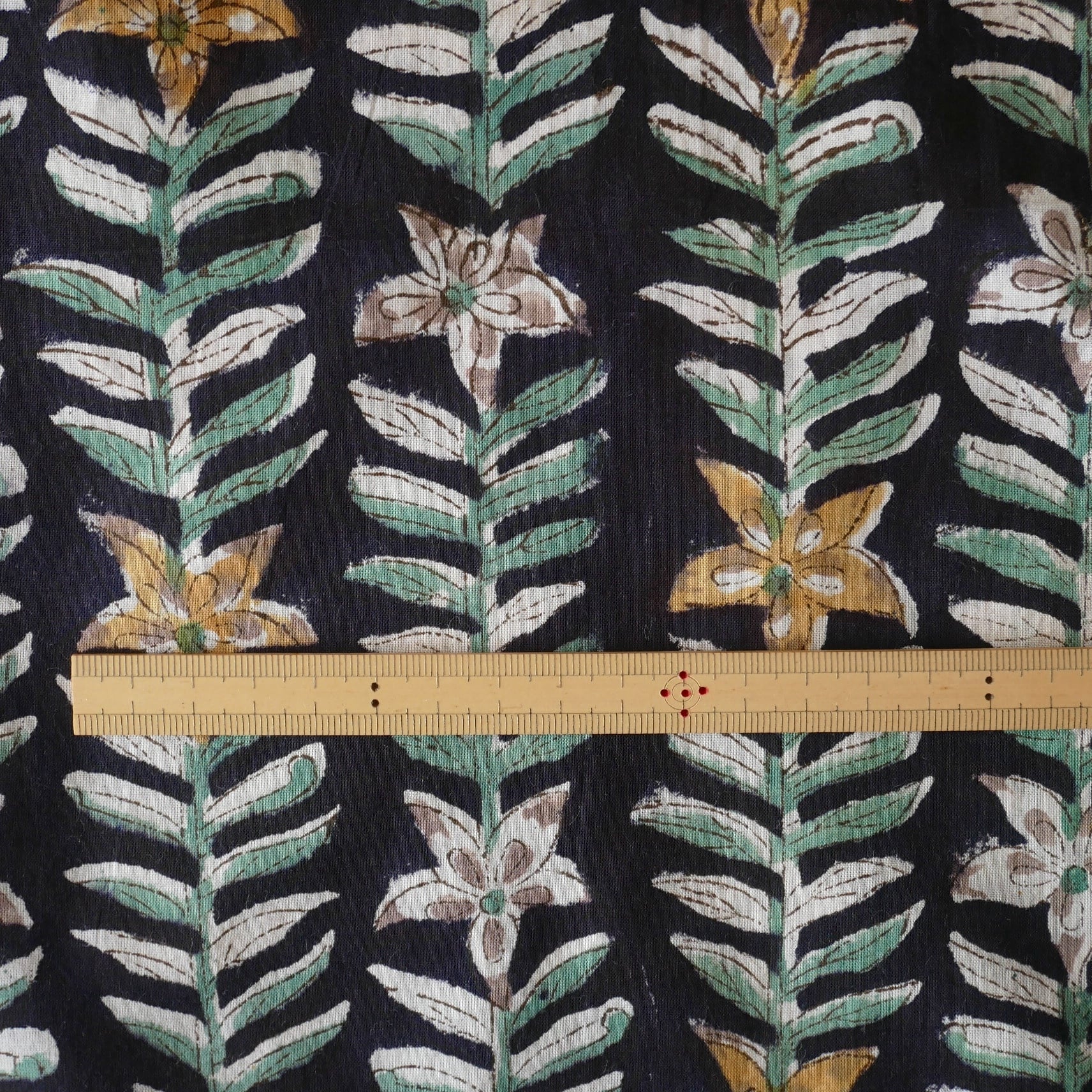 インドの伝統的なハンドブロックプリントで丁寧に染められた、ブラックベースの薄手コットン生地です。