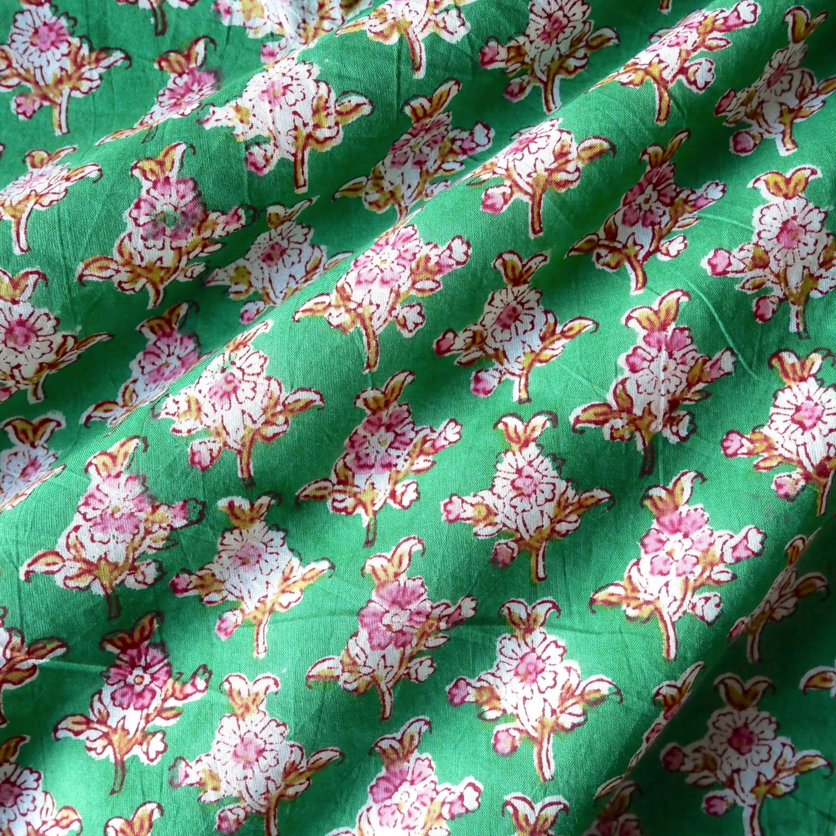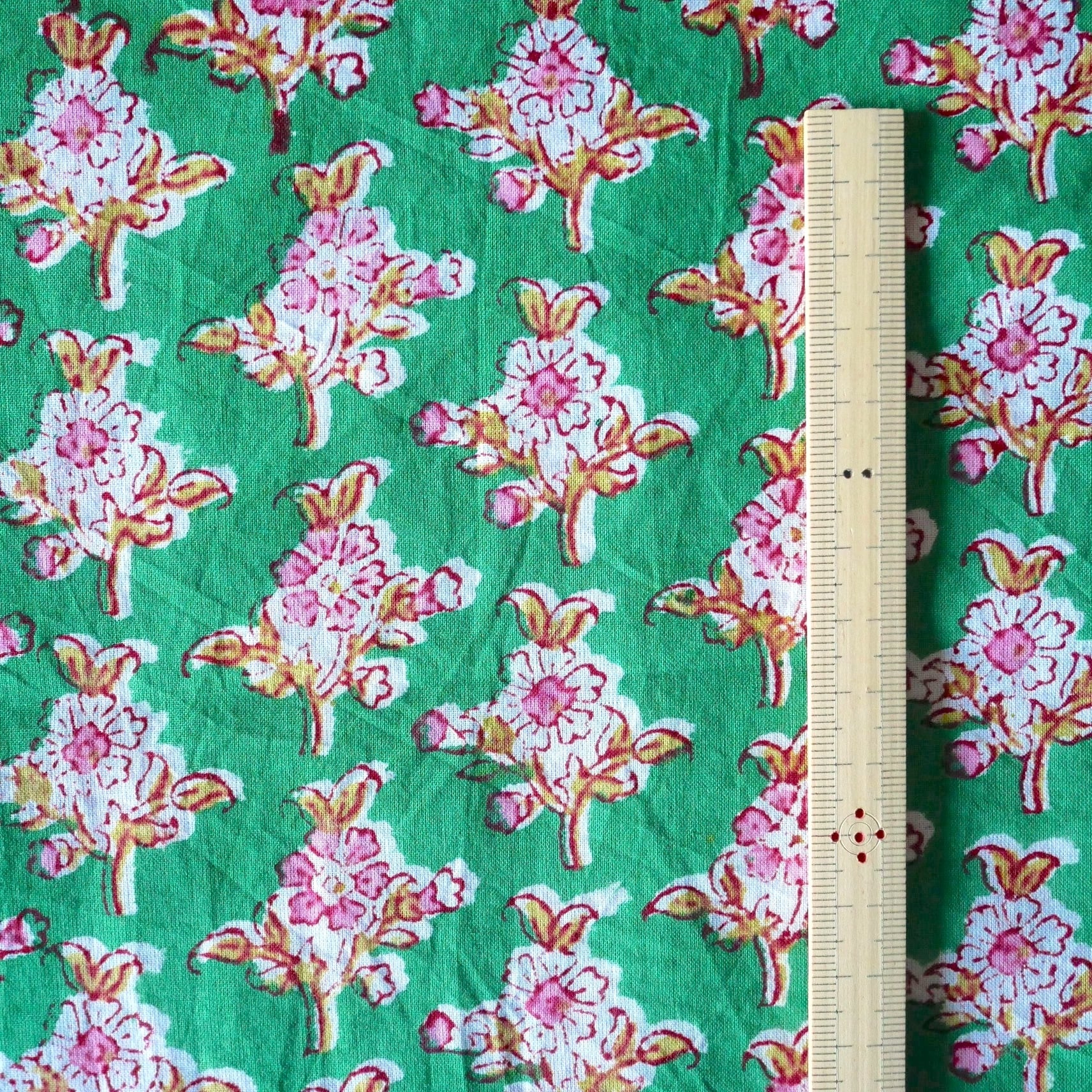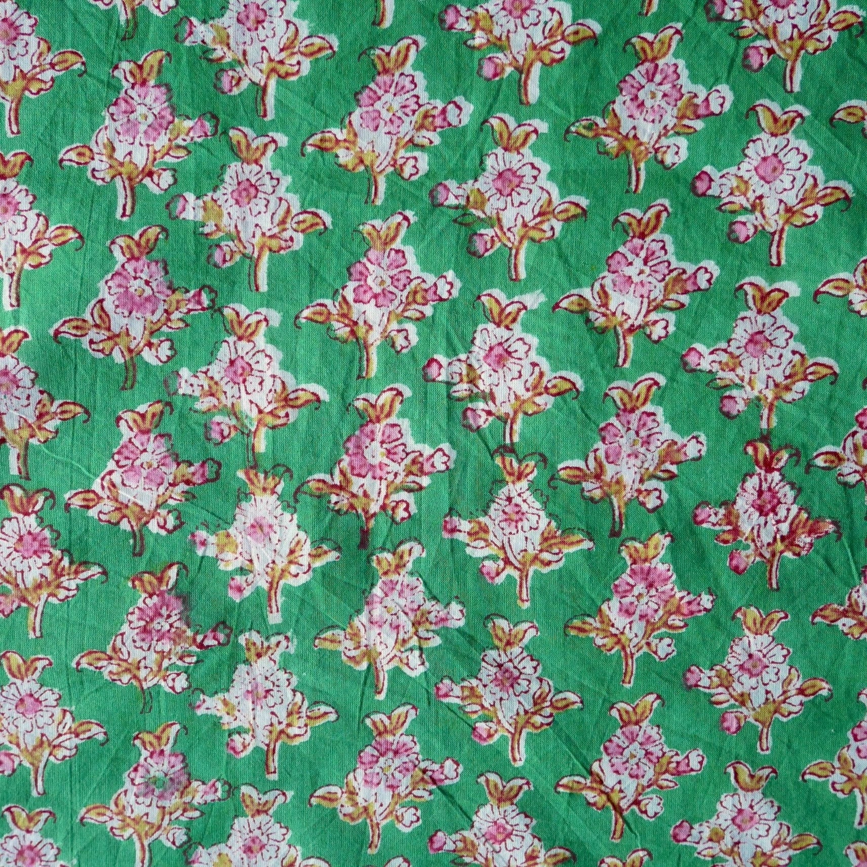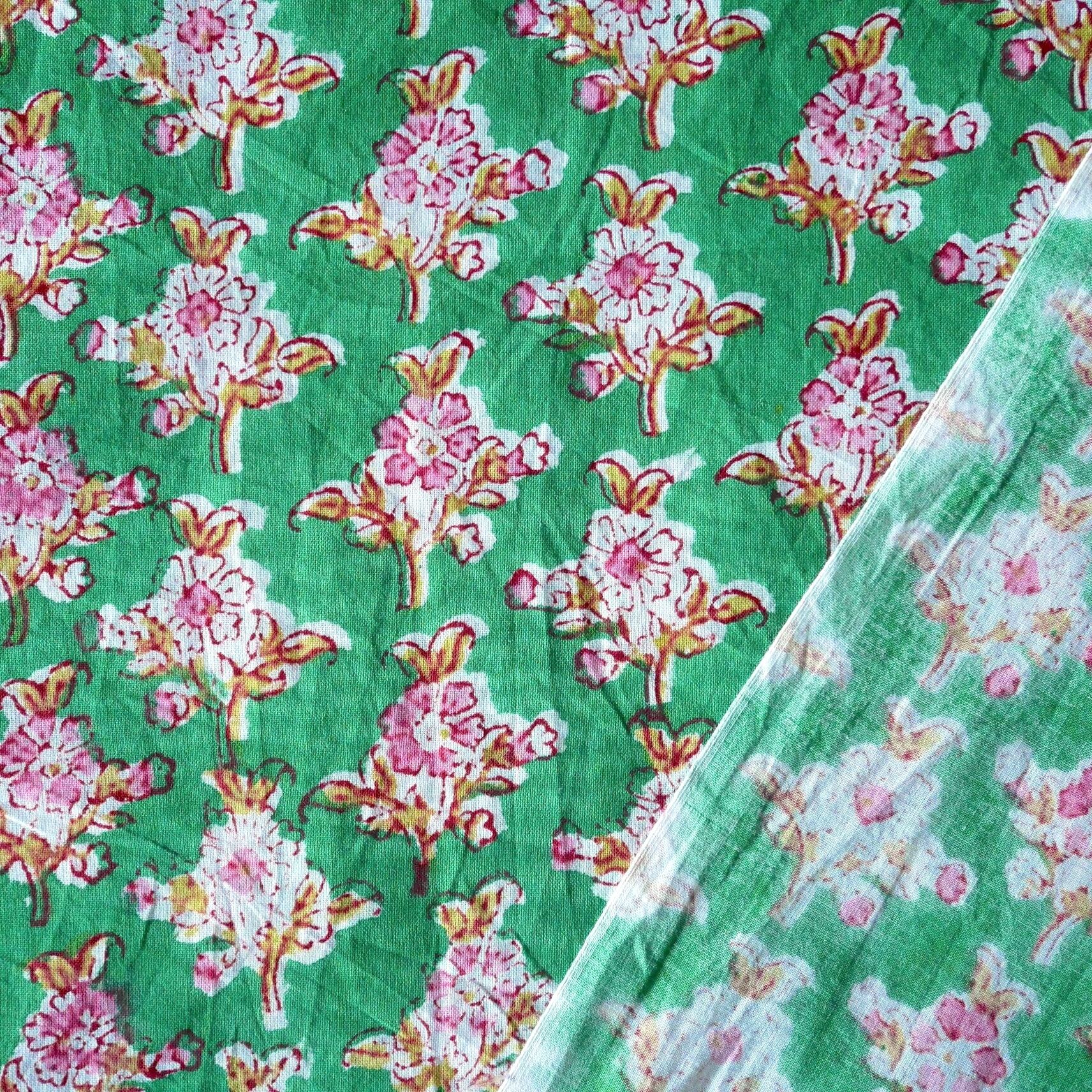 爽やかなグリーンのベースに、ピンクと白抜きで描かれた可憐な花々が並ぶブロックプリント生地です。