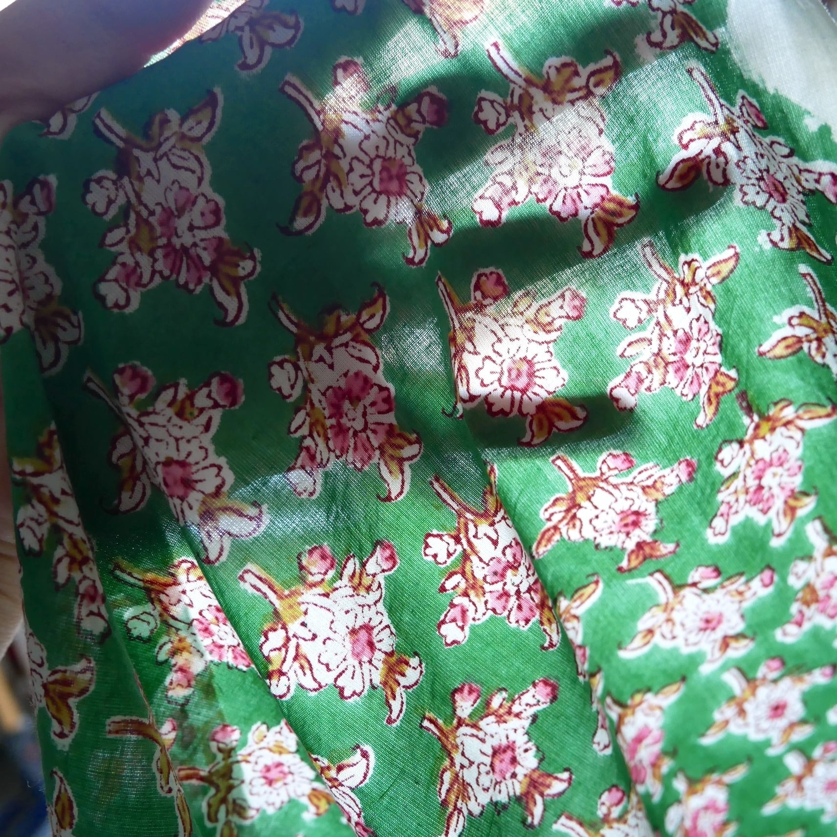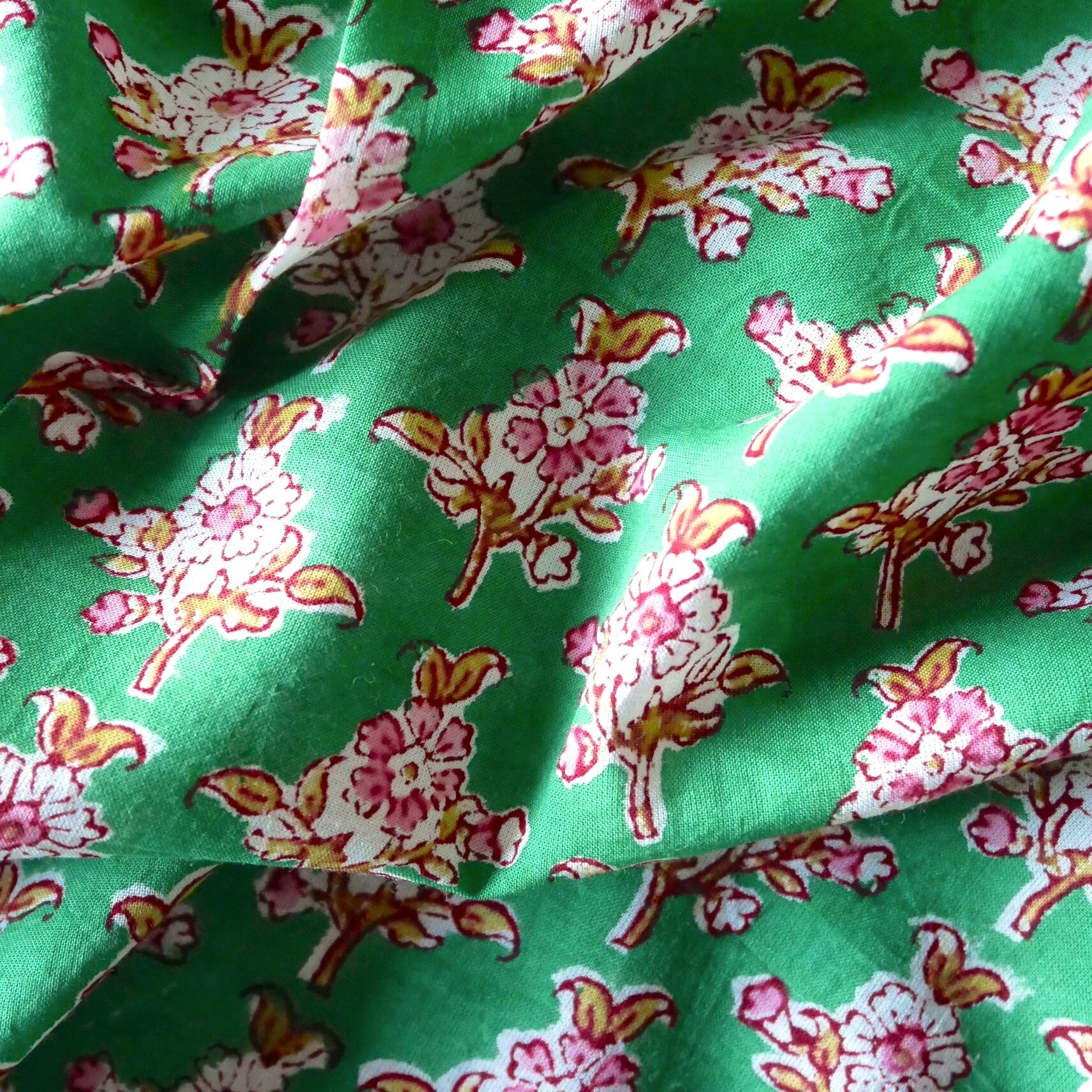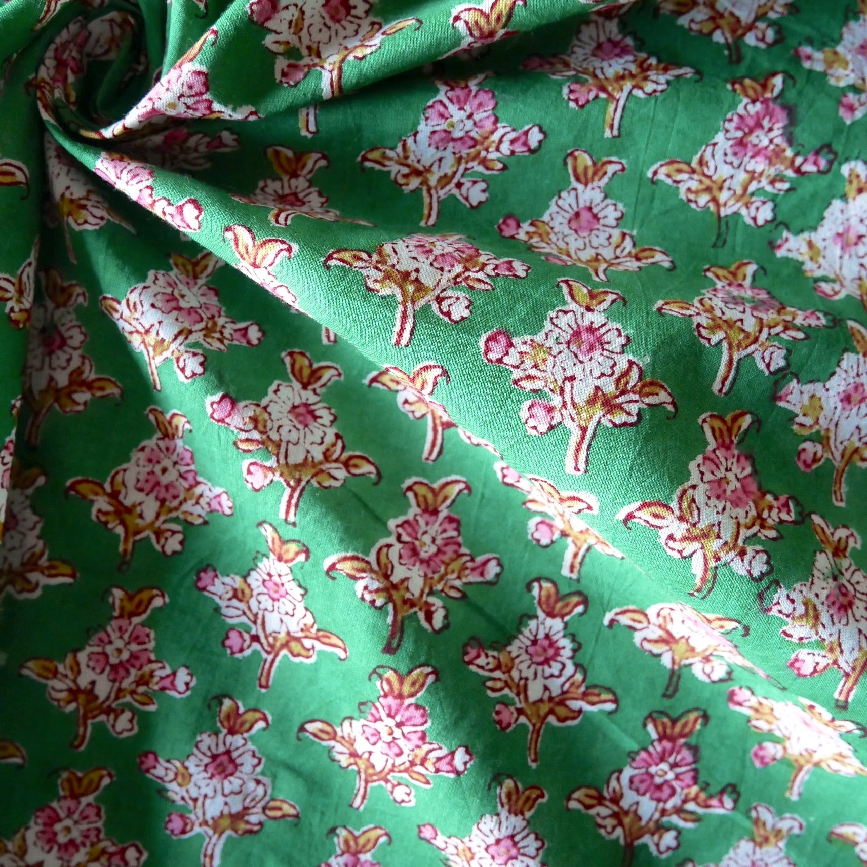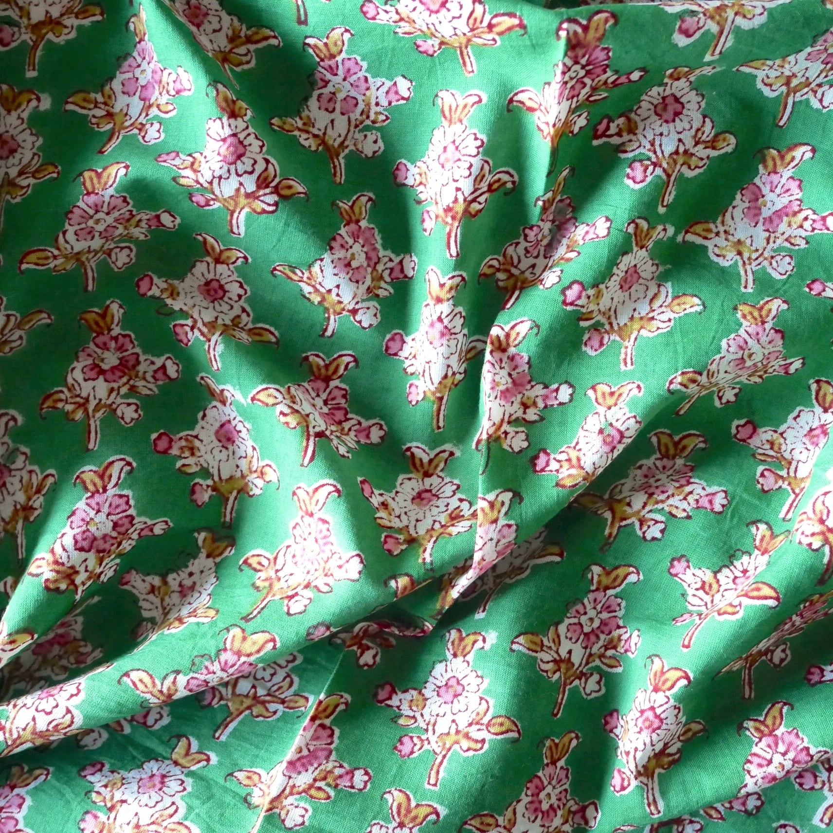 ◾️優しいピンクの小花が広がる、爽やかなグリーンのブロックプリント生地