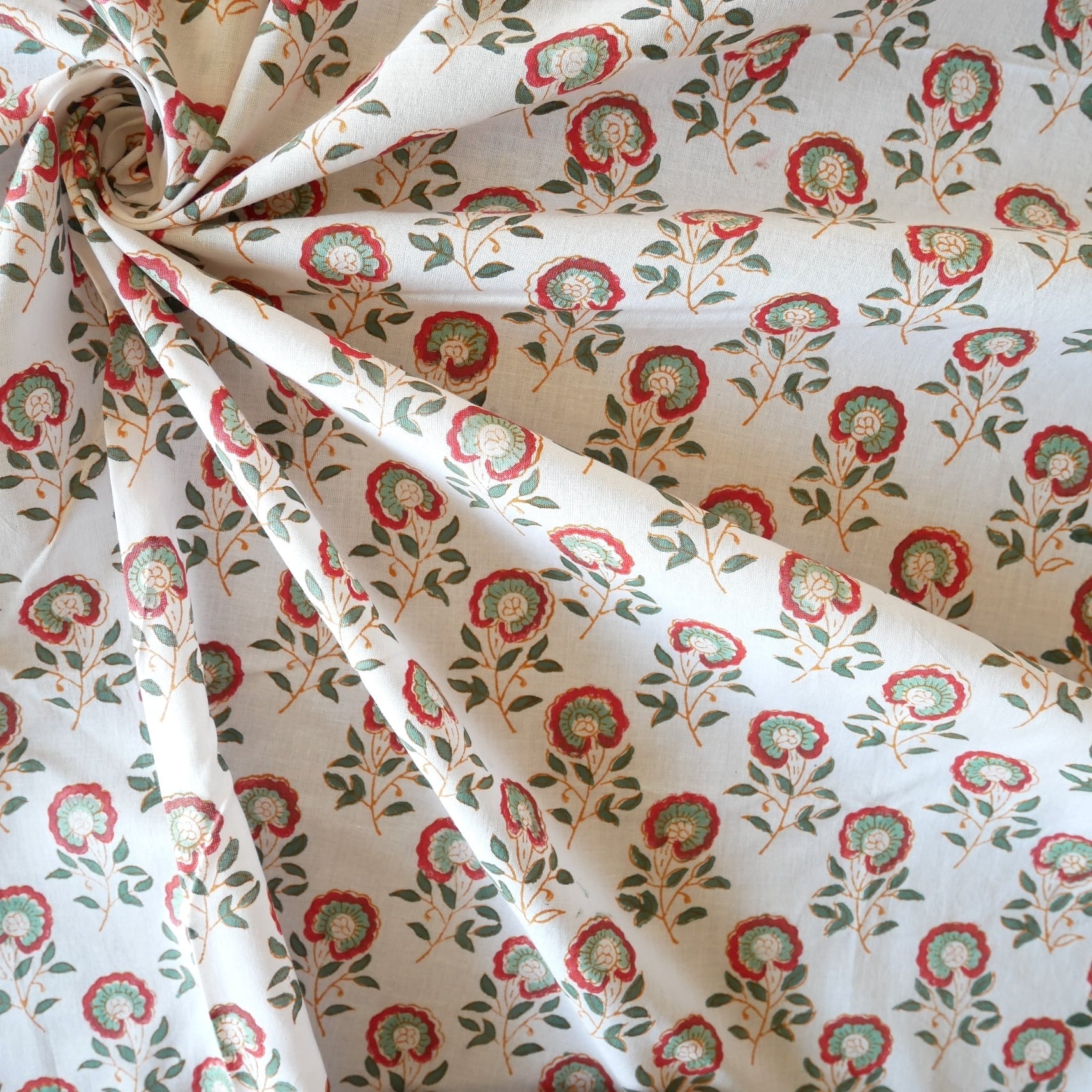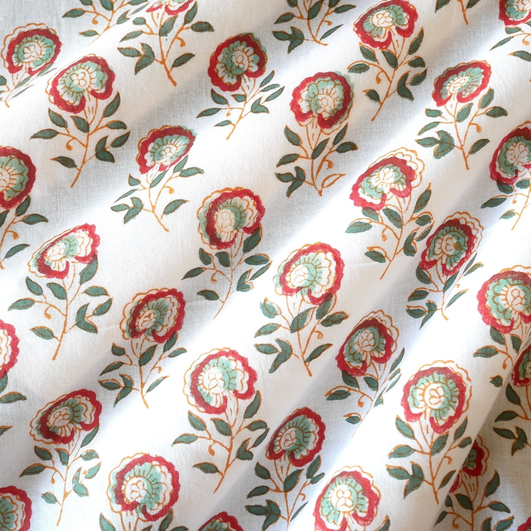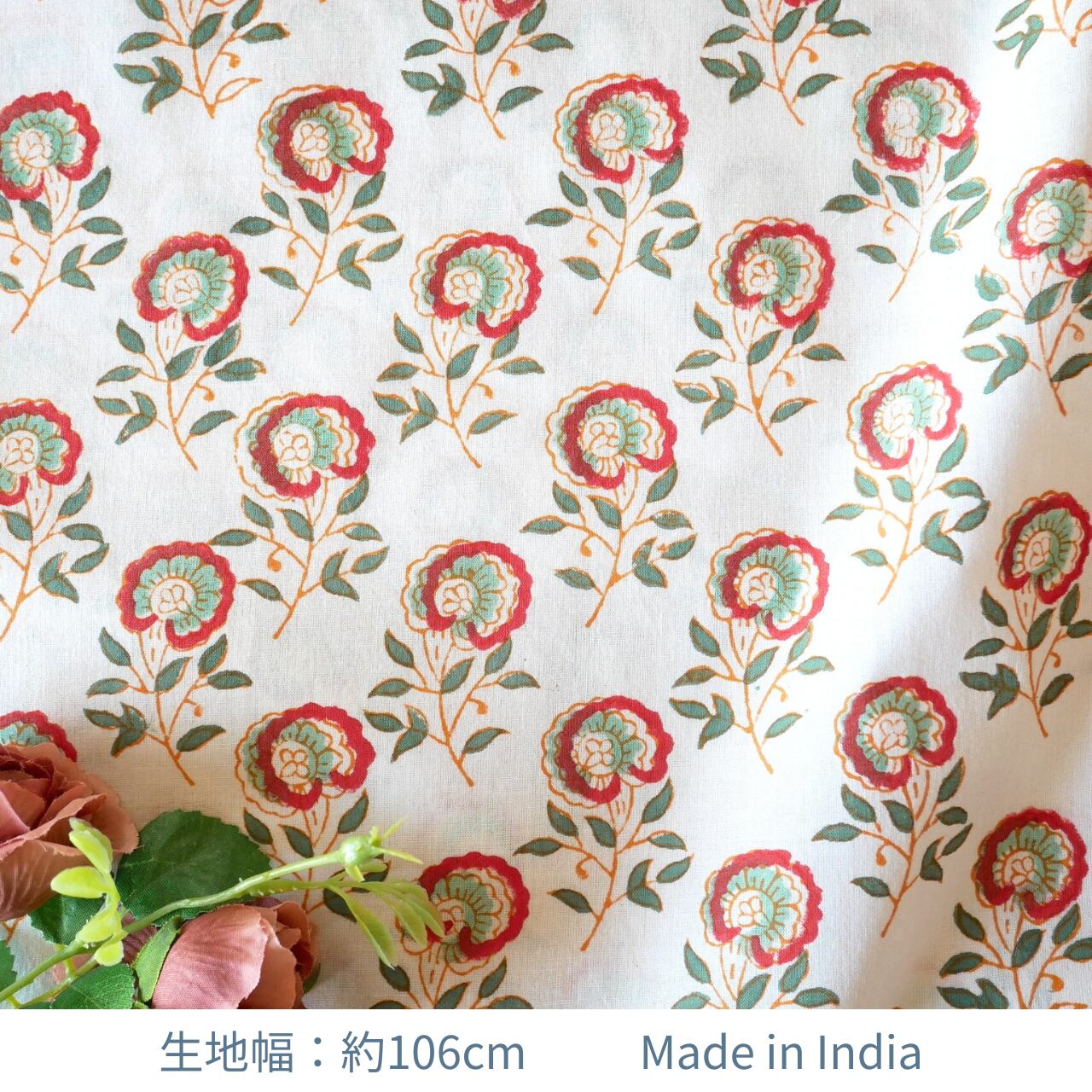 ハンドブロックプリント生地 インド更紗 綿生地 ホワイトベース×ライトグリーンフラワー×レッドアクセント 薄手コットン JE-251206