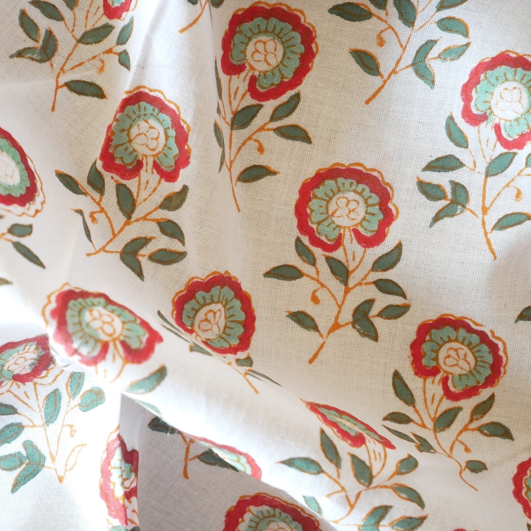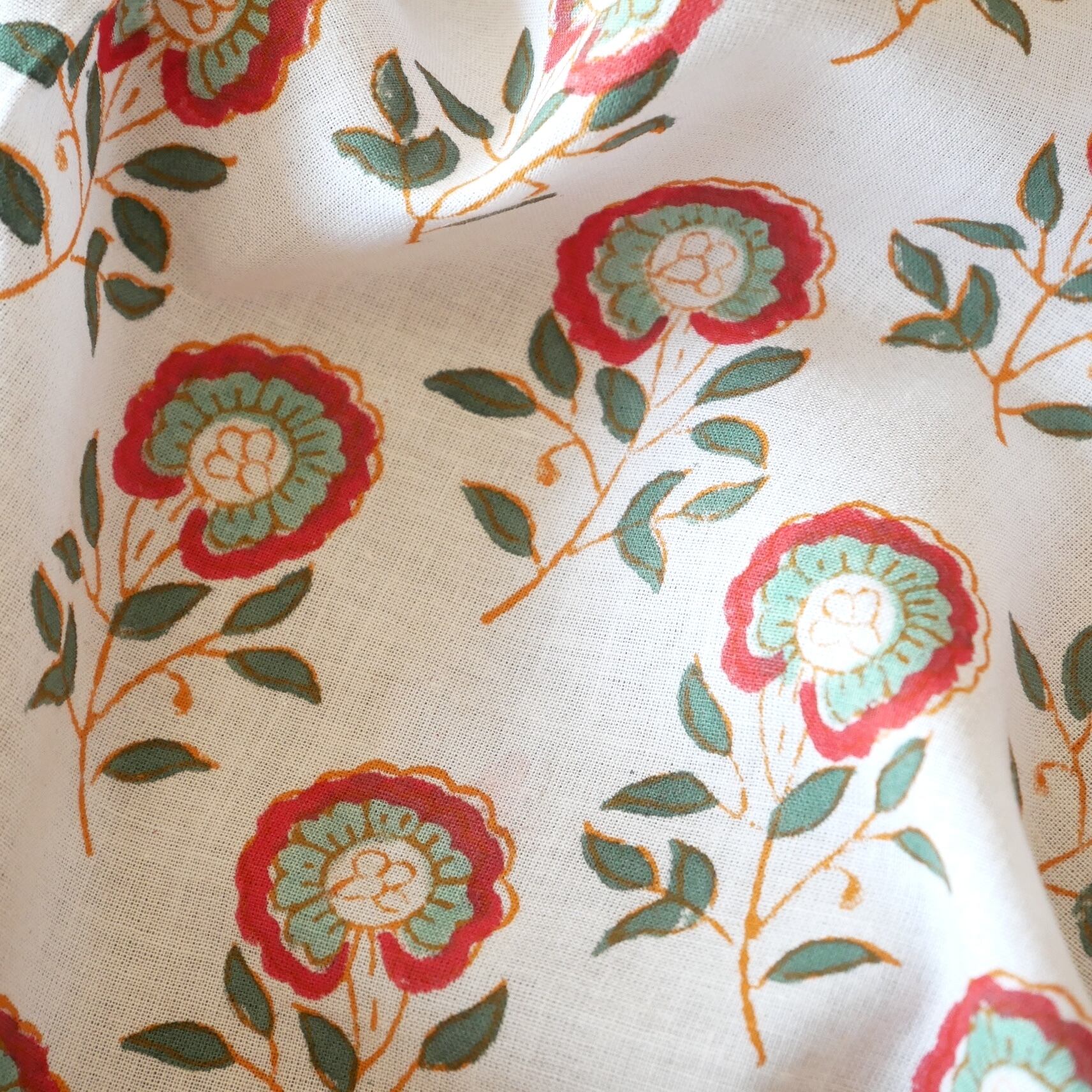 ◾️ライトグリーンの花に赤の縁取り、やさしいレトロ感が広がるインドのブロックプリント