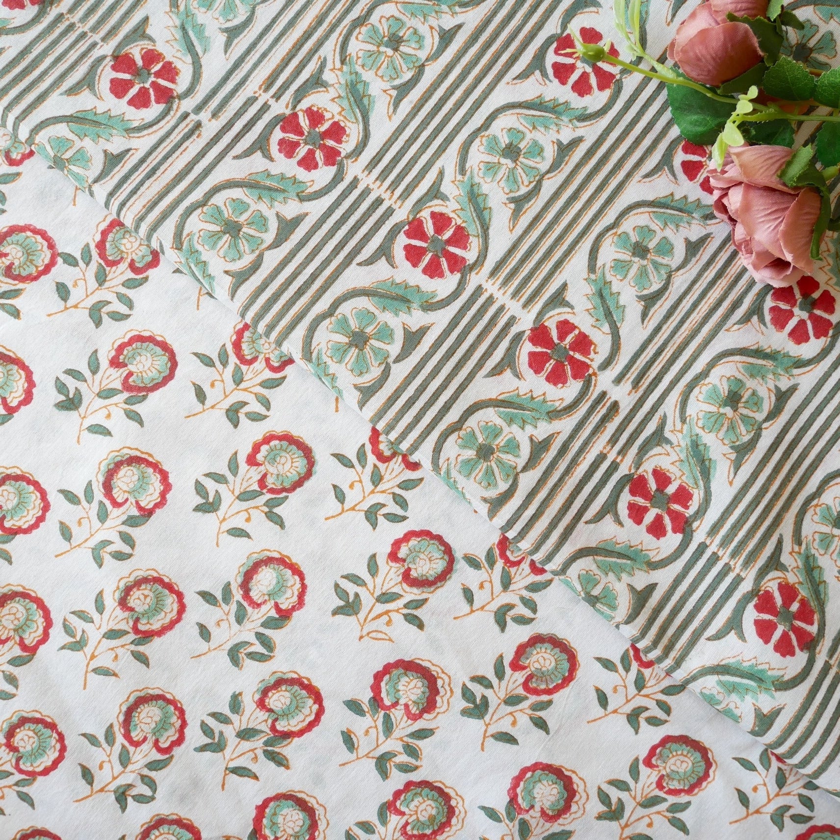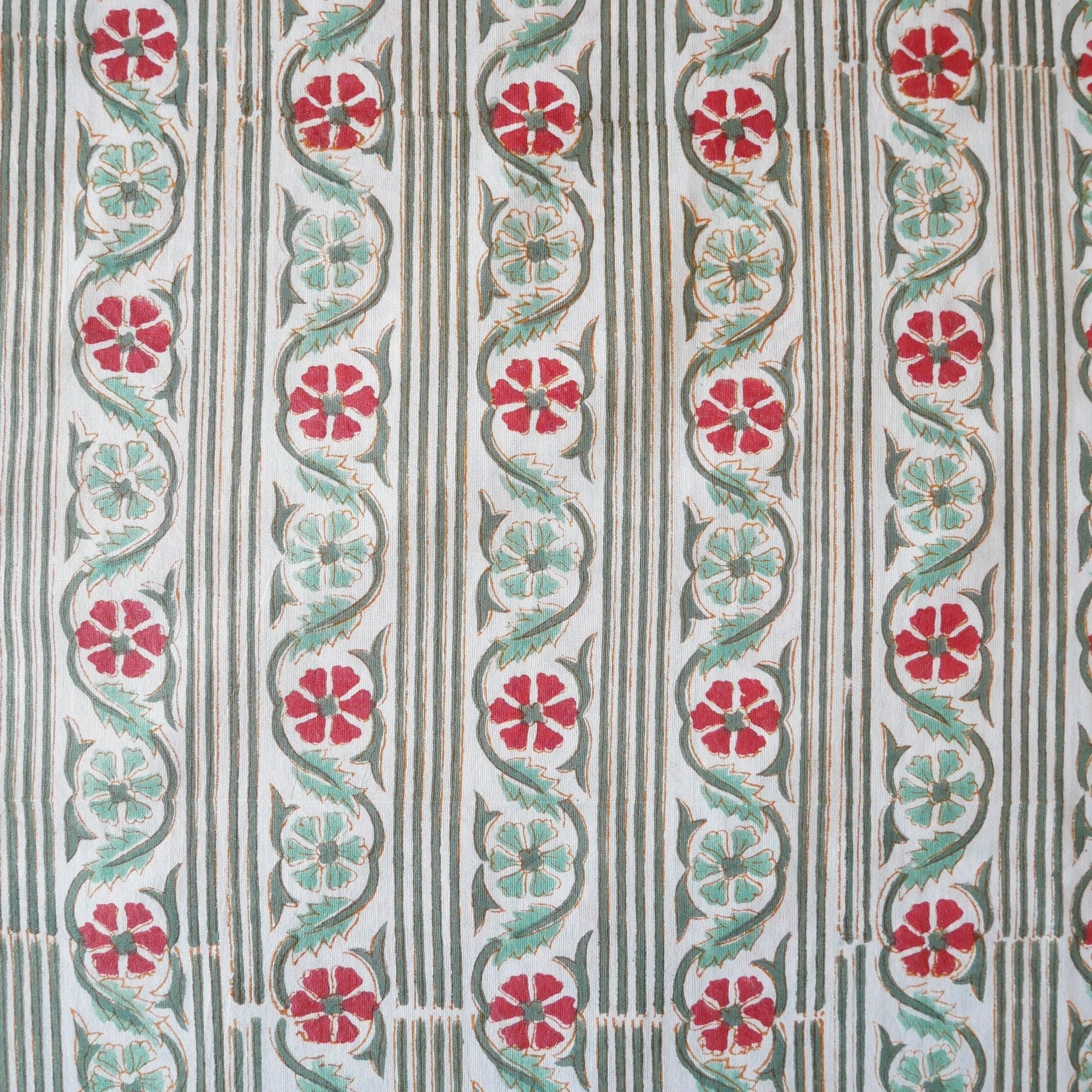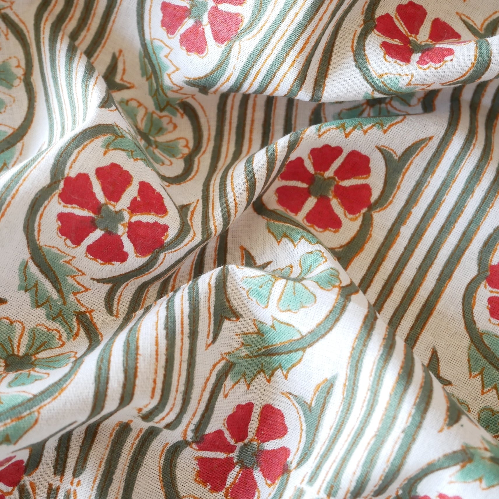 白ベースに縦に伸びるグリーンのストライプ、ライトグリーンとレッドの小花を組み合わせたブロックプリント生地です。