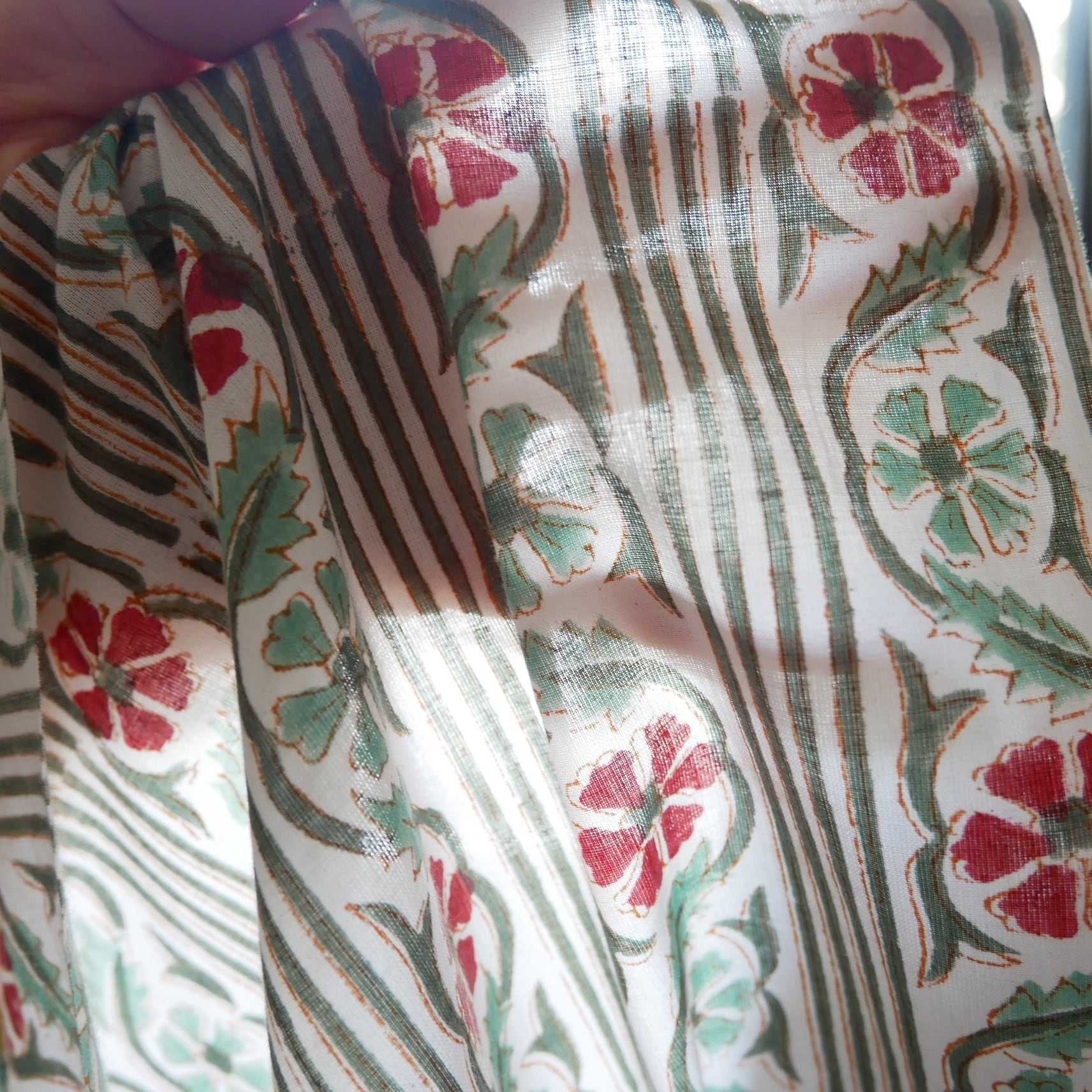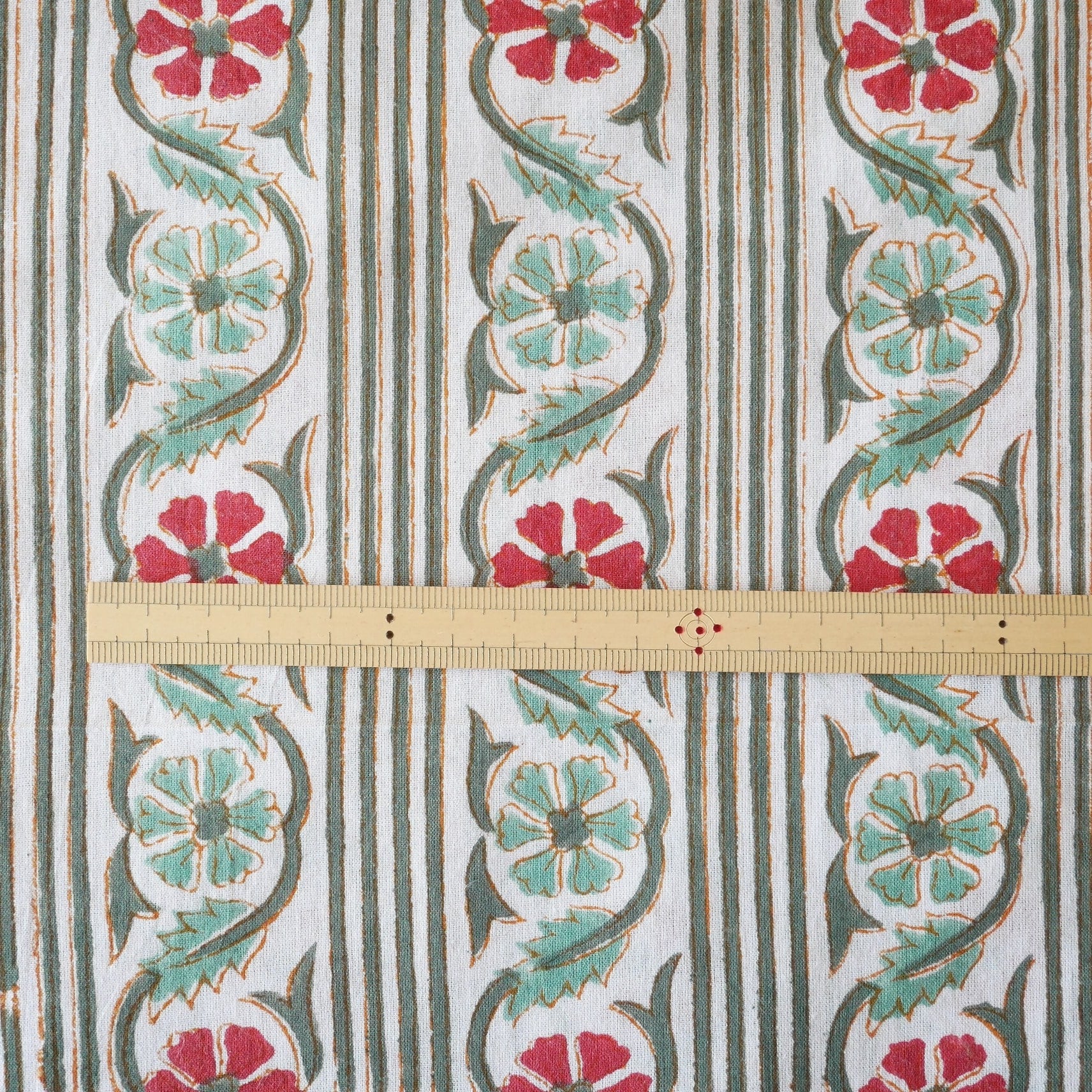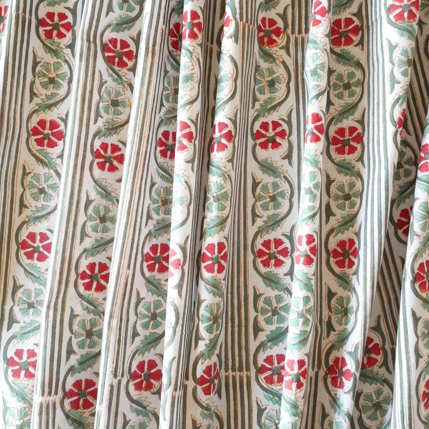 白ベースに縦に伸びるグリーンのストライプ、ライトグリーンとレッドの小花を組み合わせたブロックプリント生地です。