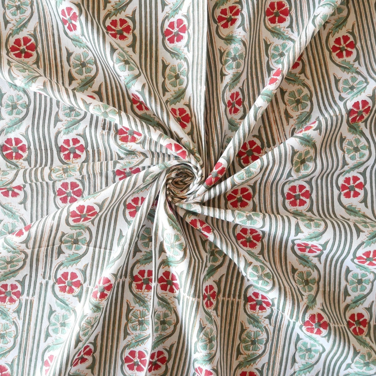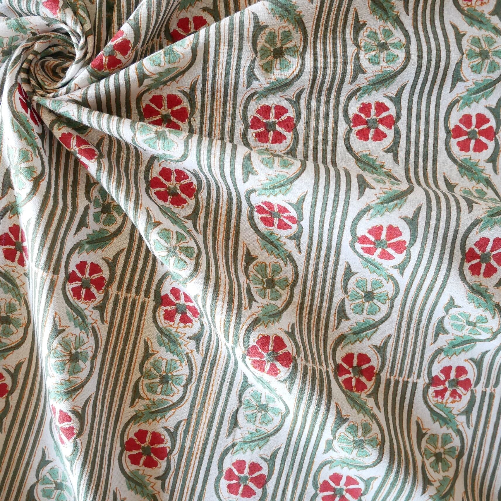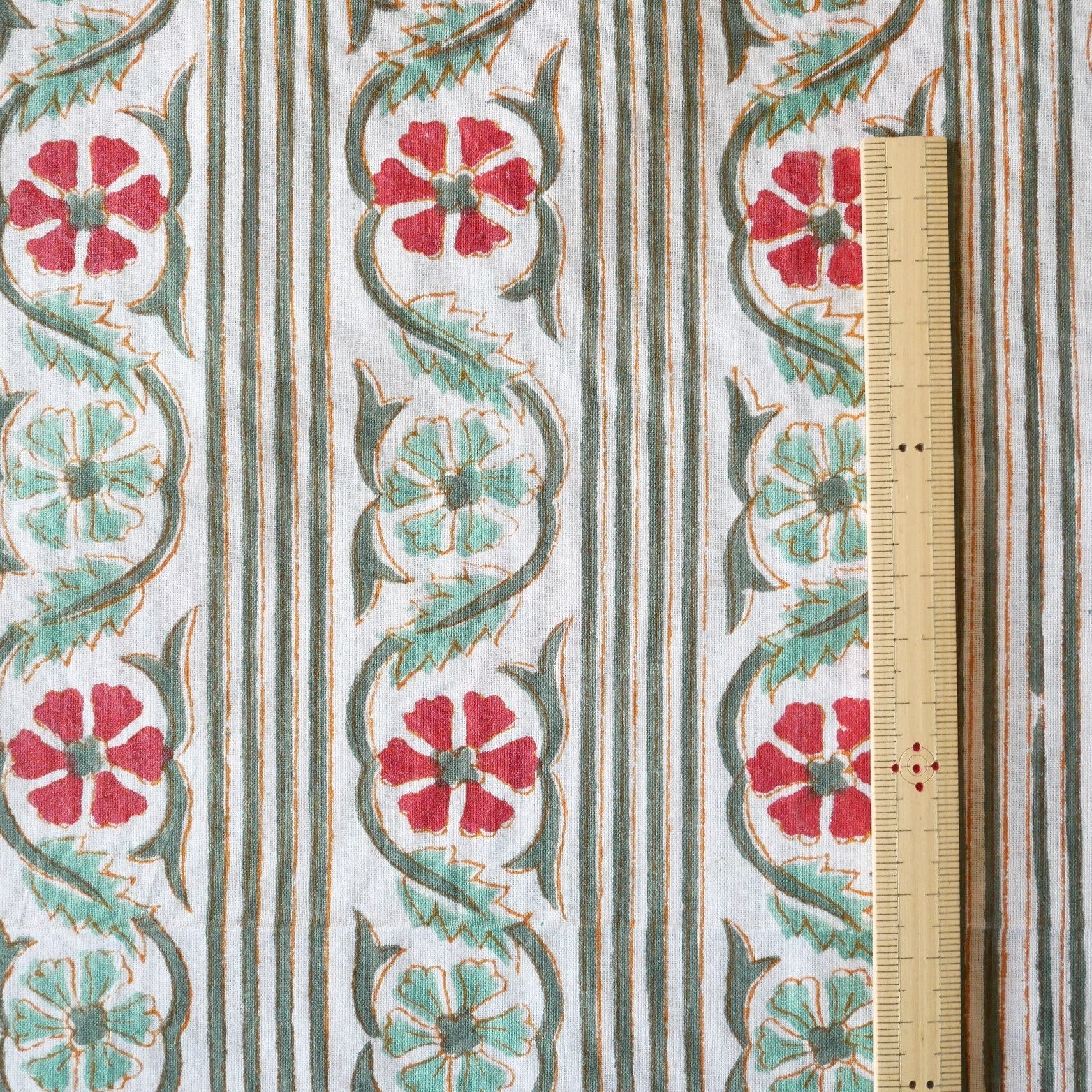 ラスト20点(約2m) ハンドブロックプリント生地 インド更紗 綿生地 ホワイトベース×グリーンストライプ&ライトグリーンとレッドのフラワー 薄手コットン JE-251207