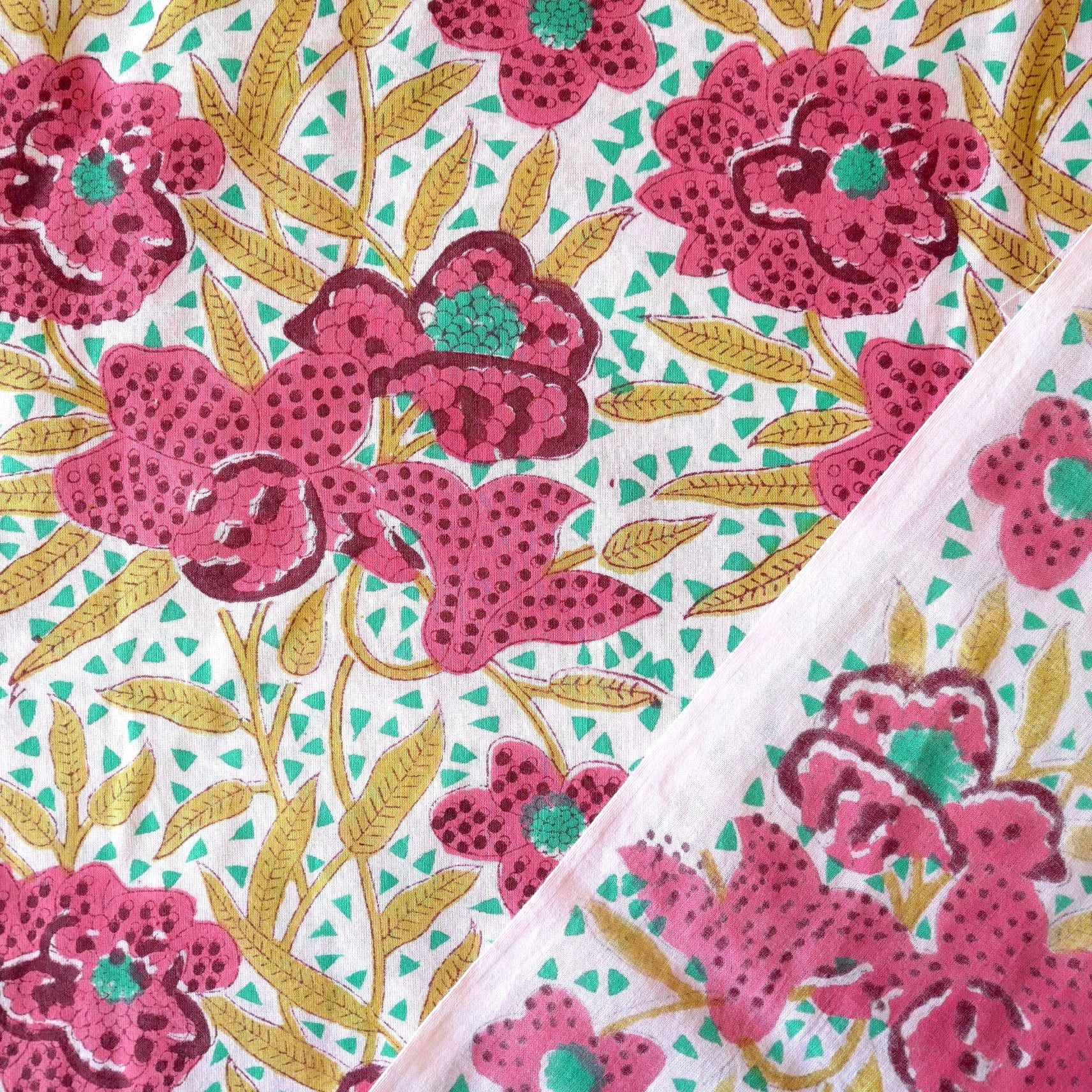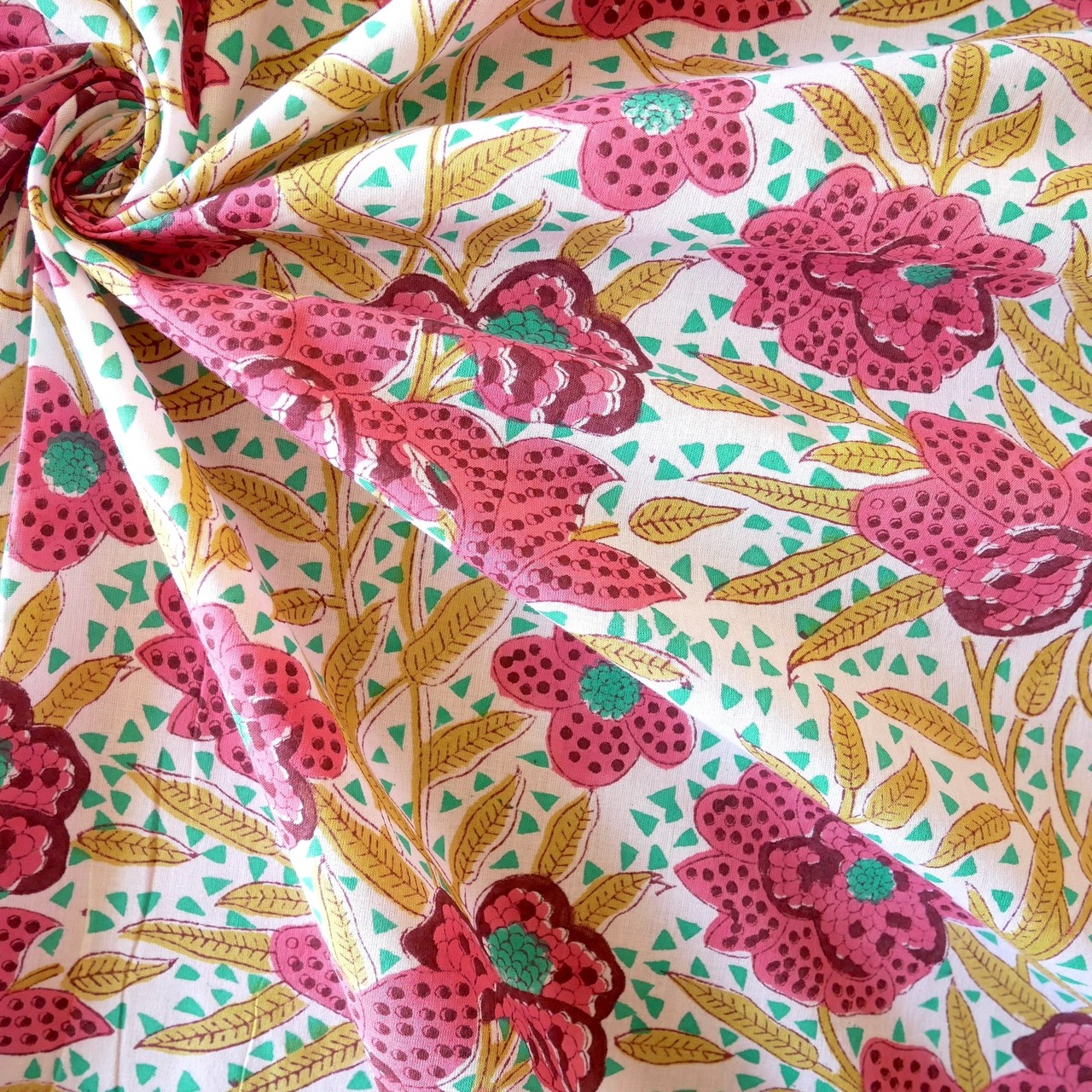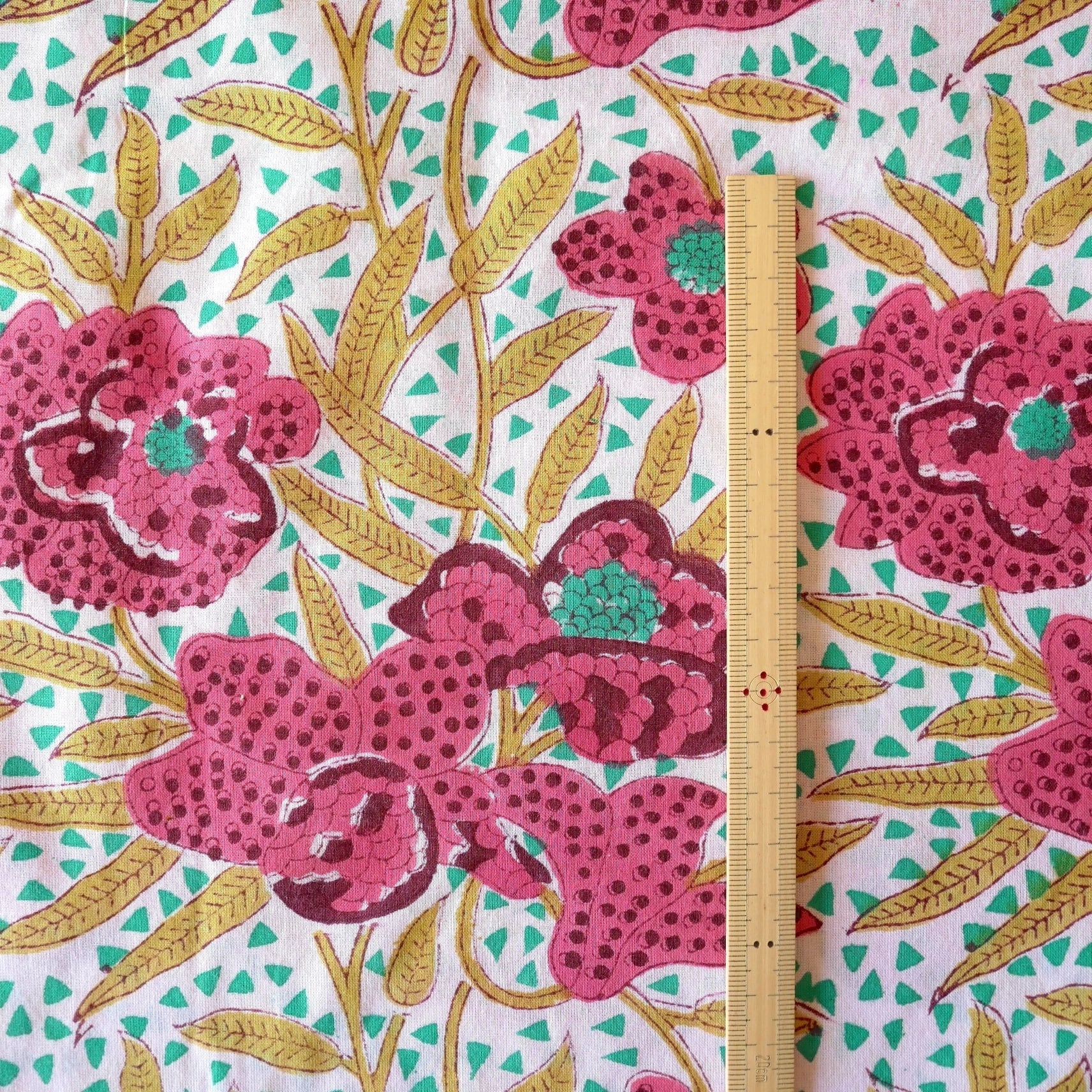 ◾️咲きこぼれそうなピンクの花と軽やかなグリーン。装いの主役になる華やぎボタニカル!インドのハンドブロックプリント生地