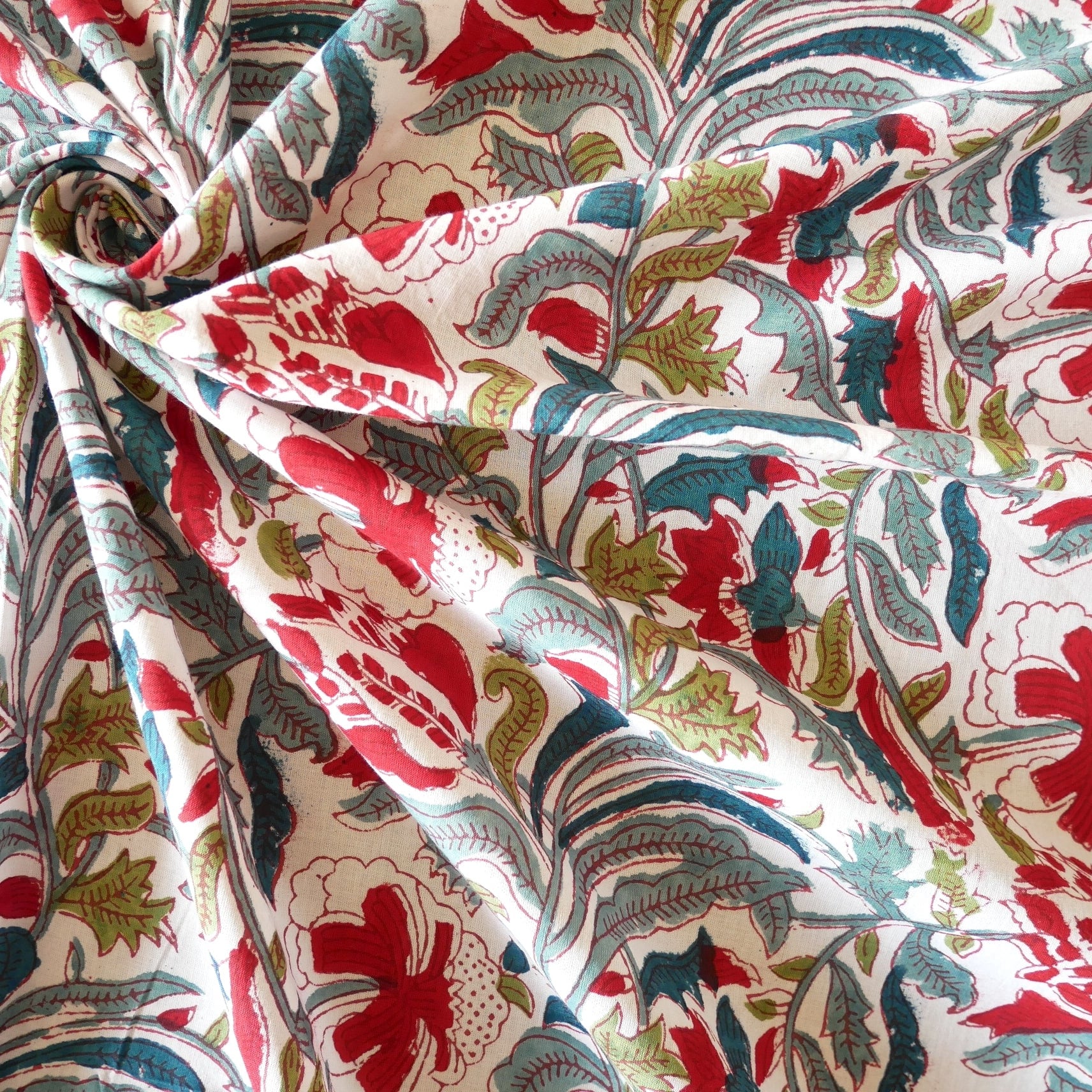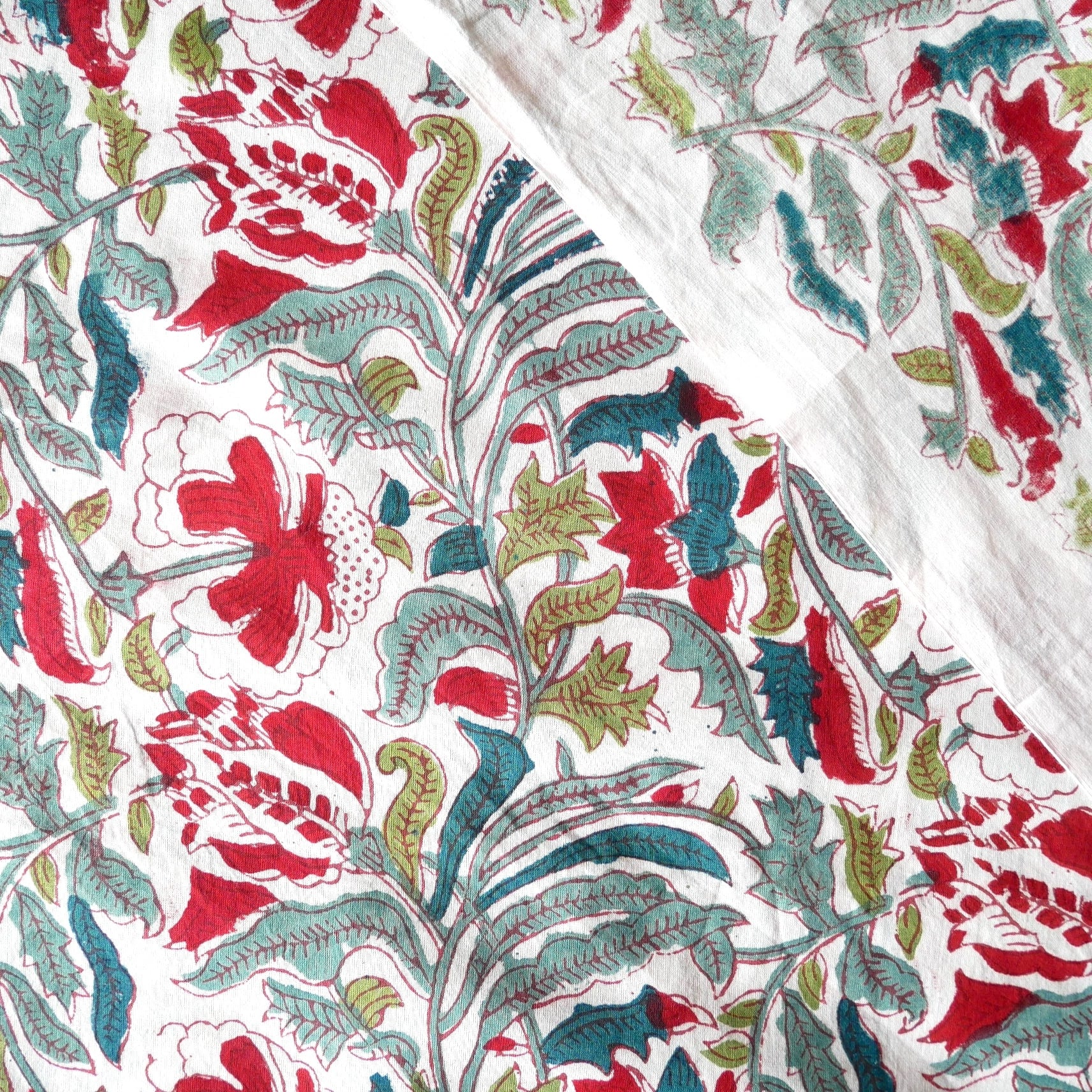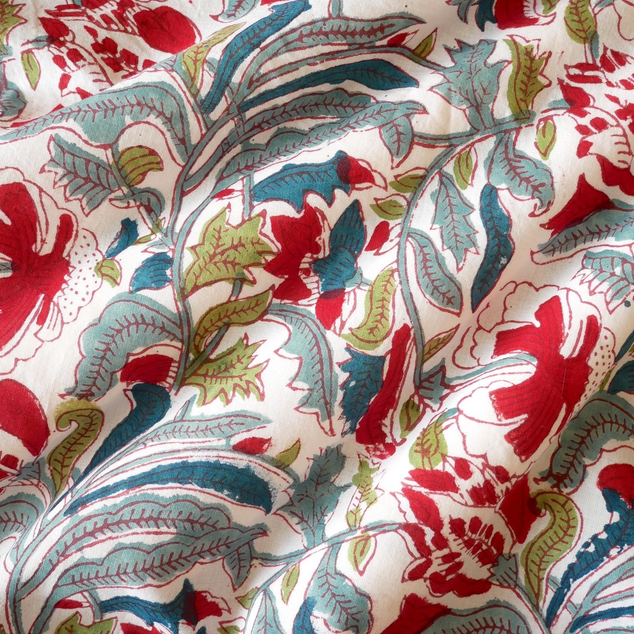 ハンドブロックプリント生地 インド更紗 綿生地 ホワイトベース×レッド&ピーコックブルー ボタニカル柄 薄手コットン JE-251209