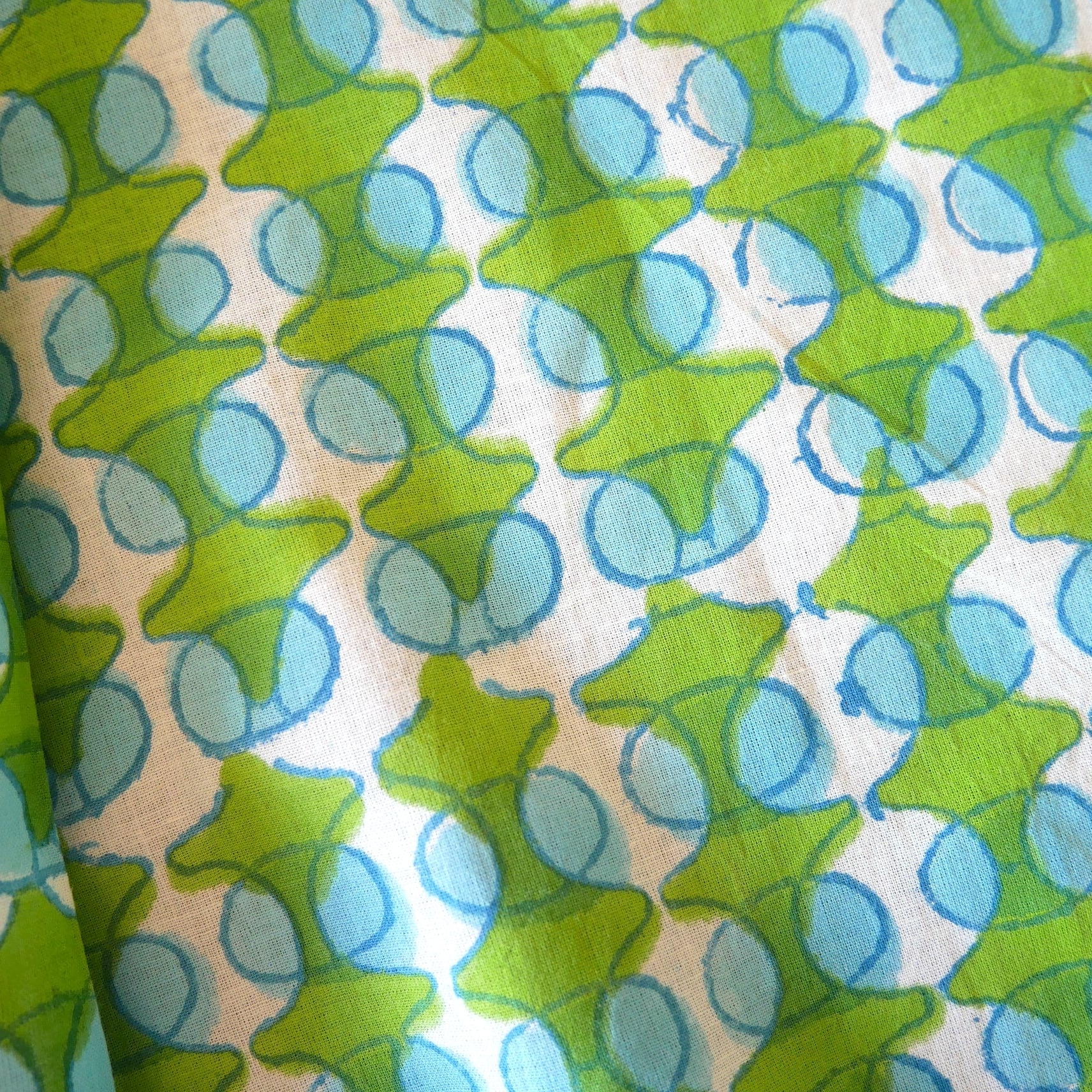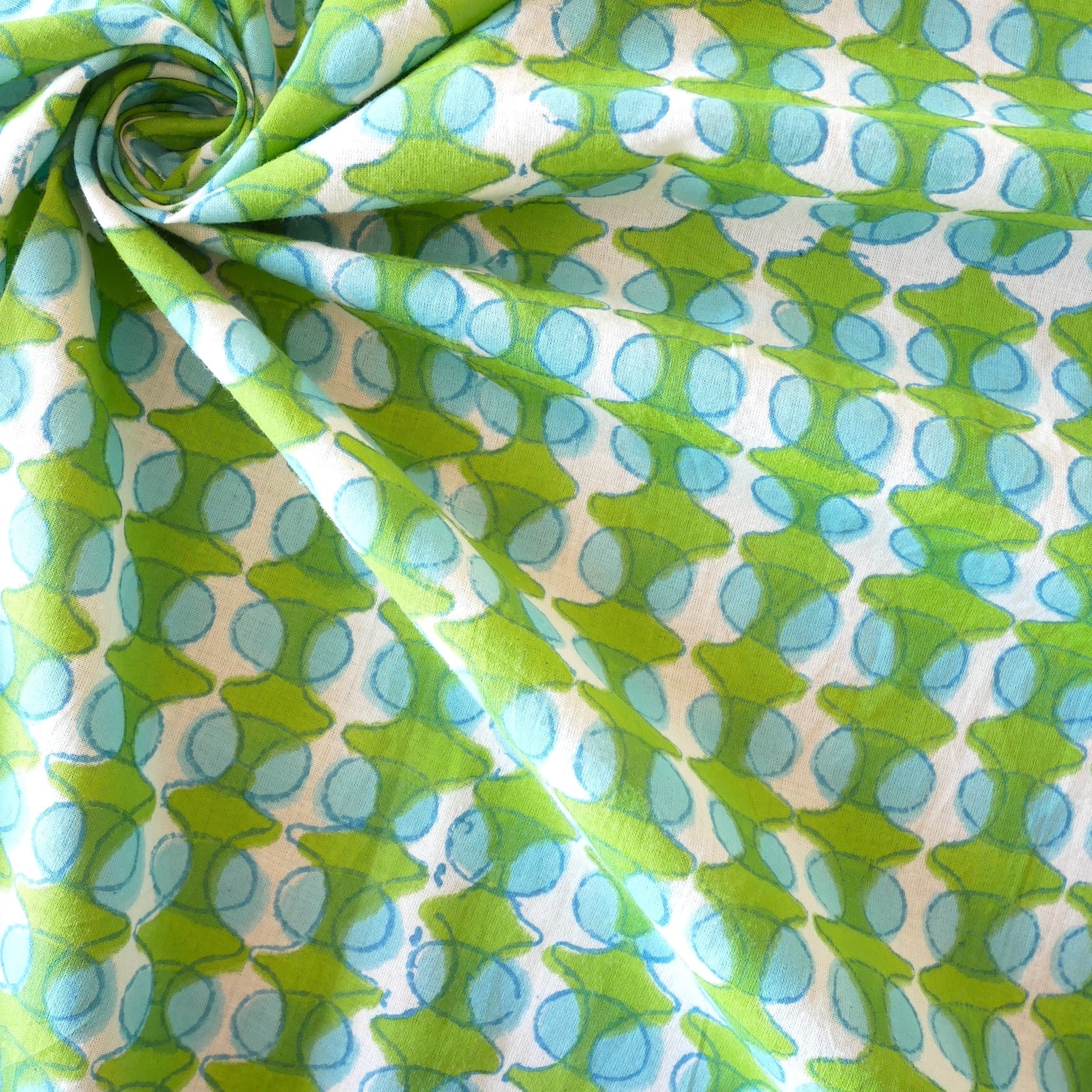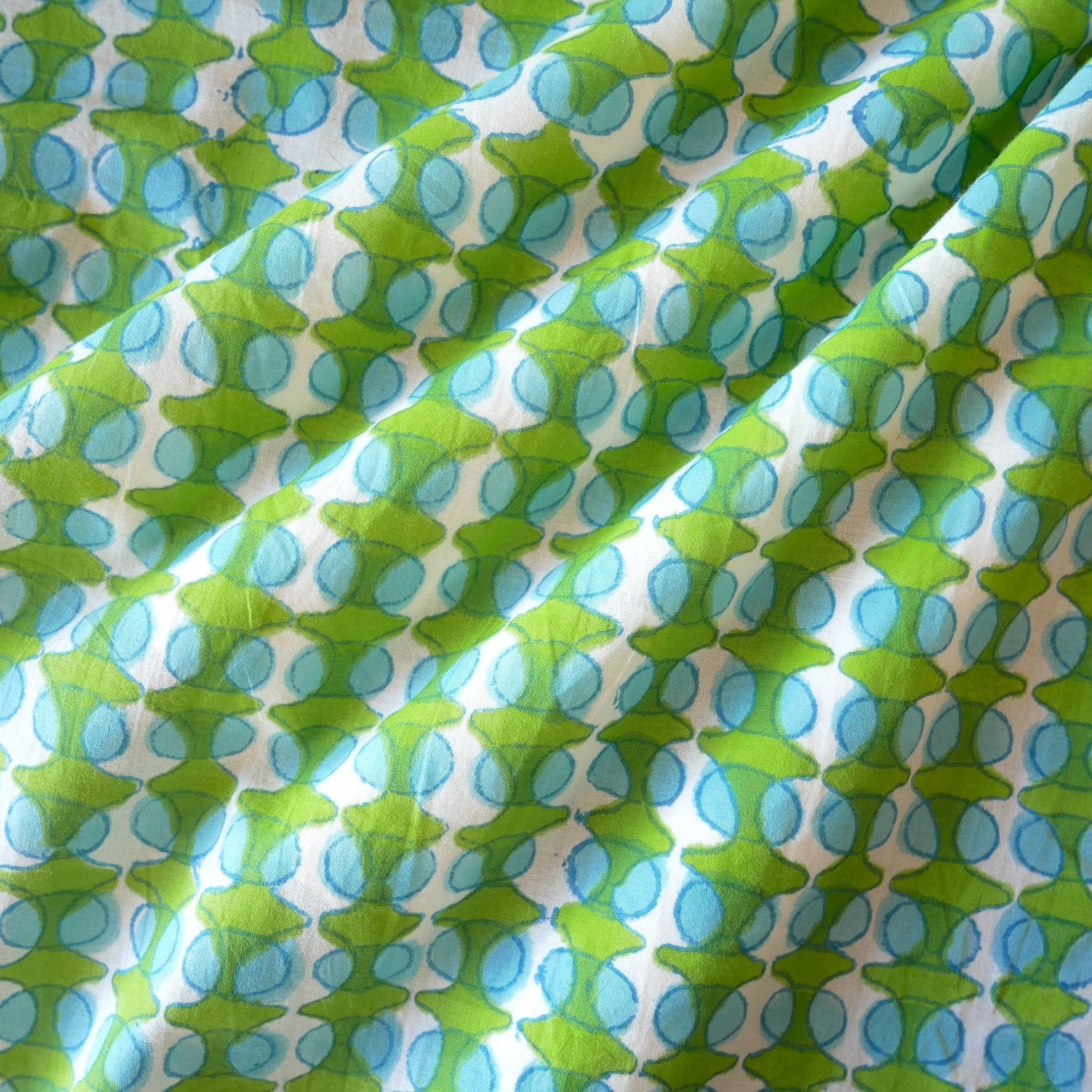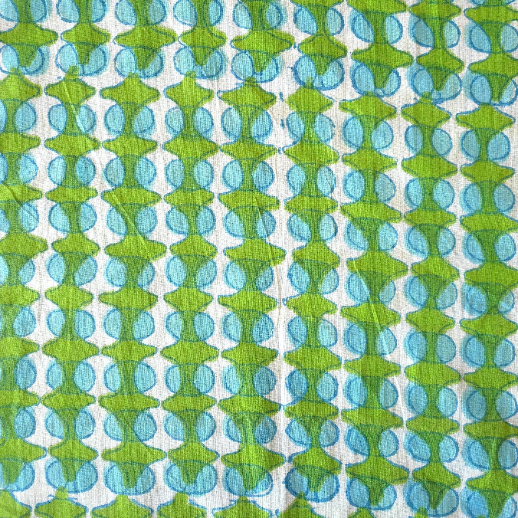 鮮やかなグリーンの幾何学模様と水色の丸モチーフがリズムよく並んだ、みているだけで楽しくなるインドのブロックプリント生地です。