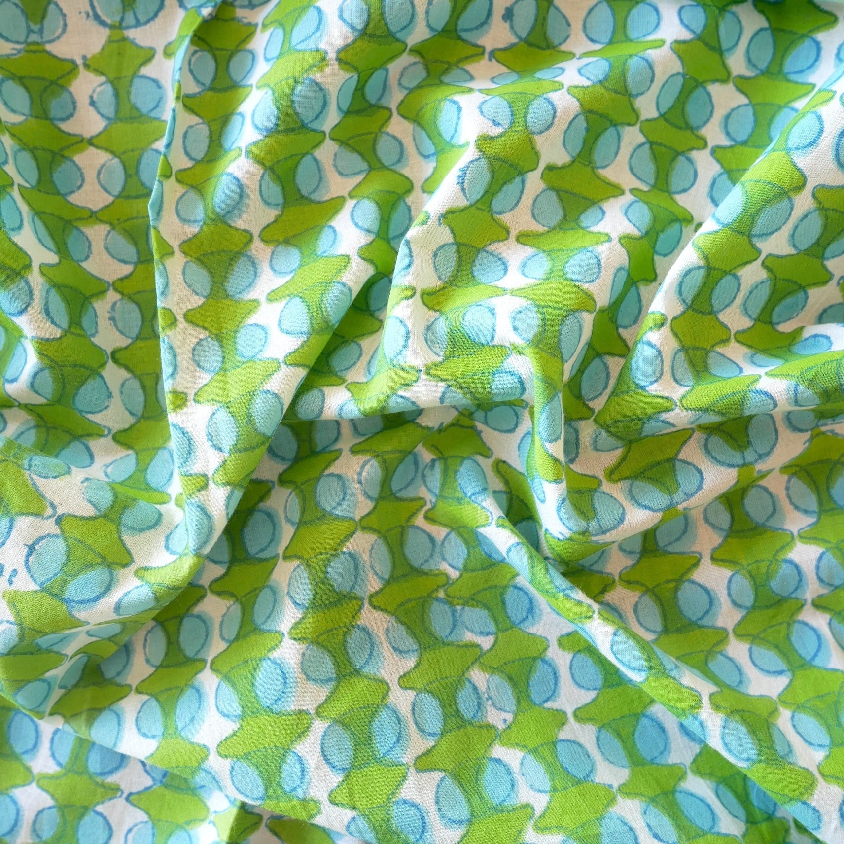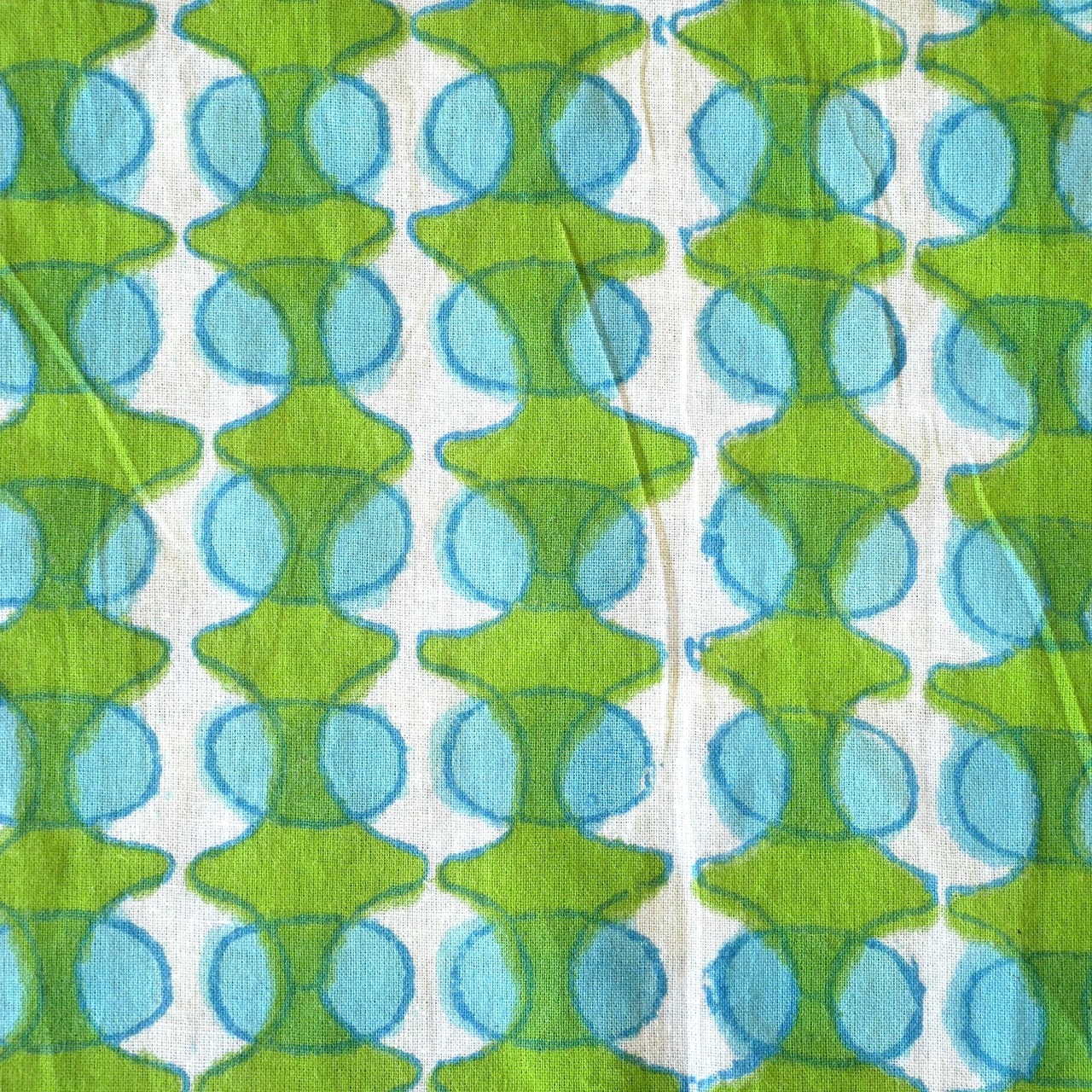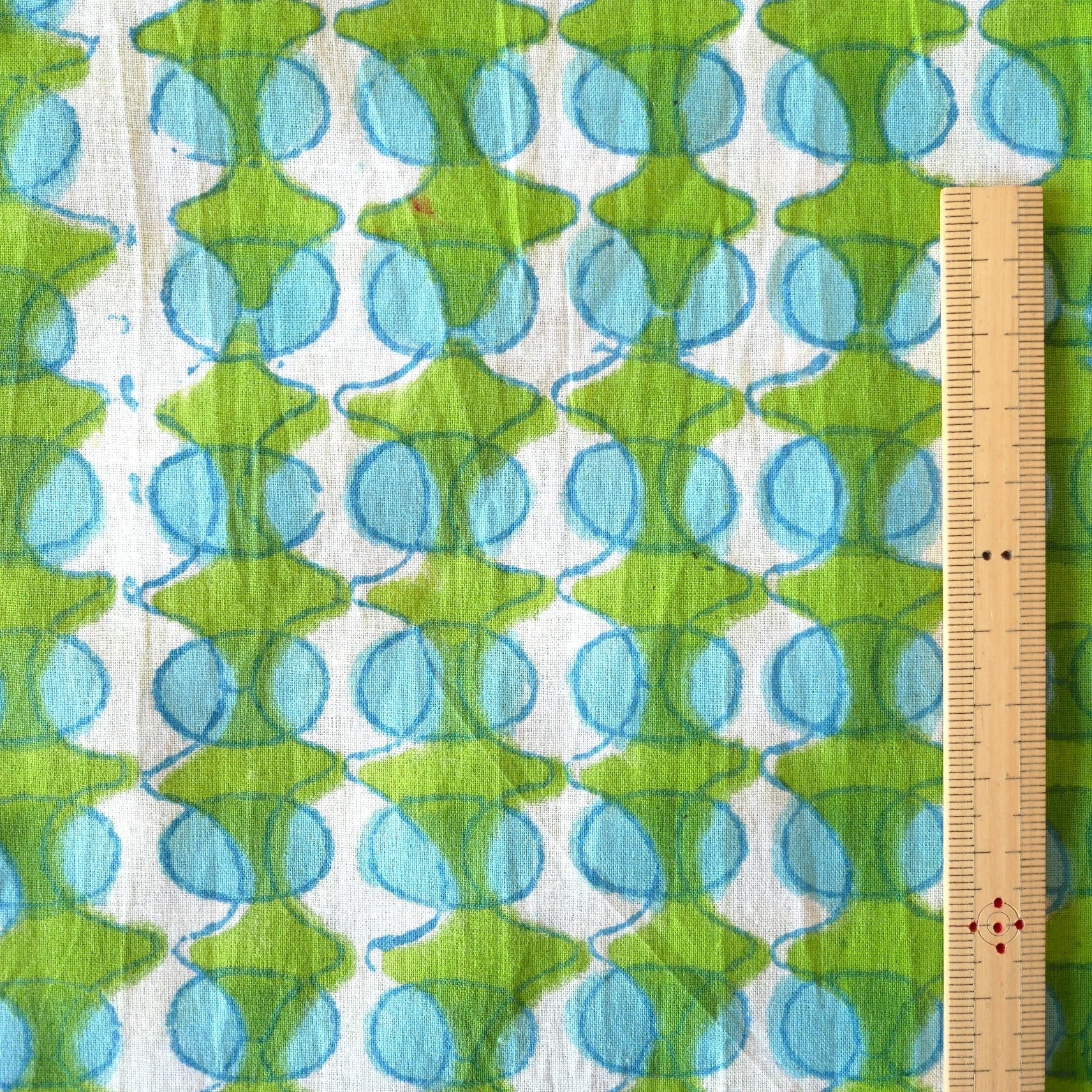 鮮やかなグリーンの幾何学模様と水色の丸モチーフがリズムよく並んだ、みているだけで楽しくなるインドのブロックプリント生地です。