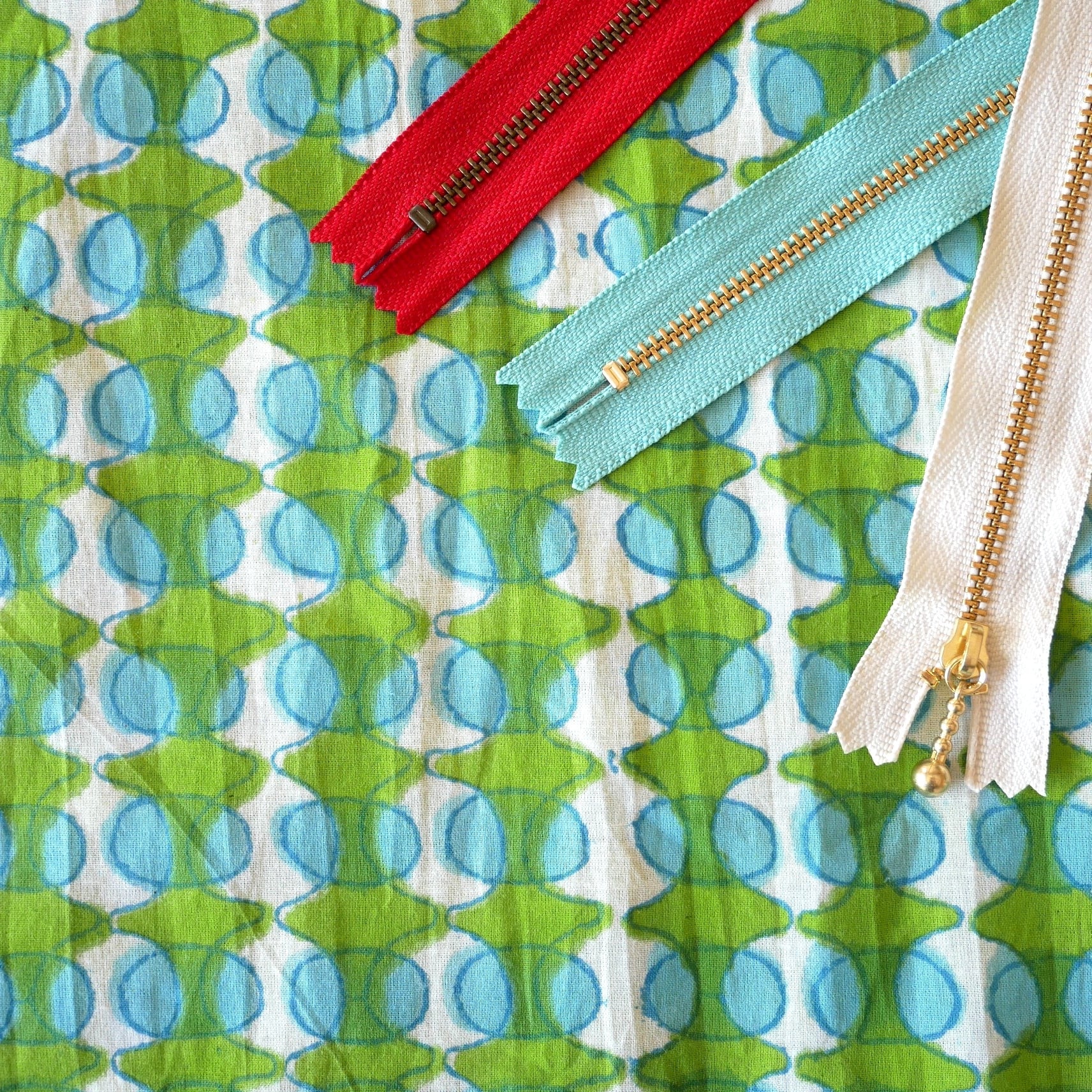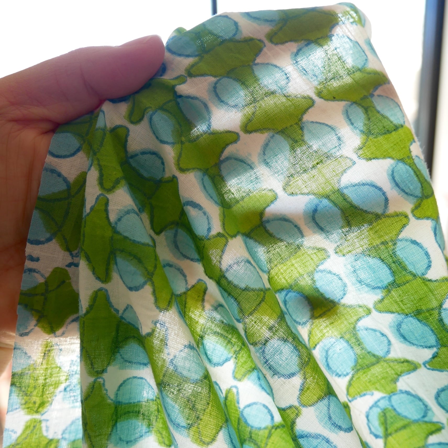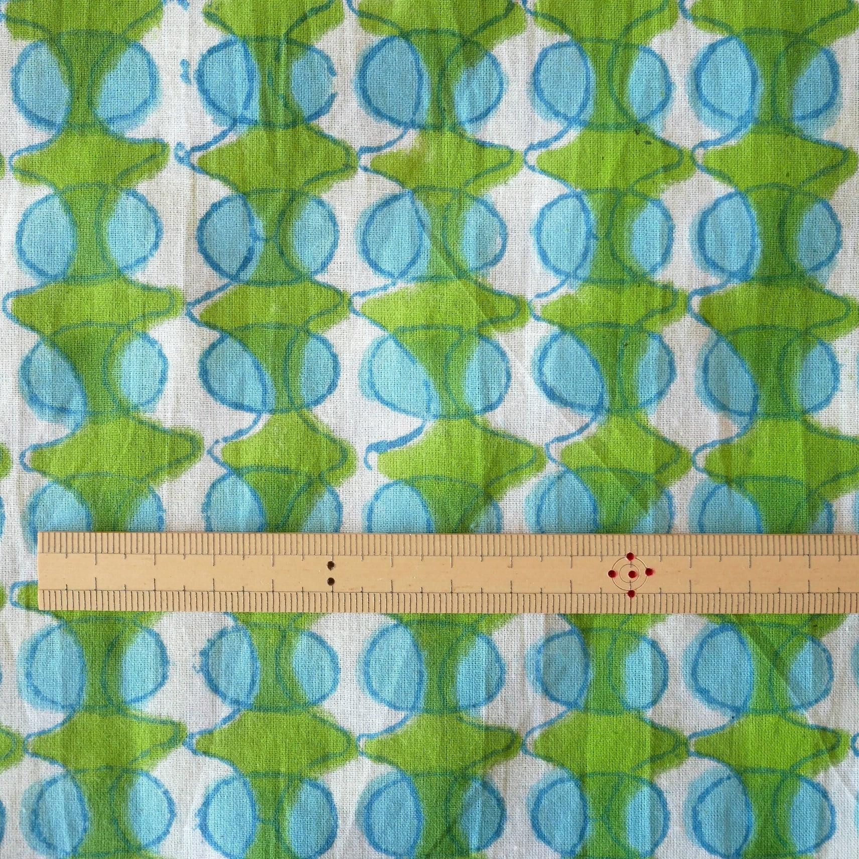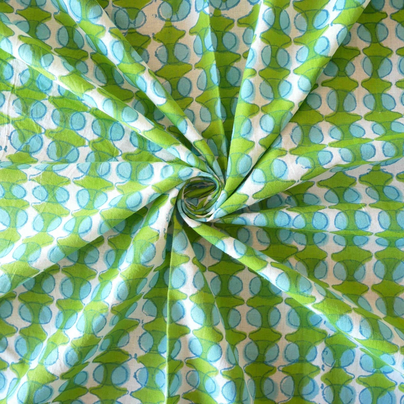 鮮やかなグリーンの幾何学模様と水色の丸モチーフがリズムよく並んだ、みているだけで楽しくなるインドのブロックプリント生地です。