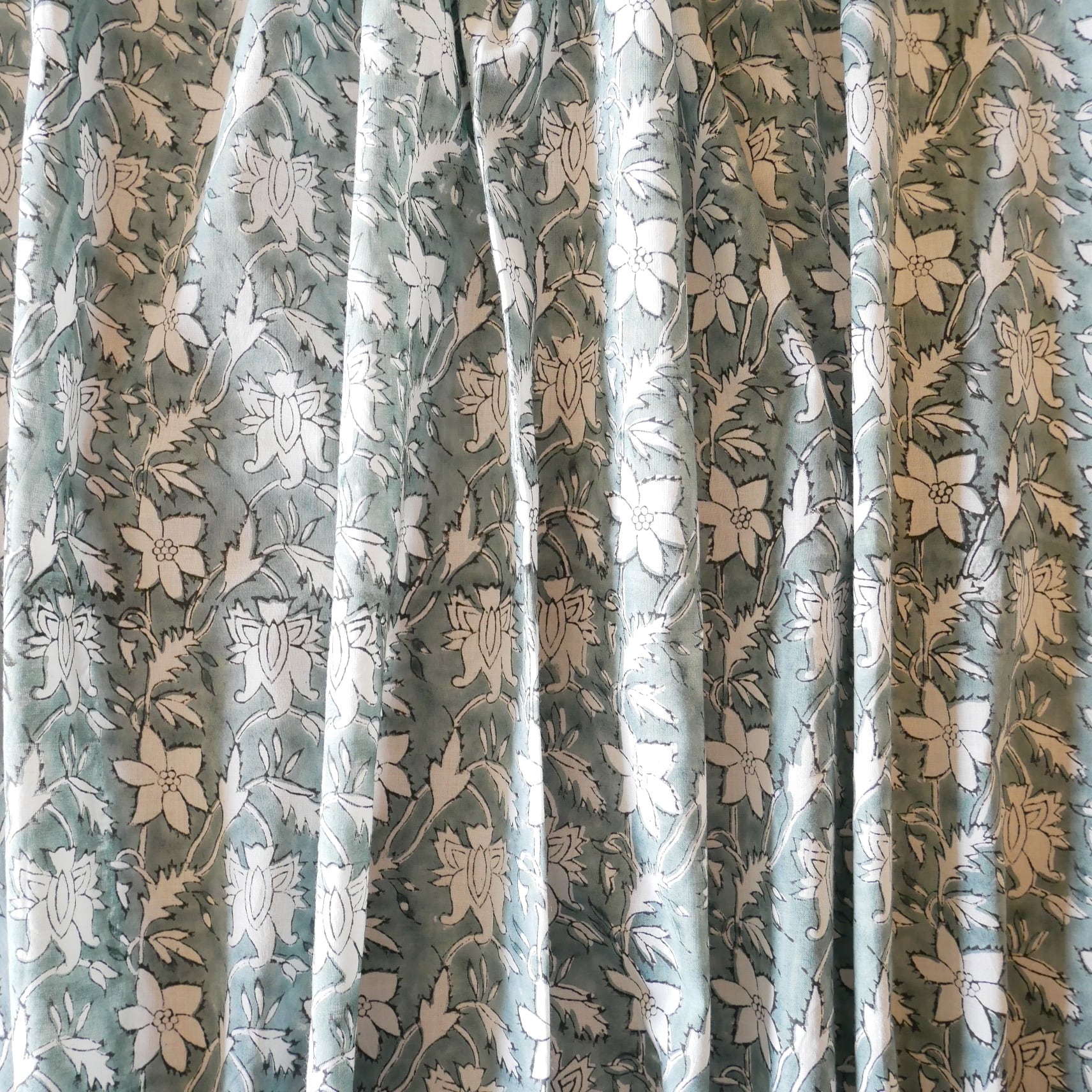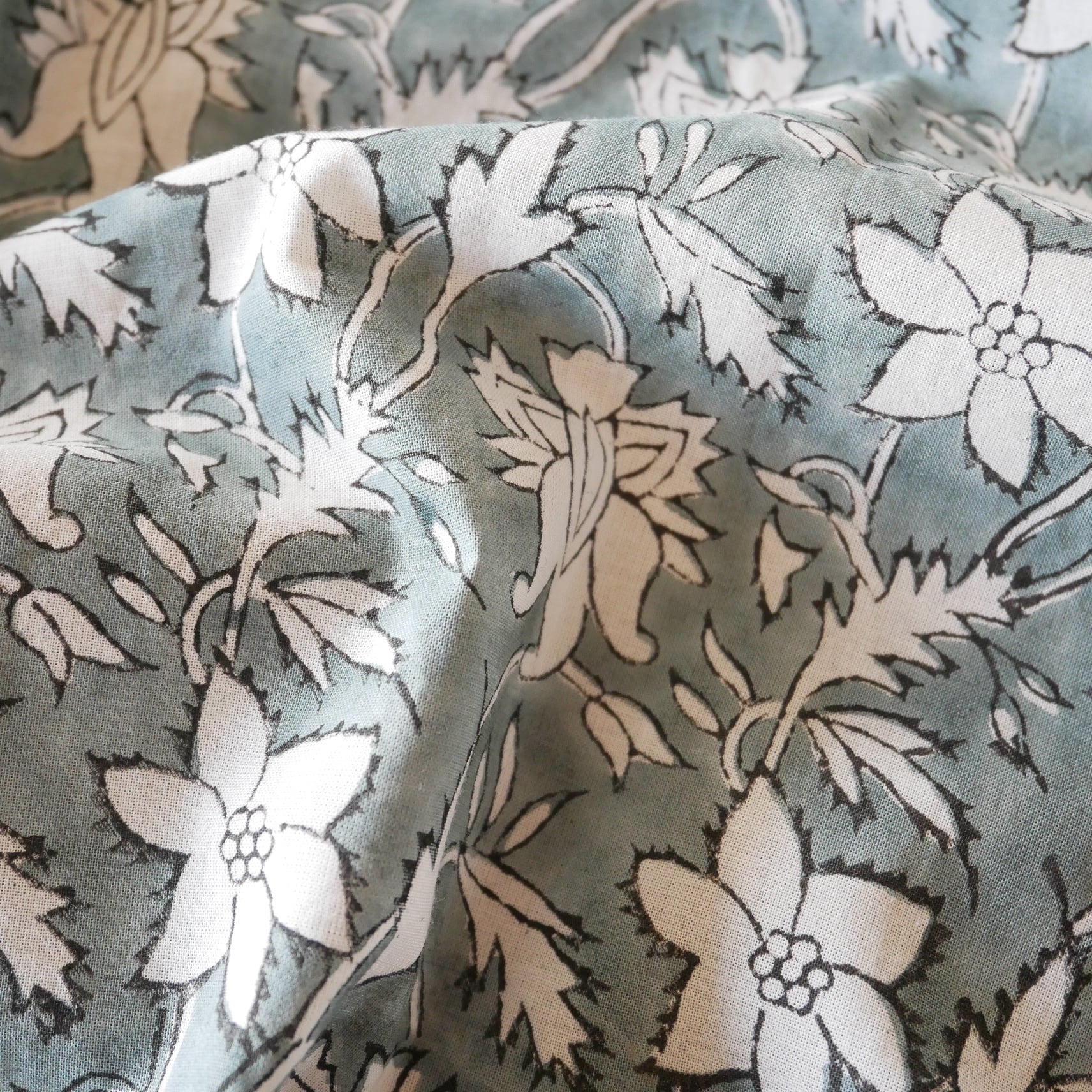 この生地は、インドの伝統的なハンドブロックプリント技法により、木版を使い、一色一色手作業でプリントされています。わずかなズレや色の重なりは、機械プリントにはない、手仕事ならではの温もりです。