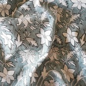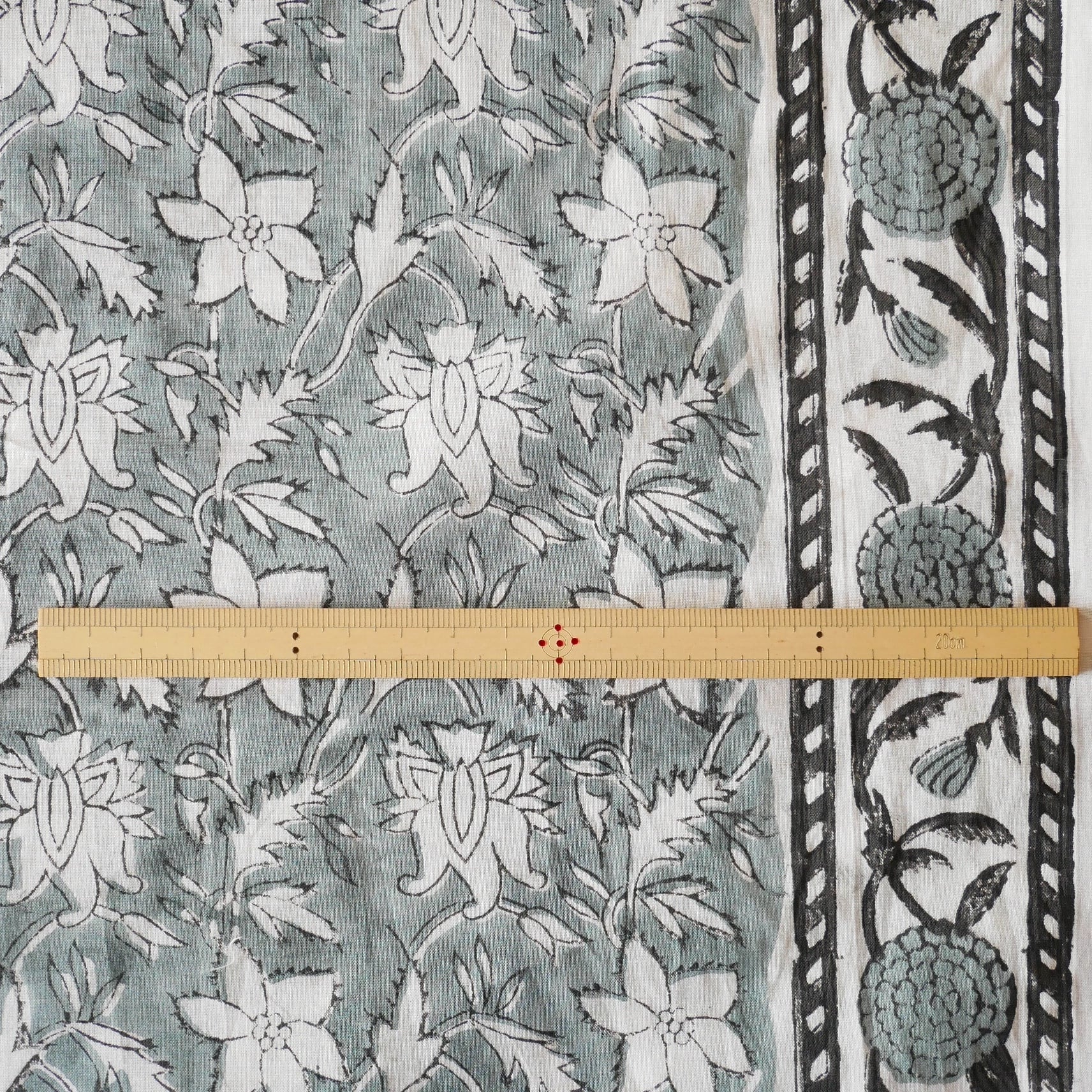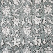 グレーベースに、白抜きで描かれたボタニカルモチーフが連なるハンドブロックプリント生地です。