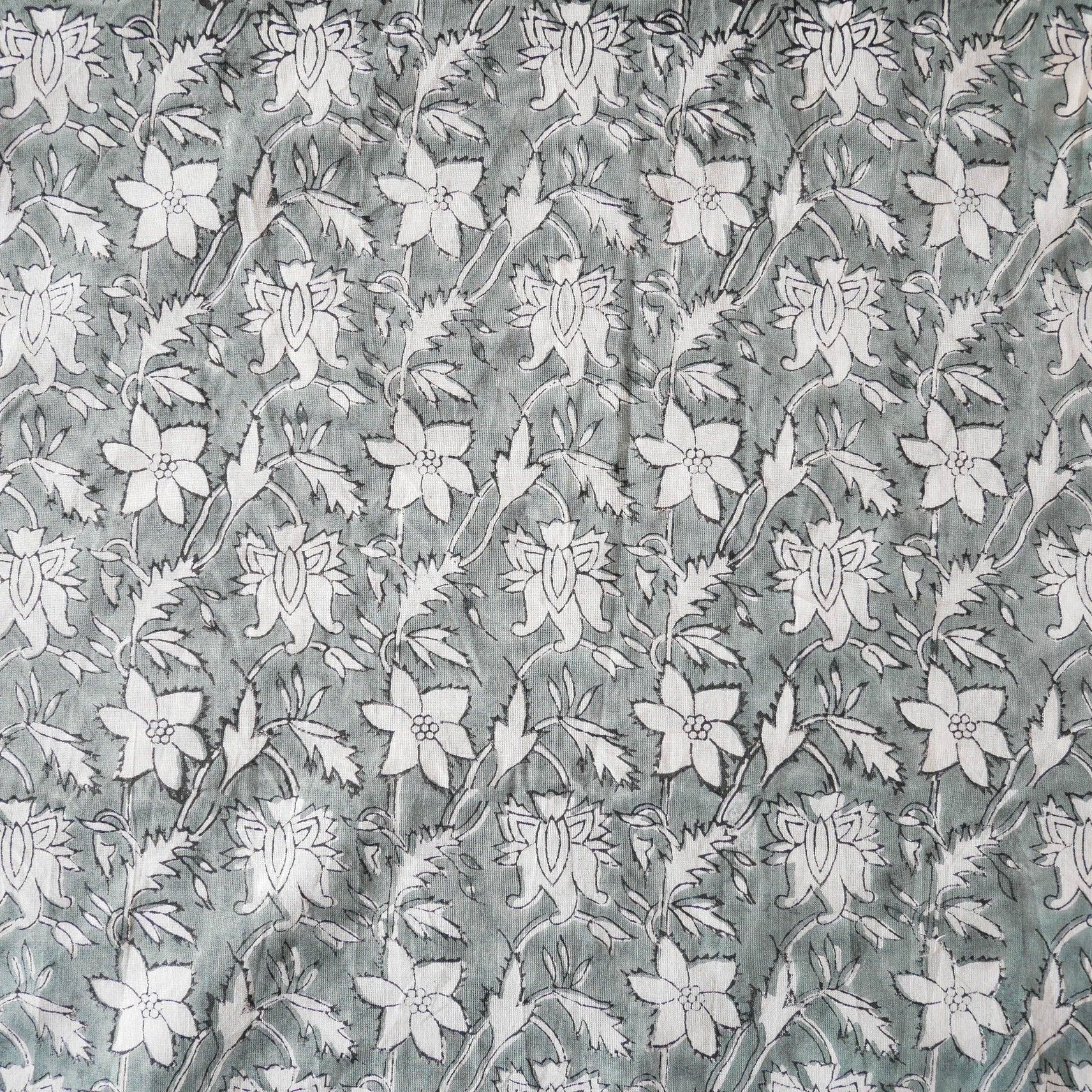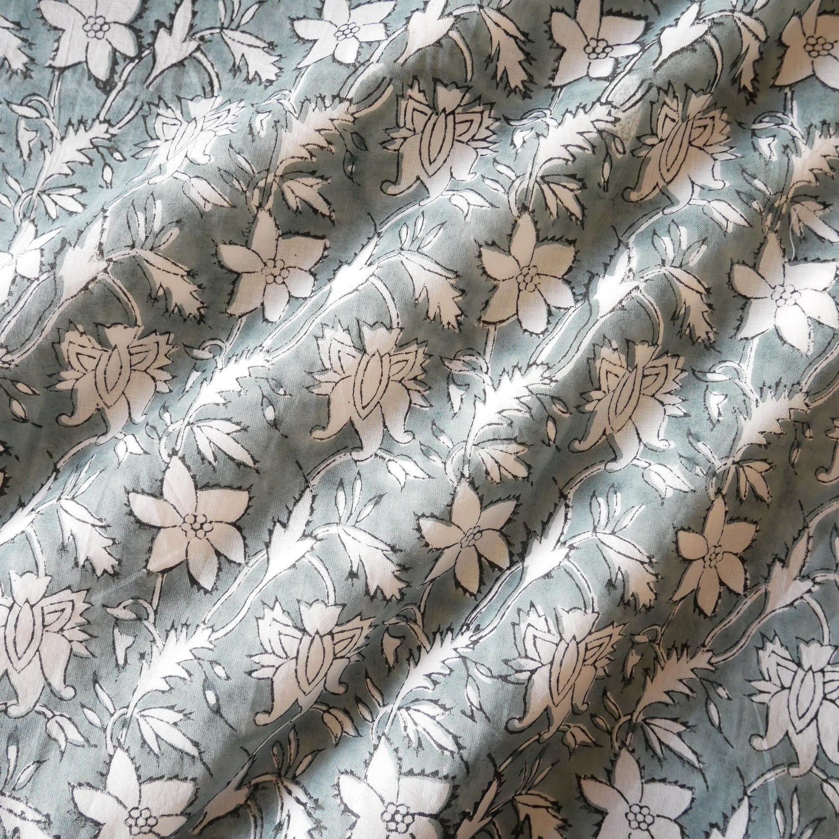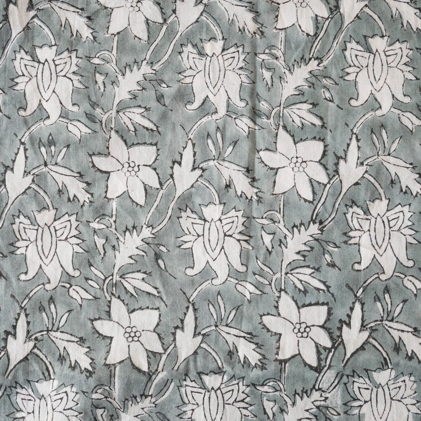 ハンドブロックプリント生地 インド更紗 綿生地 グレーベース×白抜きボタニカル柄 薄手コットン JE-260105