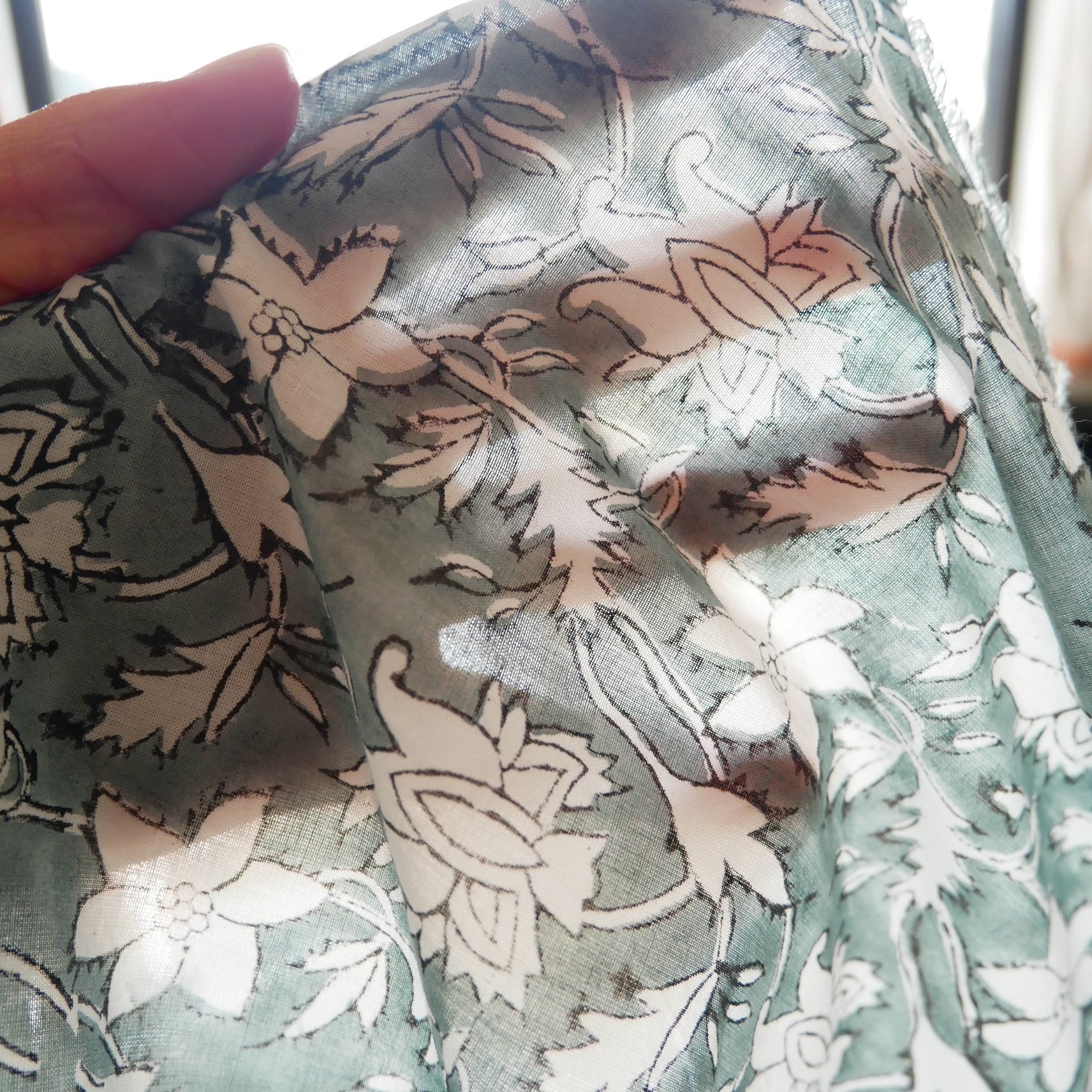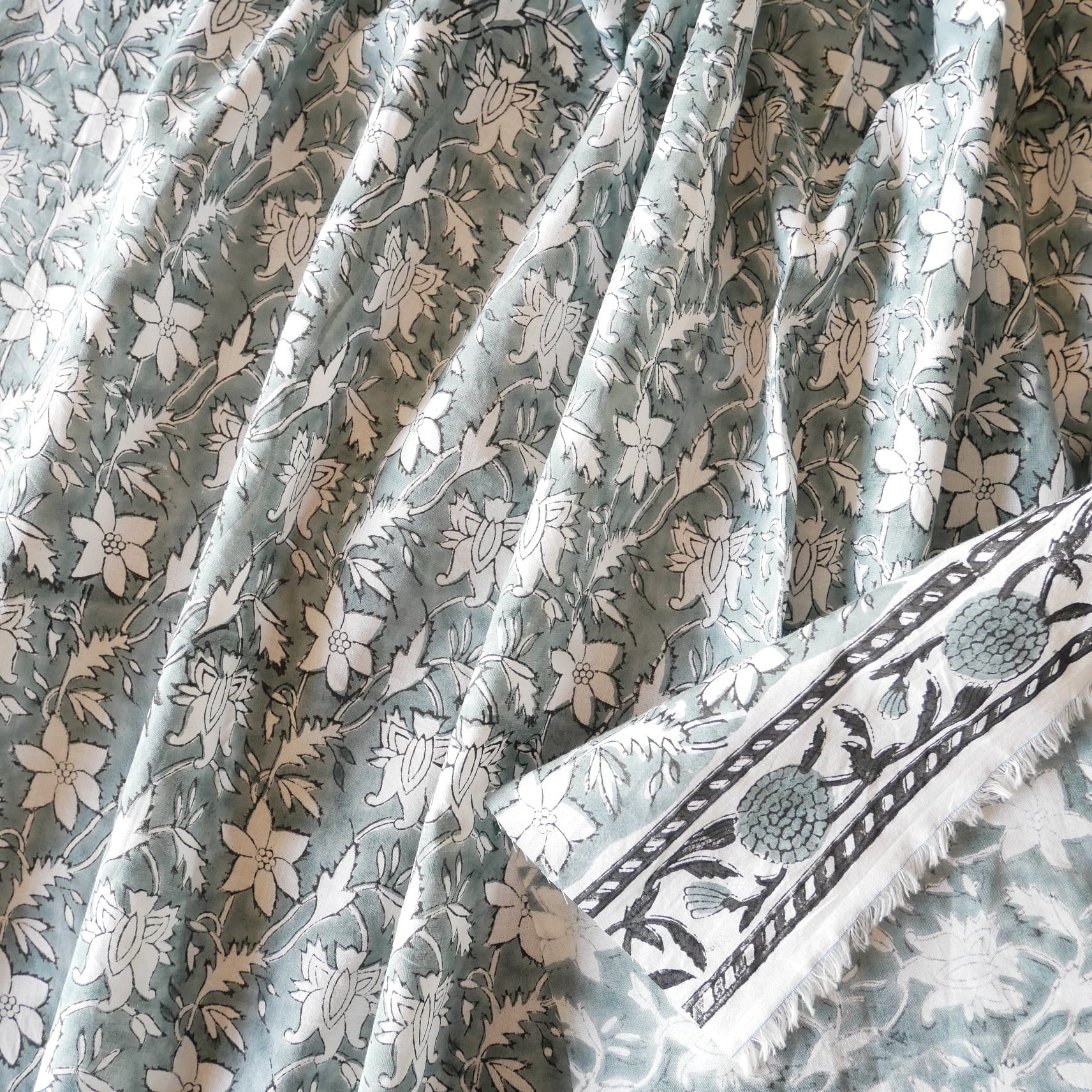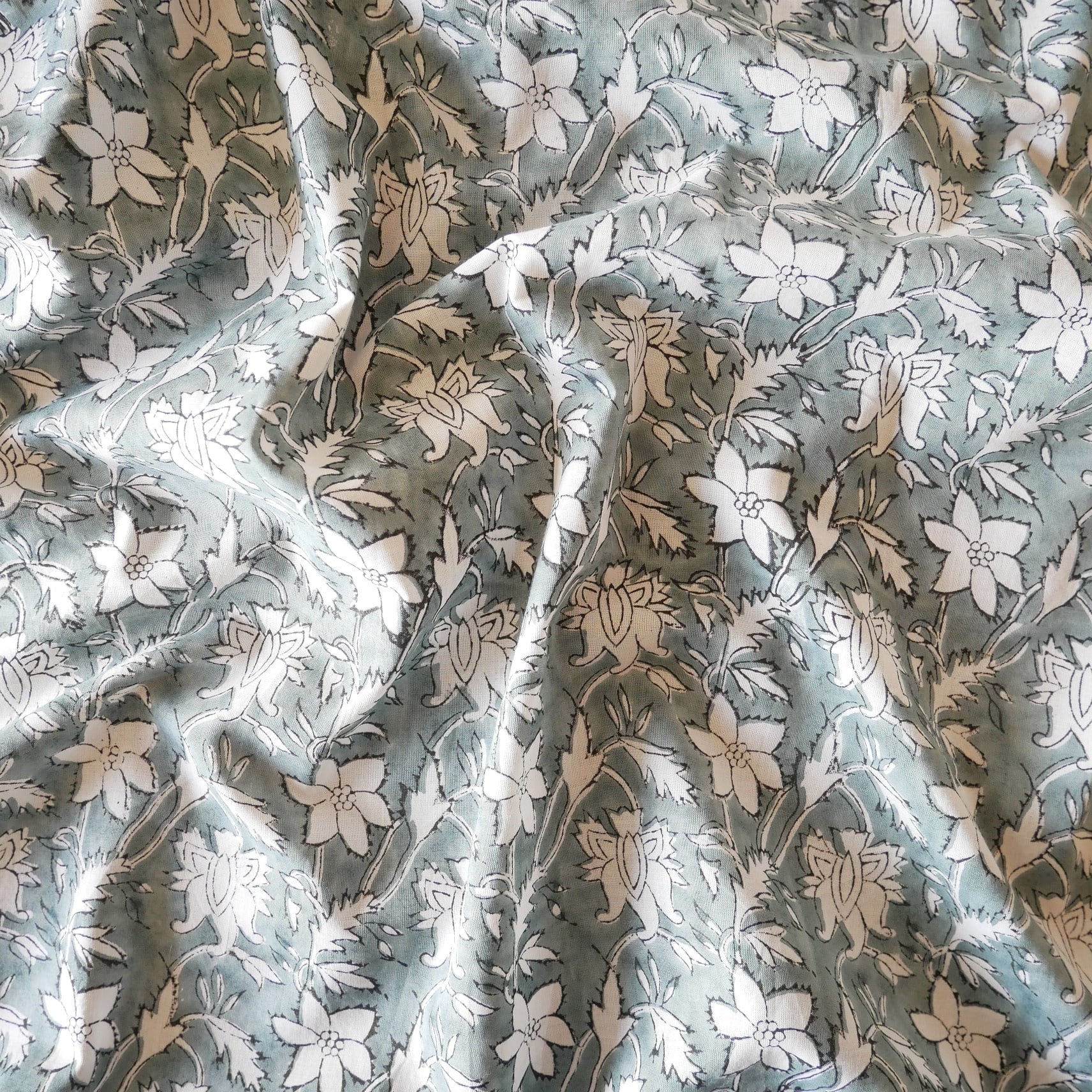 ハンドブロックプリント生地 インド更紗 綿生地 グレーベース×白抜きボタニカル柄 薄手コットン JE-260105
