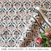 ハンドブロックプリント生地 インド更紗 綿生地 ホワイトベース×ブラック&ベージュ フラワーフレーム柄 片耳ボーダー 薄手コットン JE-260108