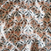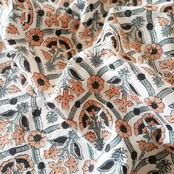 ホワイトベースに、花模様をフレームのように囲うデザインが連なる、どこか異国の雰囲気を感じさせるハンドブロックプリント生地です。