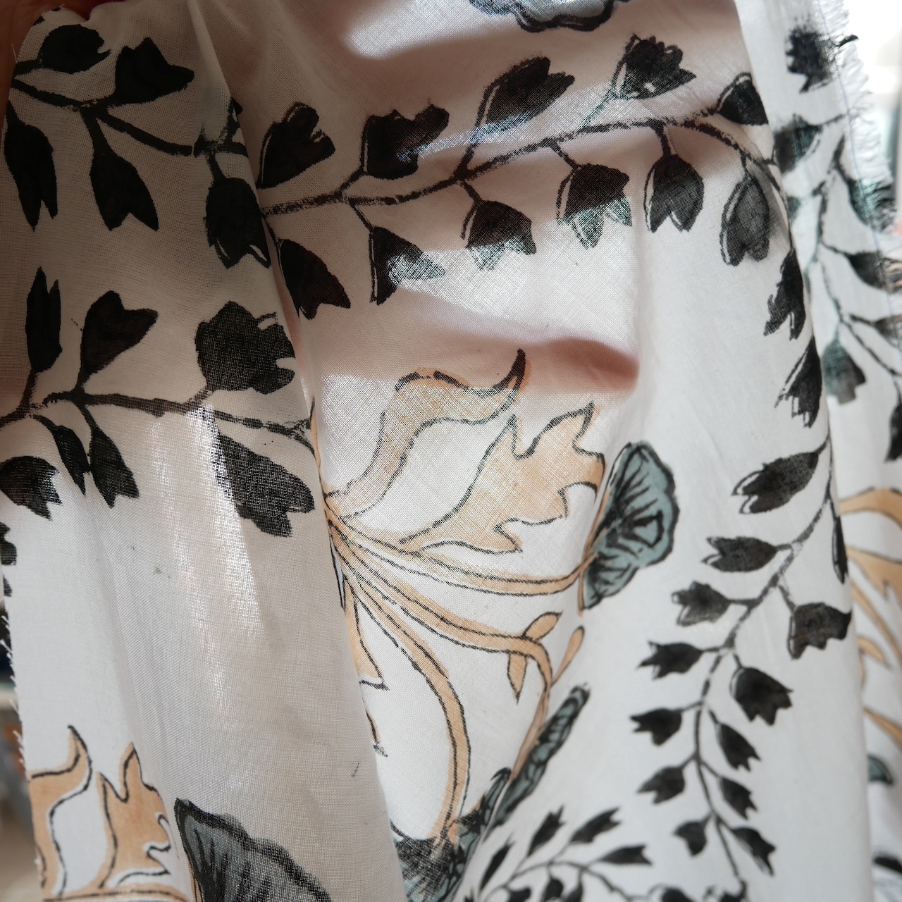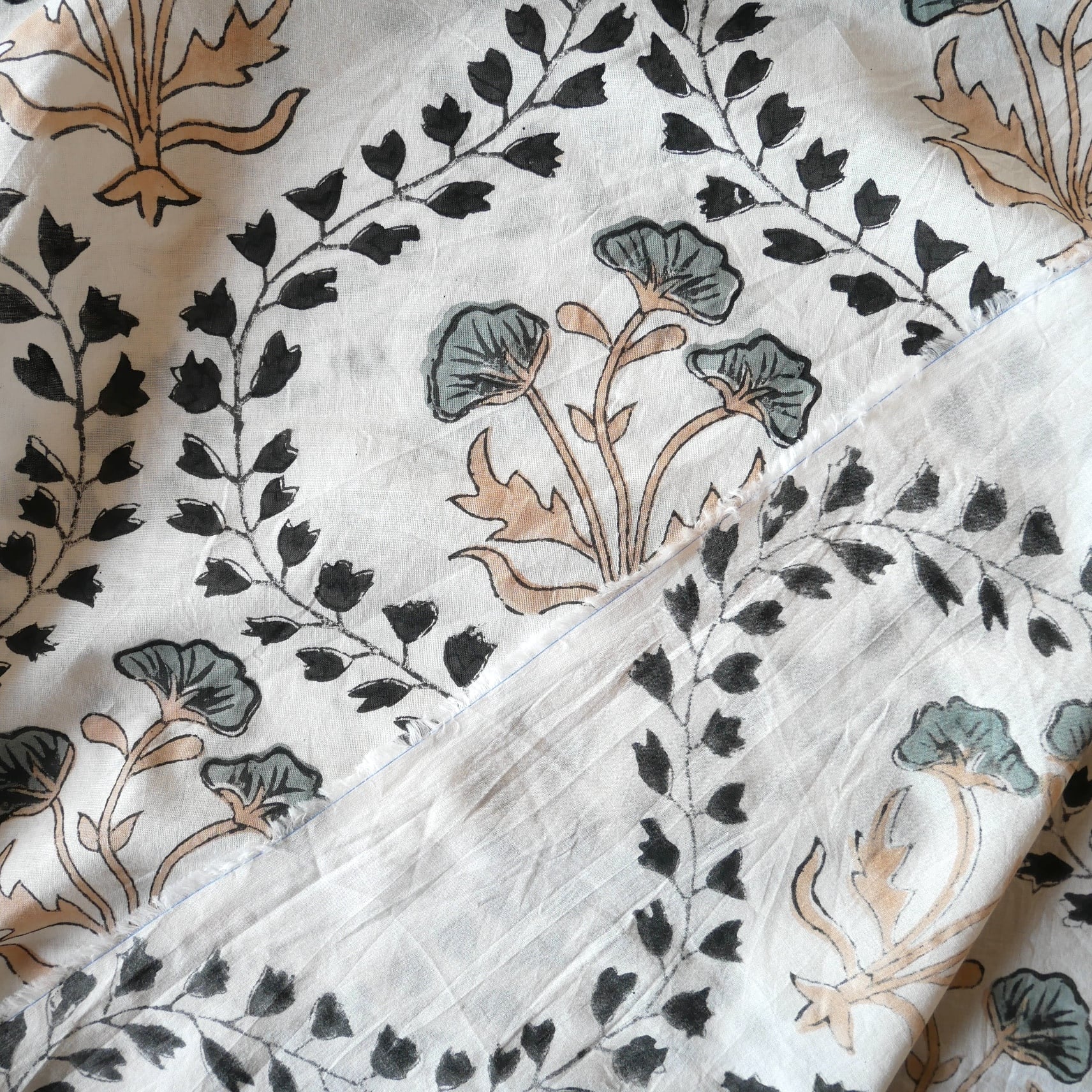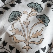 清潔感のあるホワイトベースに、大胆な大花模様と、リズムのあるボタニカルヴァイン柄が印象的に広がるハンドブロックプリント生地です。