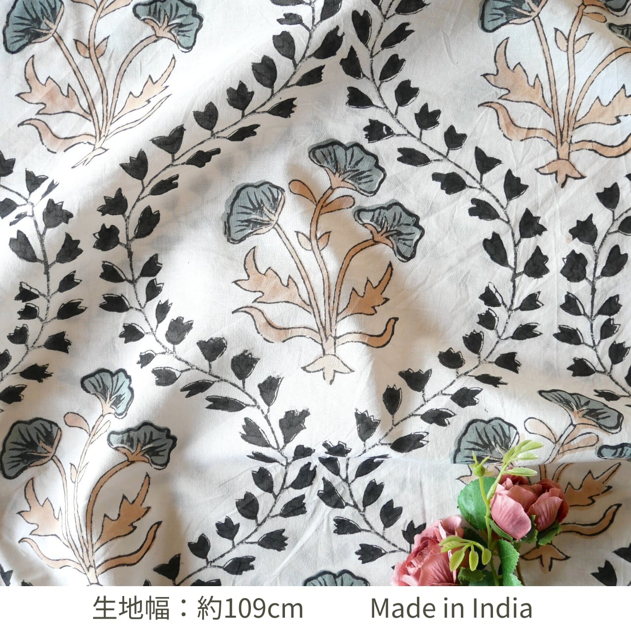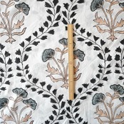 ハンドブロックプリント生地 インド更紗 綿生地 ホワイトベース×ブラック&ベージュ 大花×ボタニカルヴァイン柄 薄手コットン JE-260109