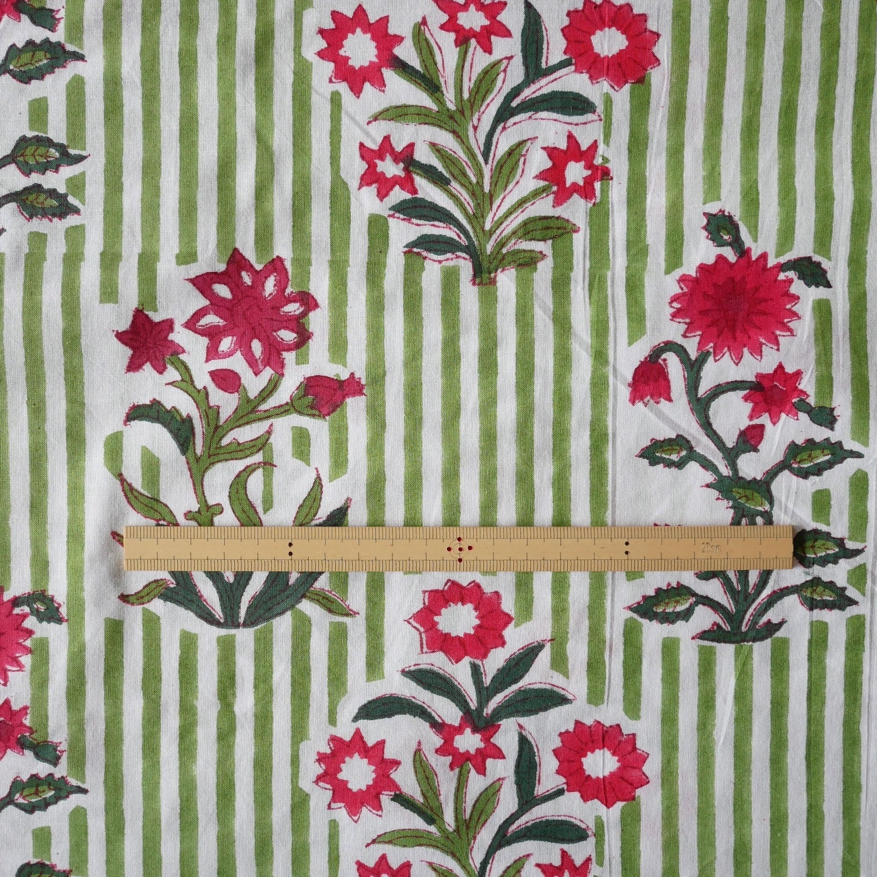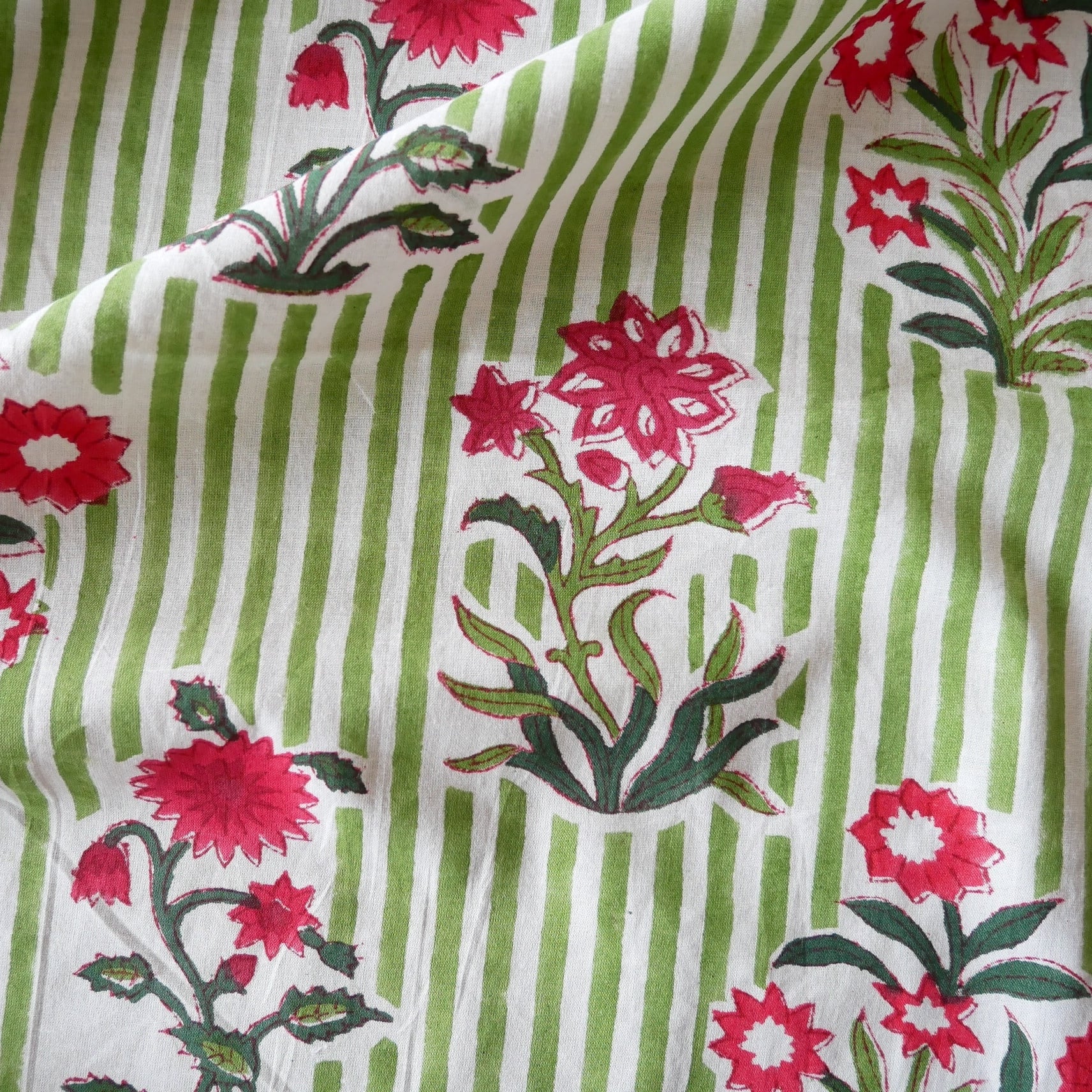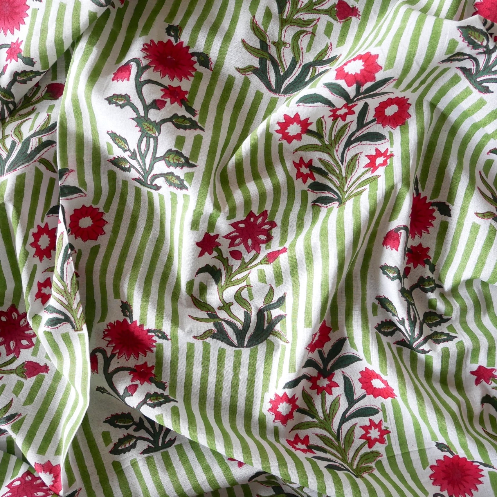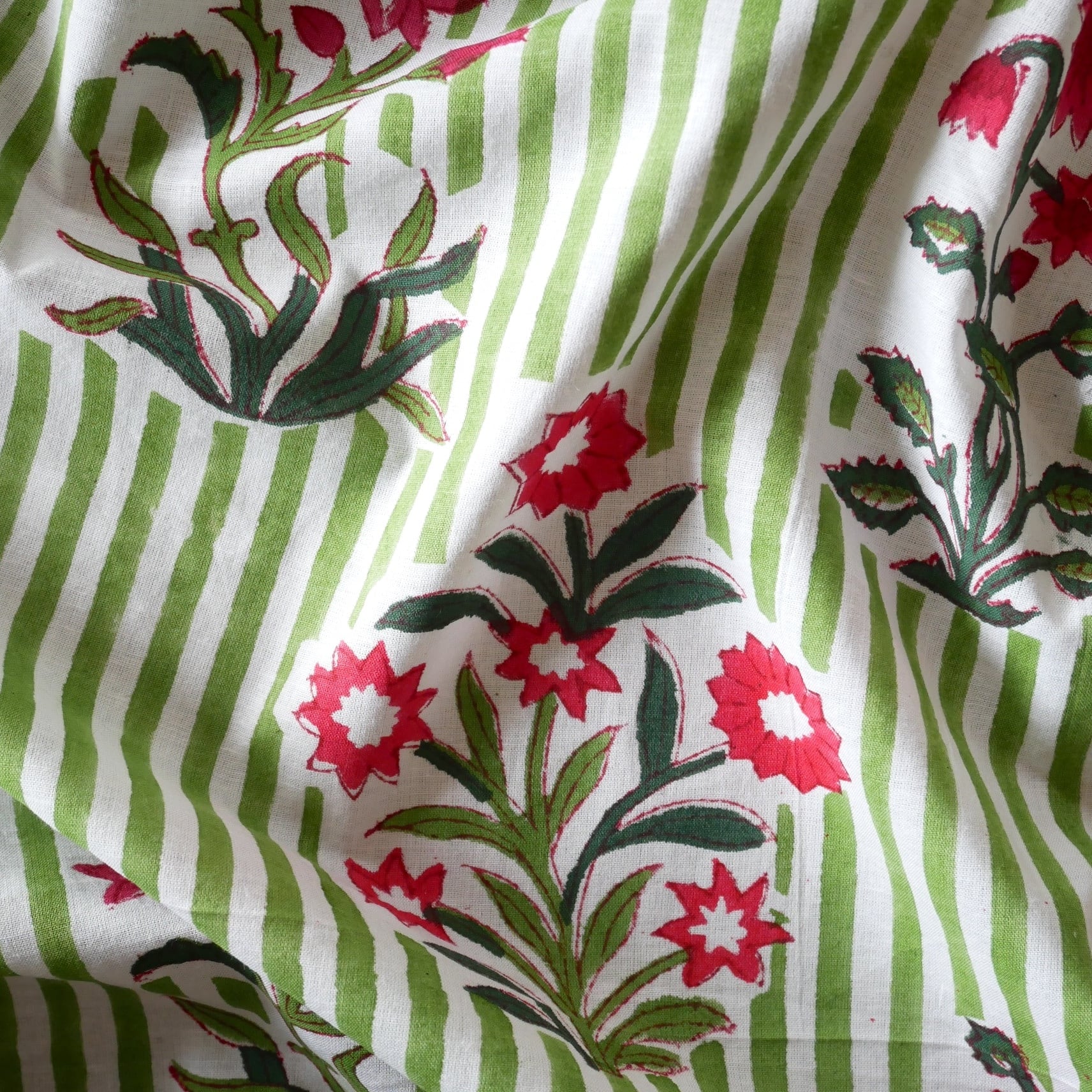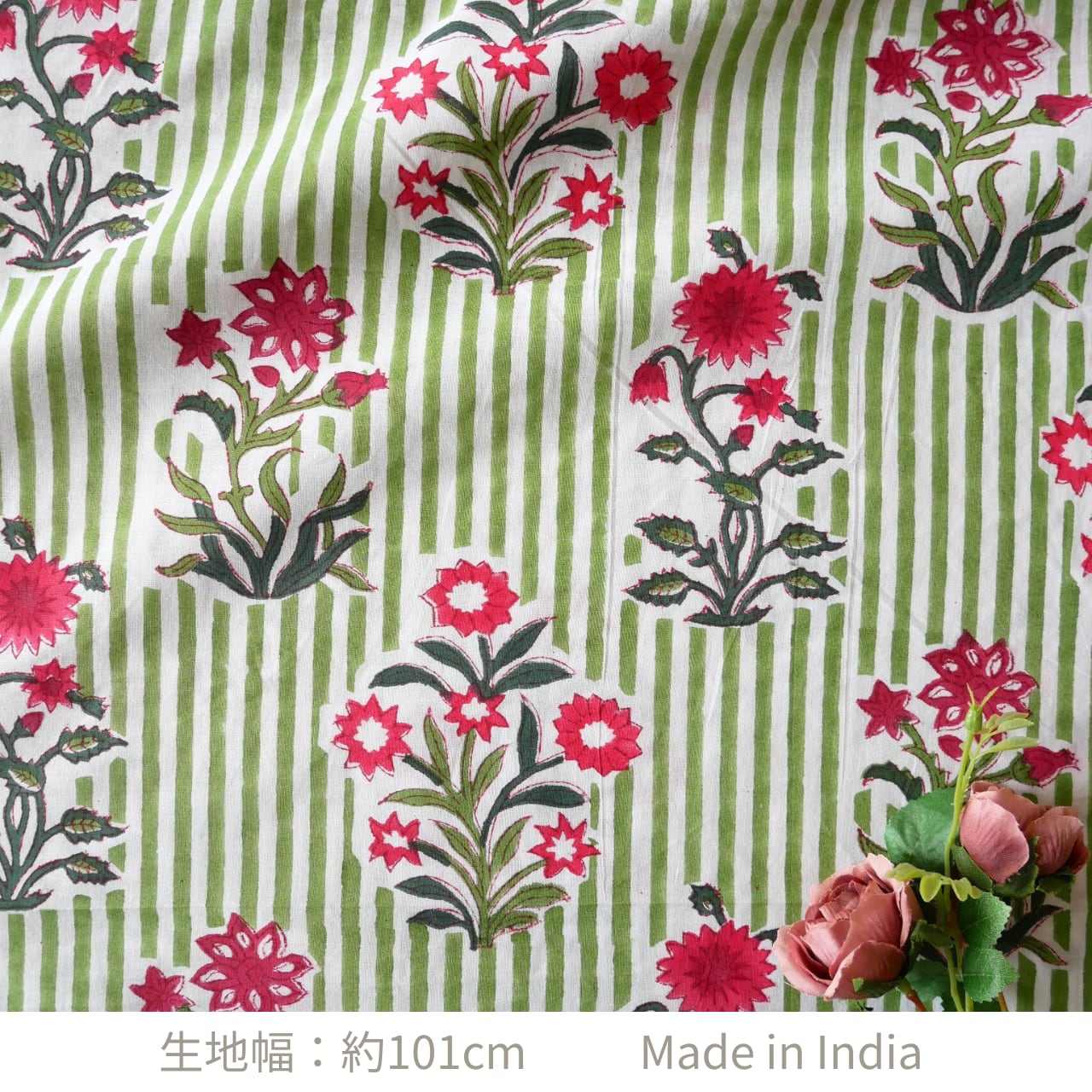 爽やかなグリーンのストライプを背景に、赤の大きめフラワーモチーフがリズミカルに咲き並ぶ、インドのハンドブロックプリント生地です。