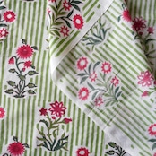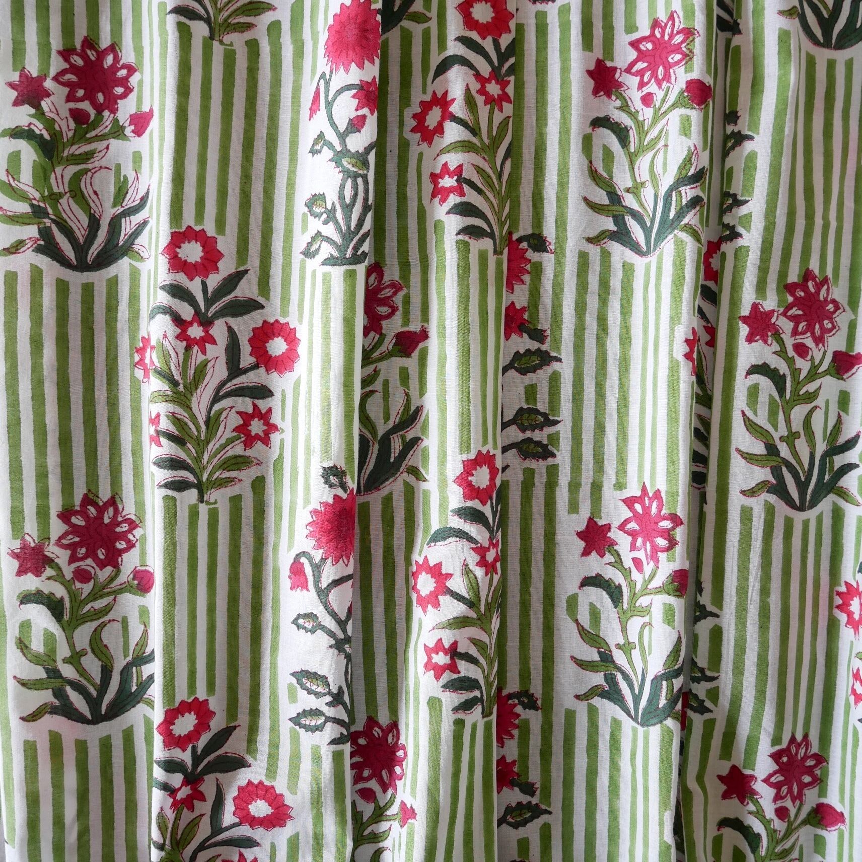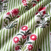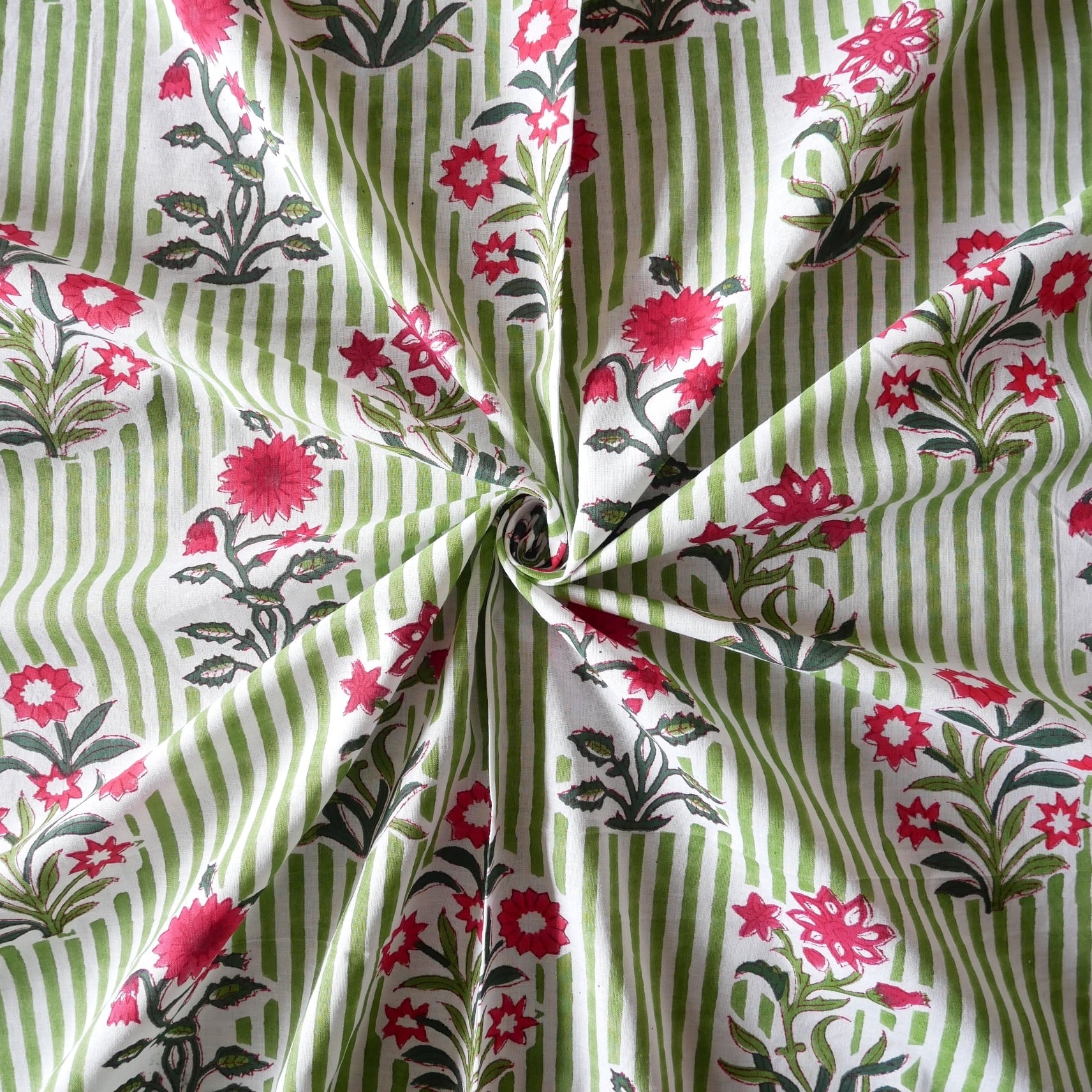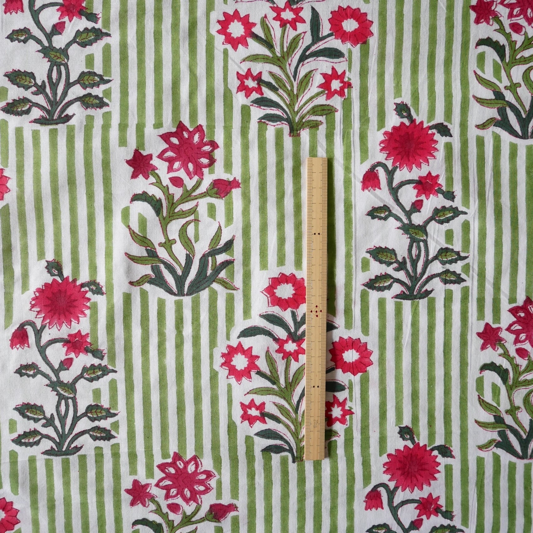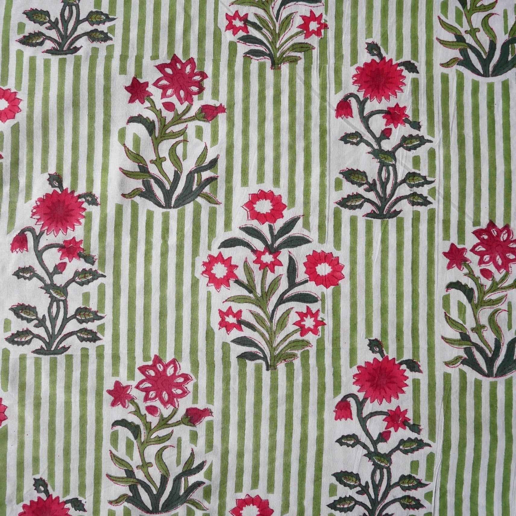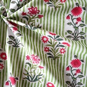爽やかなグリーンのストライプを背景に、赤の大きめフラワーモチーフがリズミカルに咲き並ぶ、インドのハンドブロックプリント生地です。