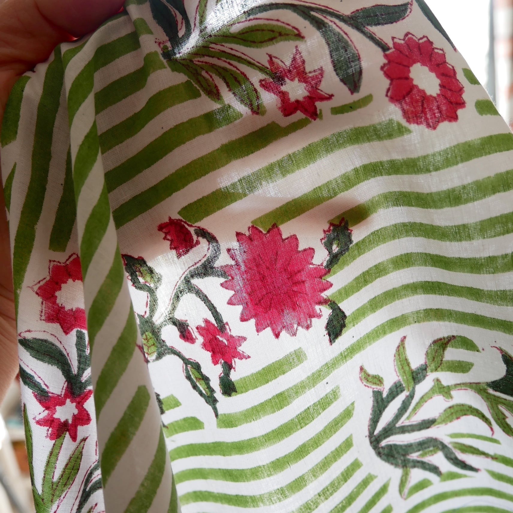 ◾️爽やかなグリーンストライプに、赤い花が咲き誇る。どこか懐かしく、心が弾むレトロフラワー。インドのハンドブロックプリント生地
